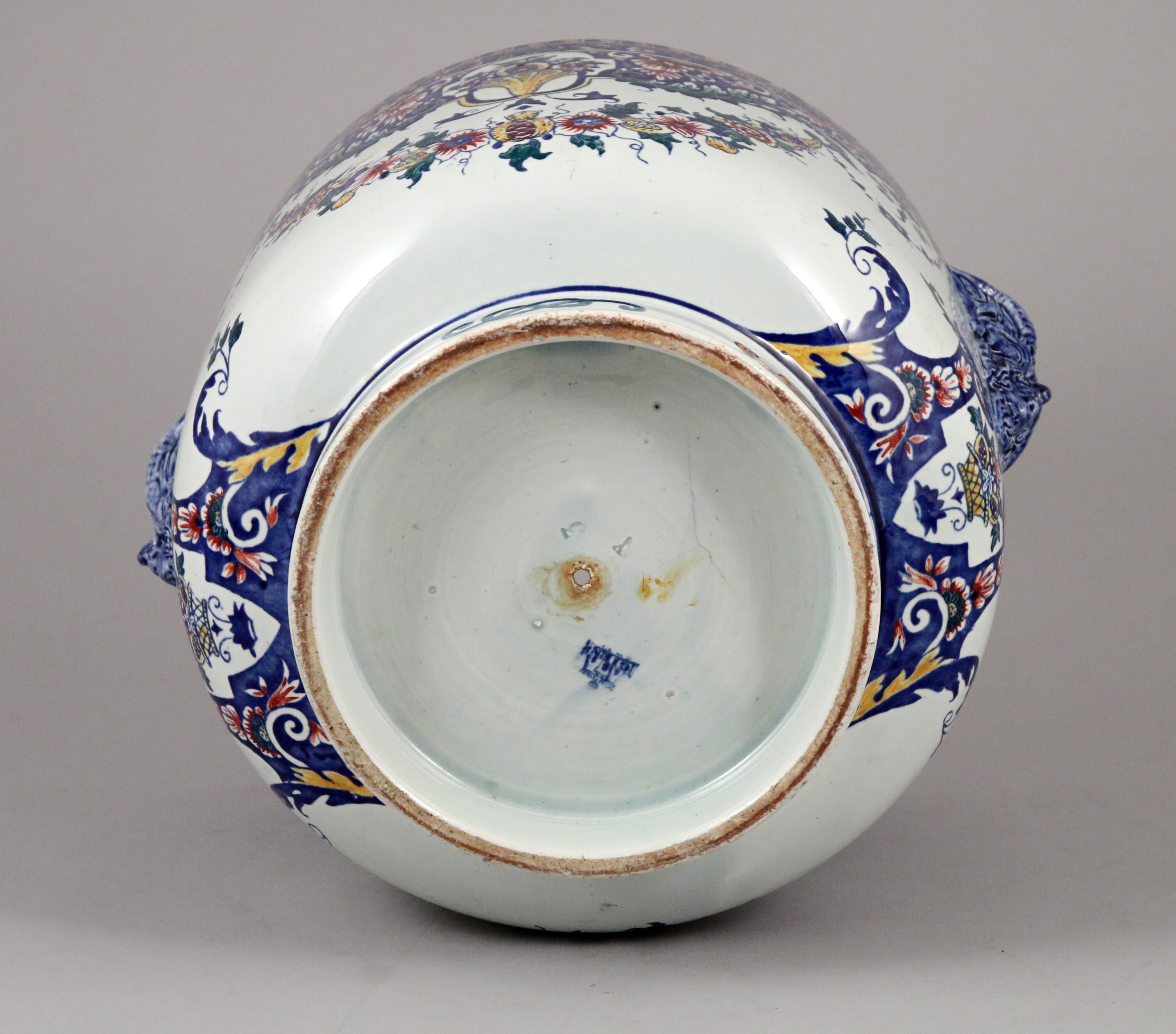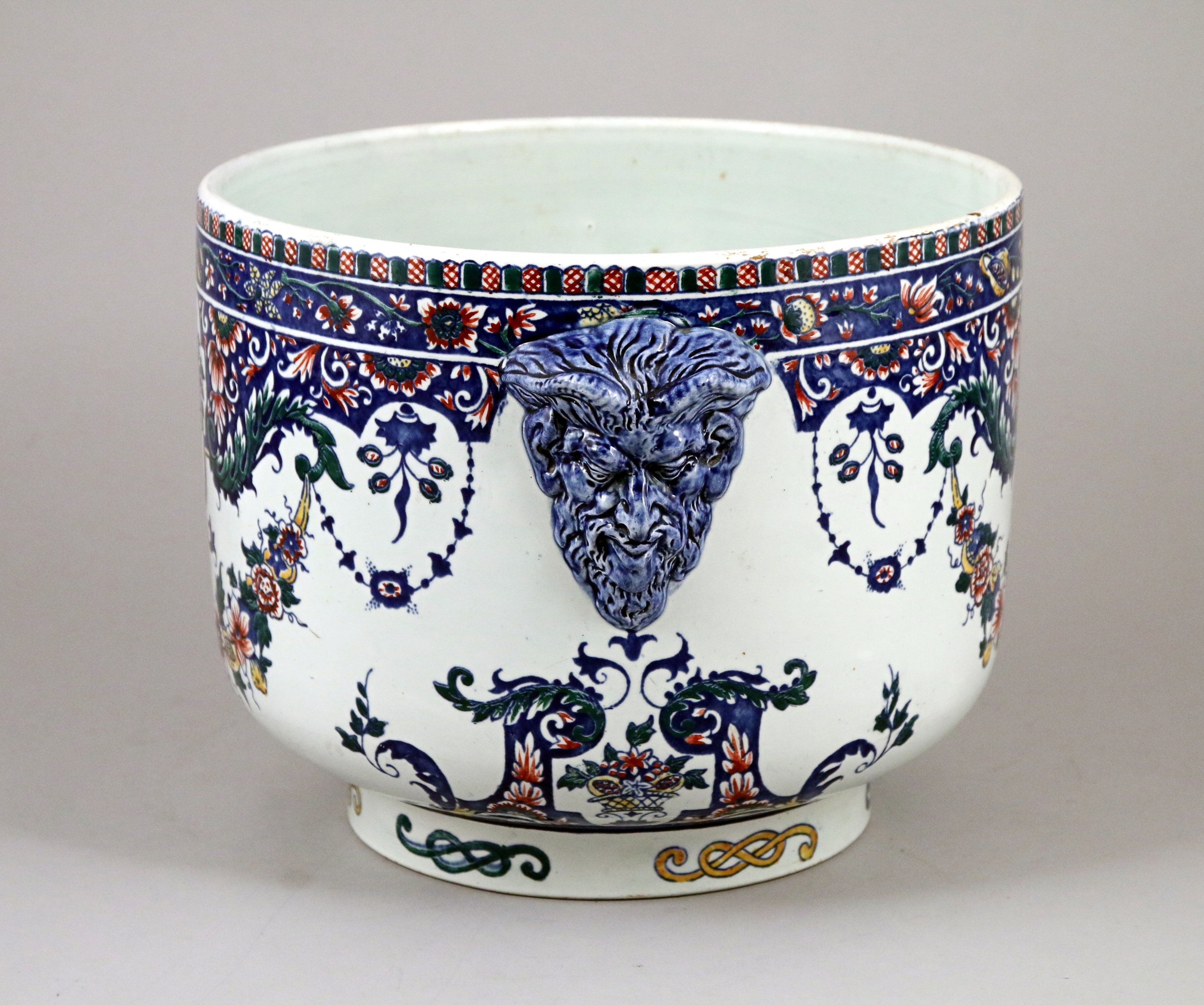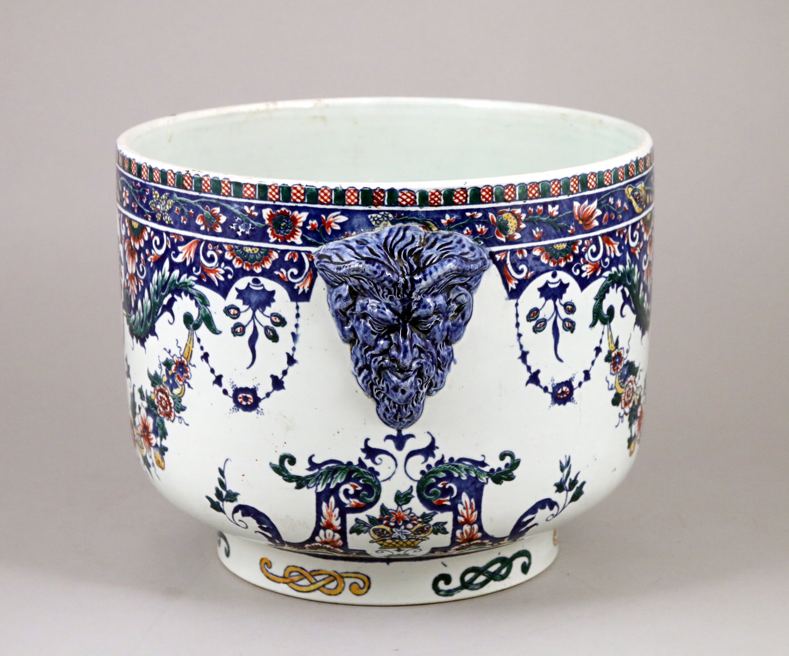 en céramique émaillée à décor de lambrequins et guirlandes de fleurs dans le genre de Rouen XVIIIe. Prise à têtes de satyres. Doublure en métal.