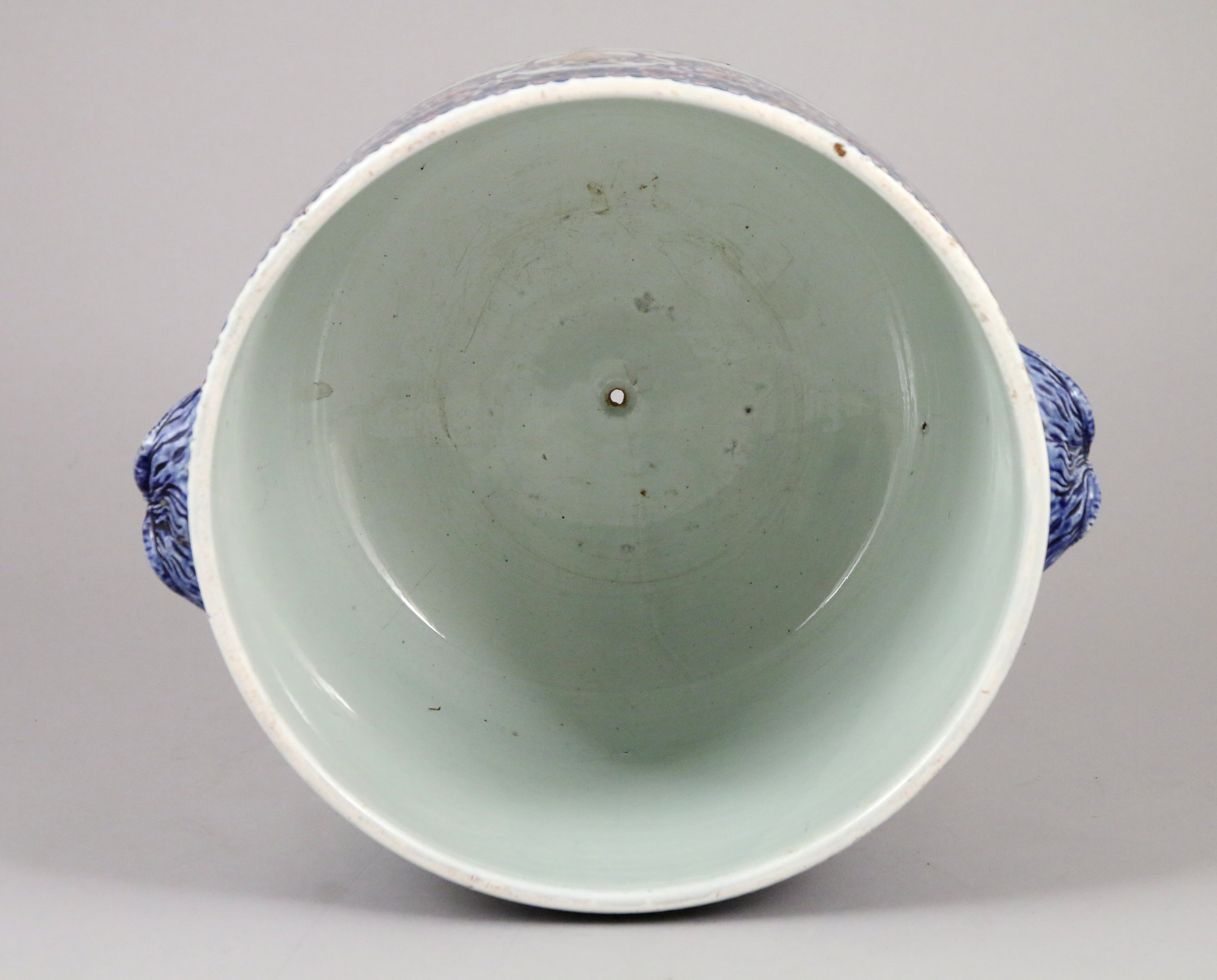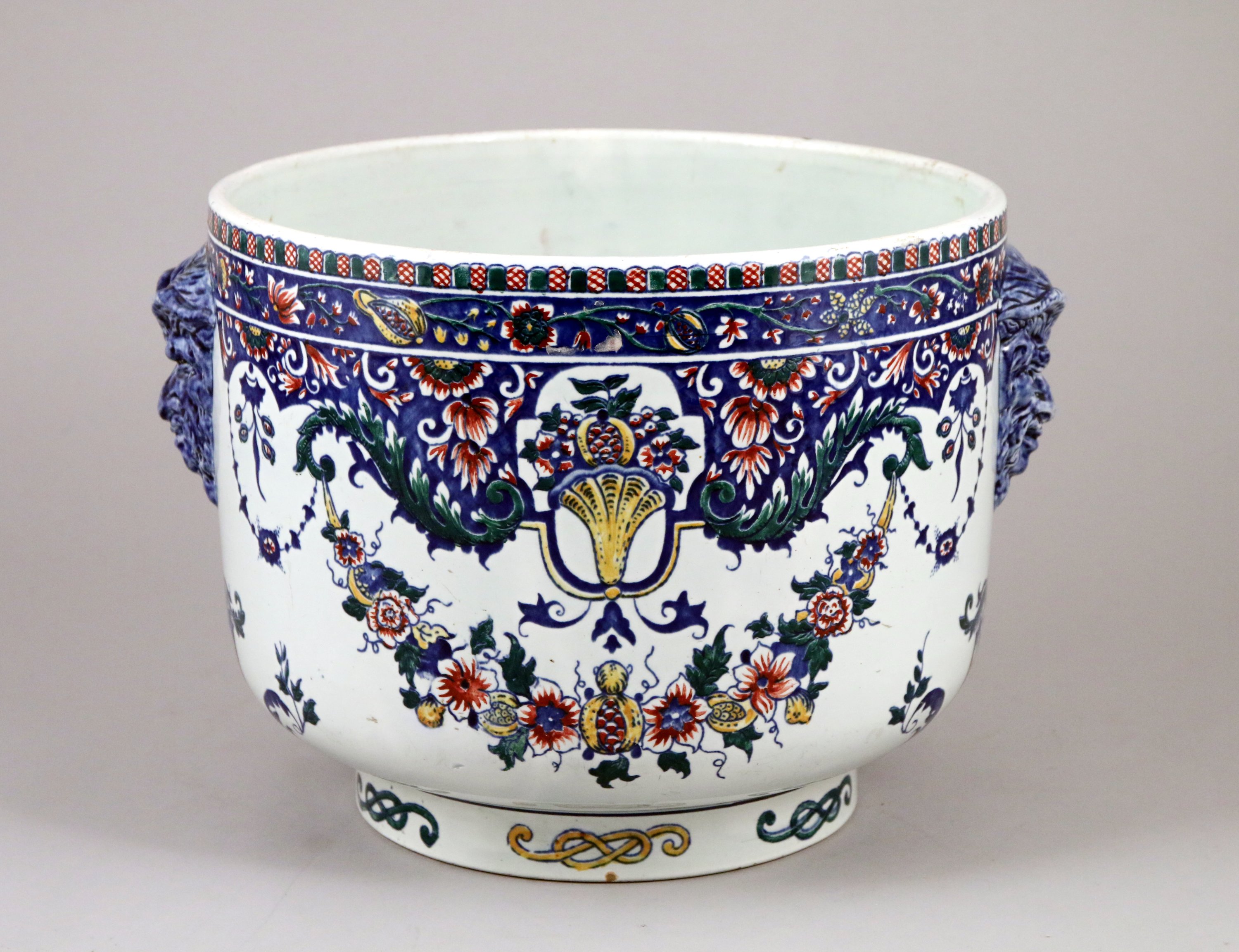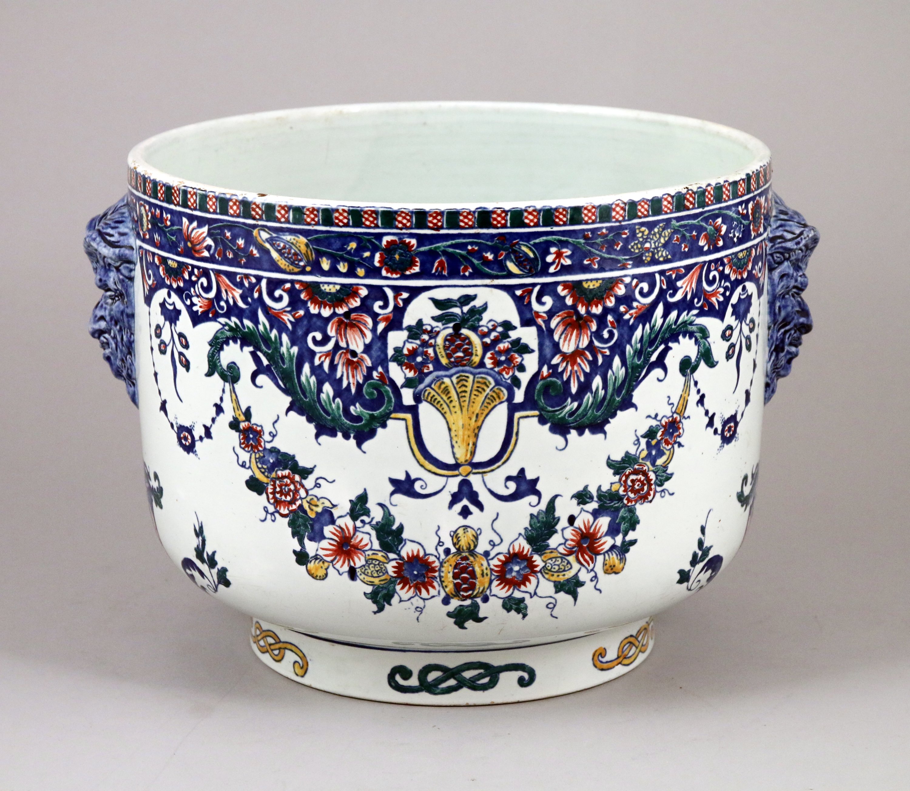 en céramique émaillée à décor de lambrequins et guirlandes de fleurs dans le genre de Rouen XVIIIe. Prise à têtes de satyres. Doublure en métal.