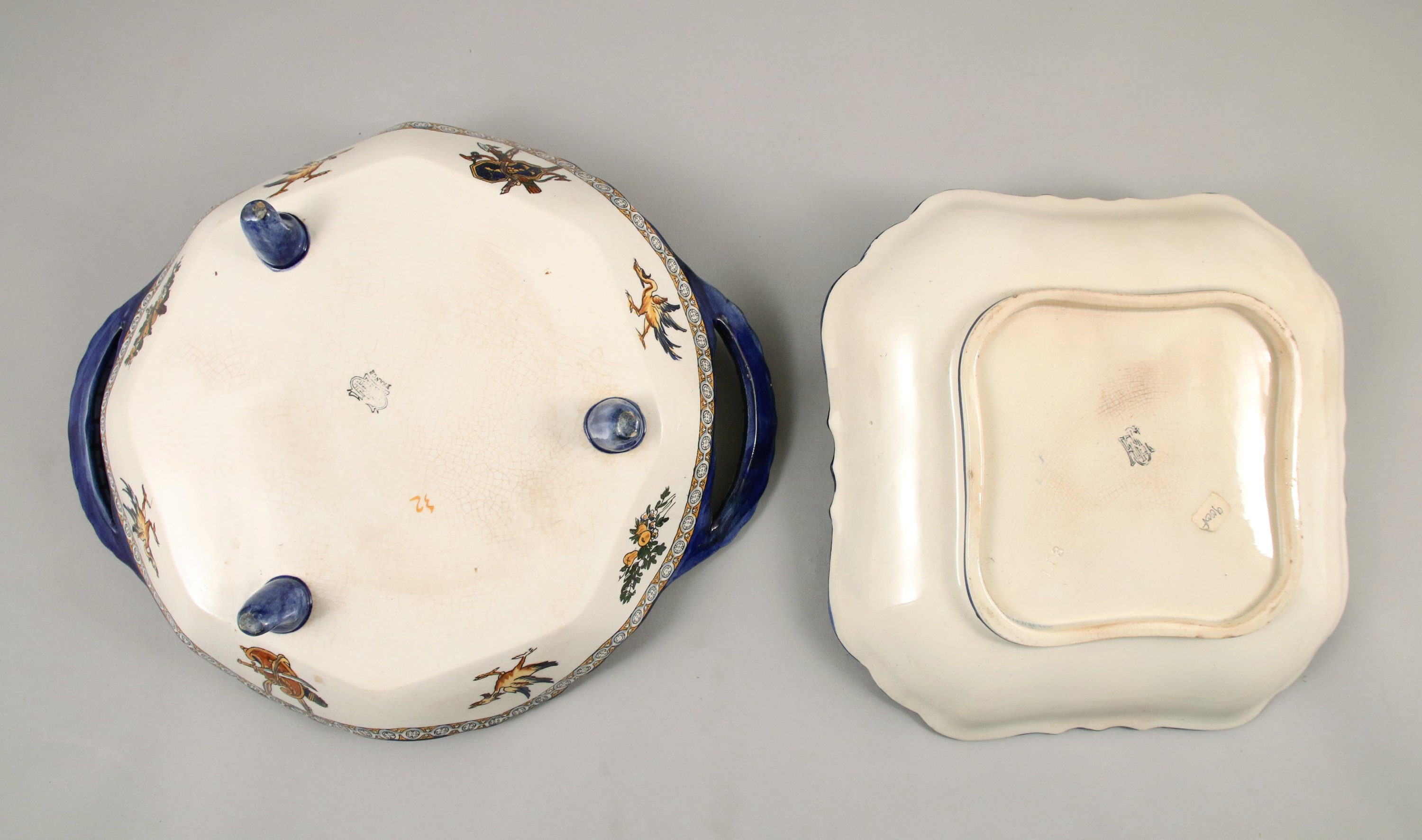 - JATTE carrée à décor de la Renaissance Italienne, de chimères et au centre d'un cartouche représentant une femme à sa toilette surmontée d'une couronne de marquis.
