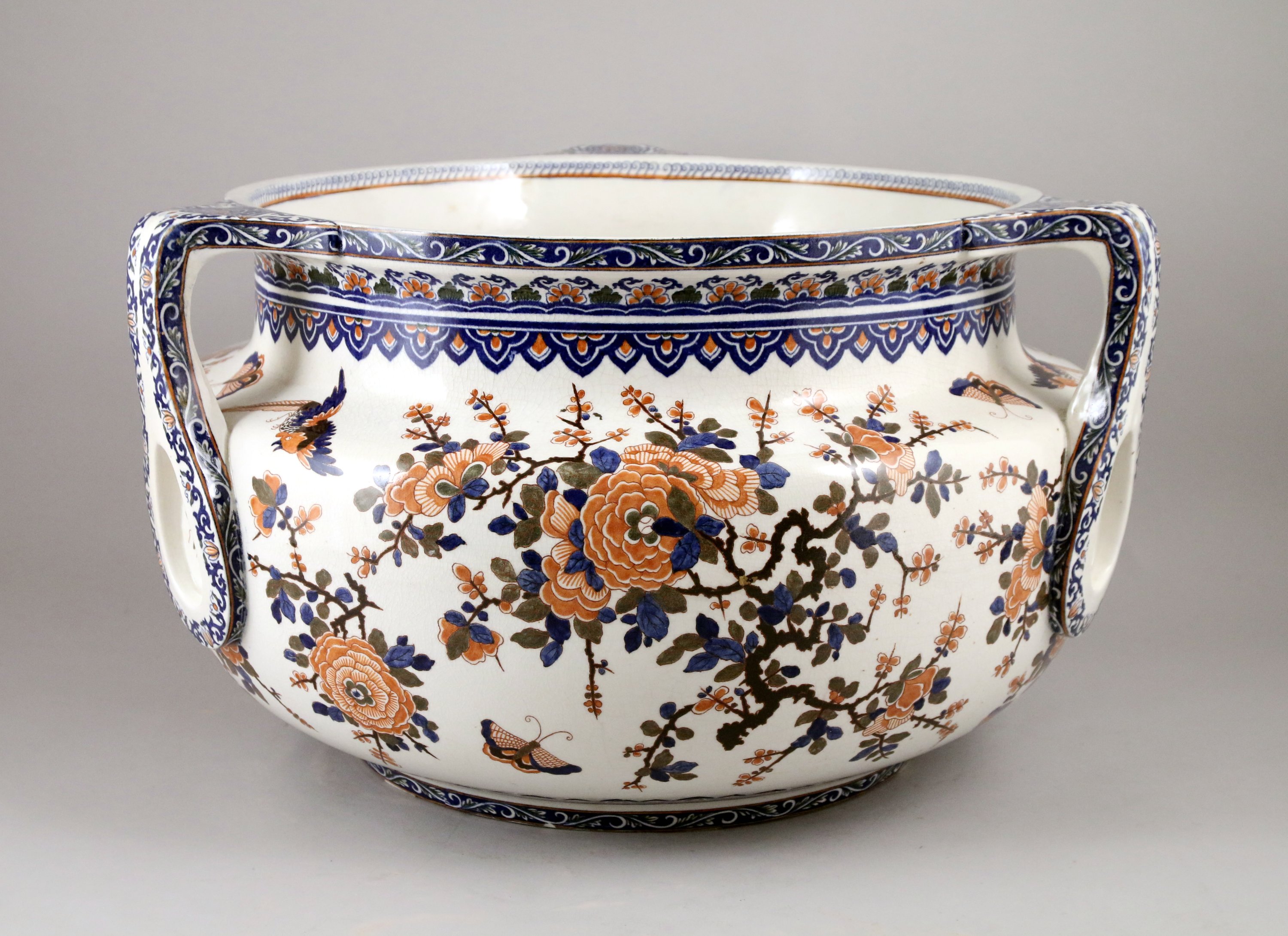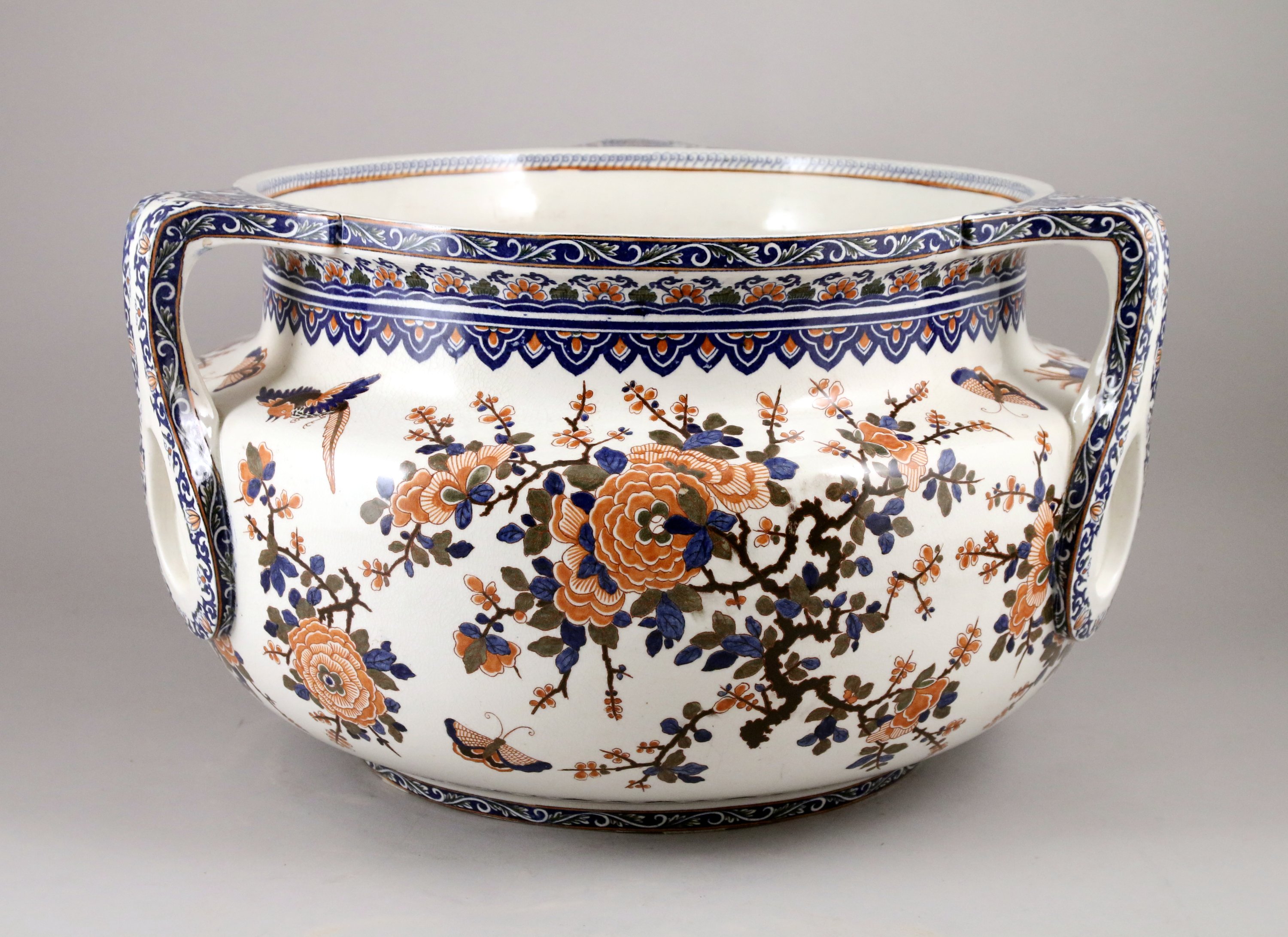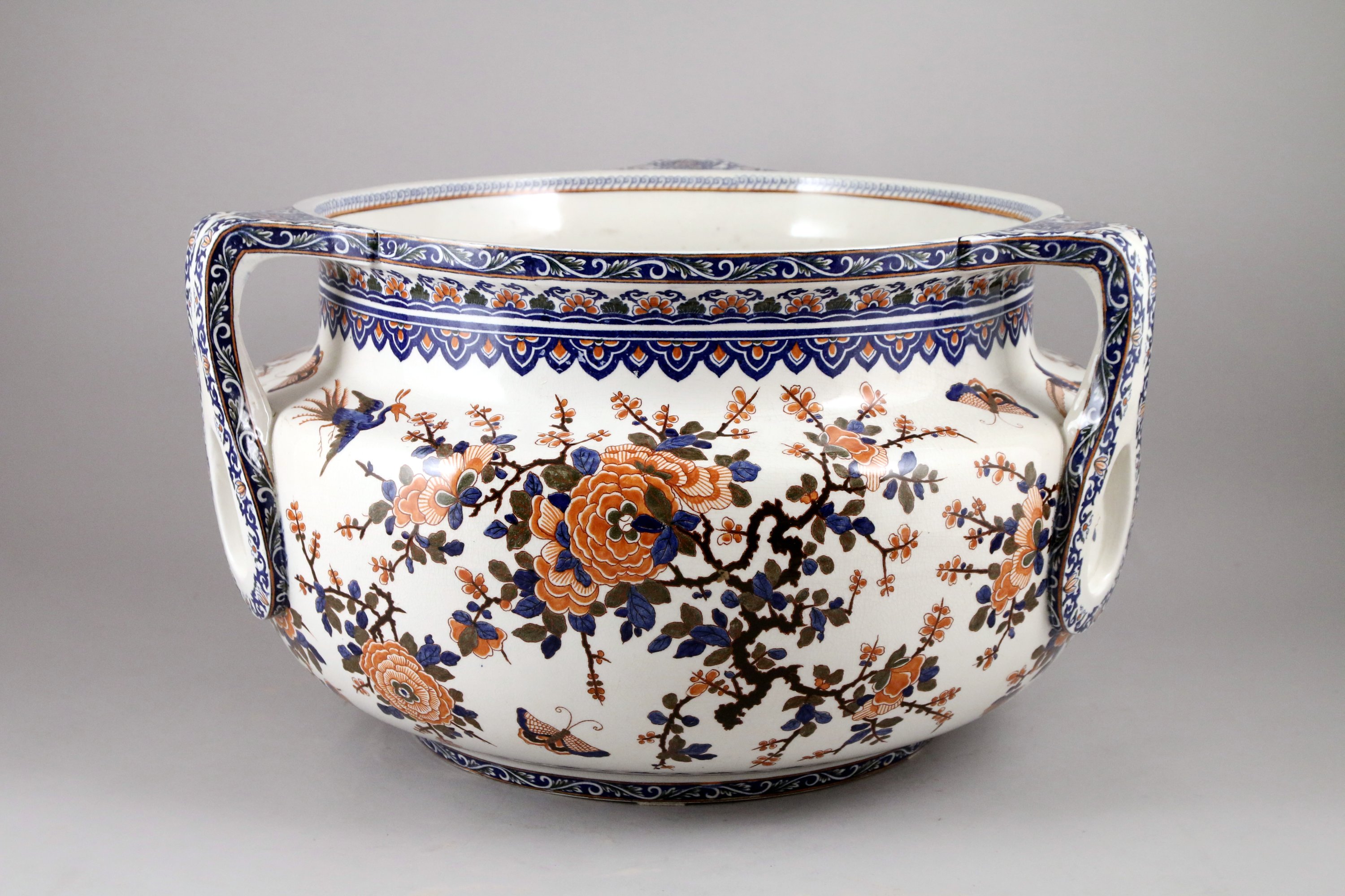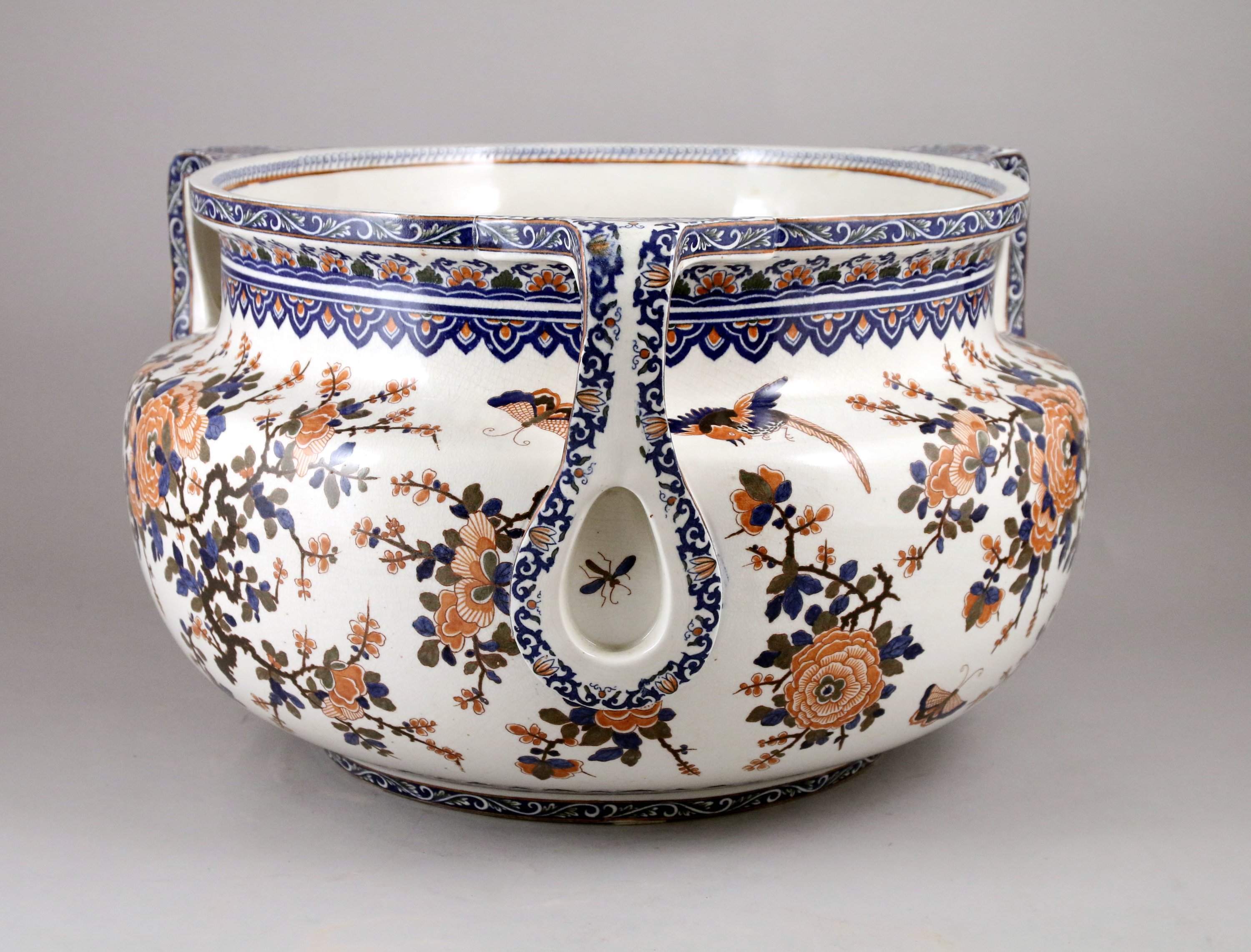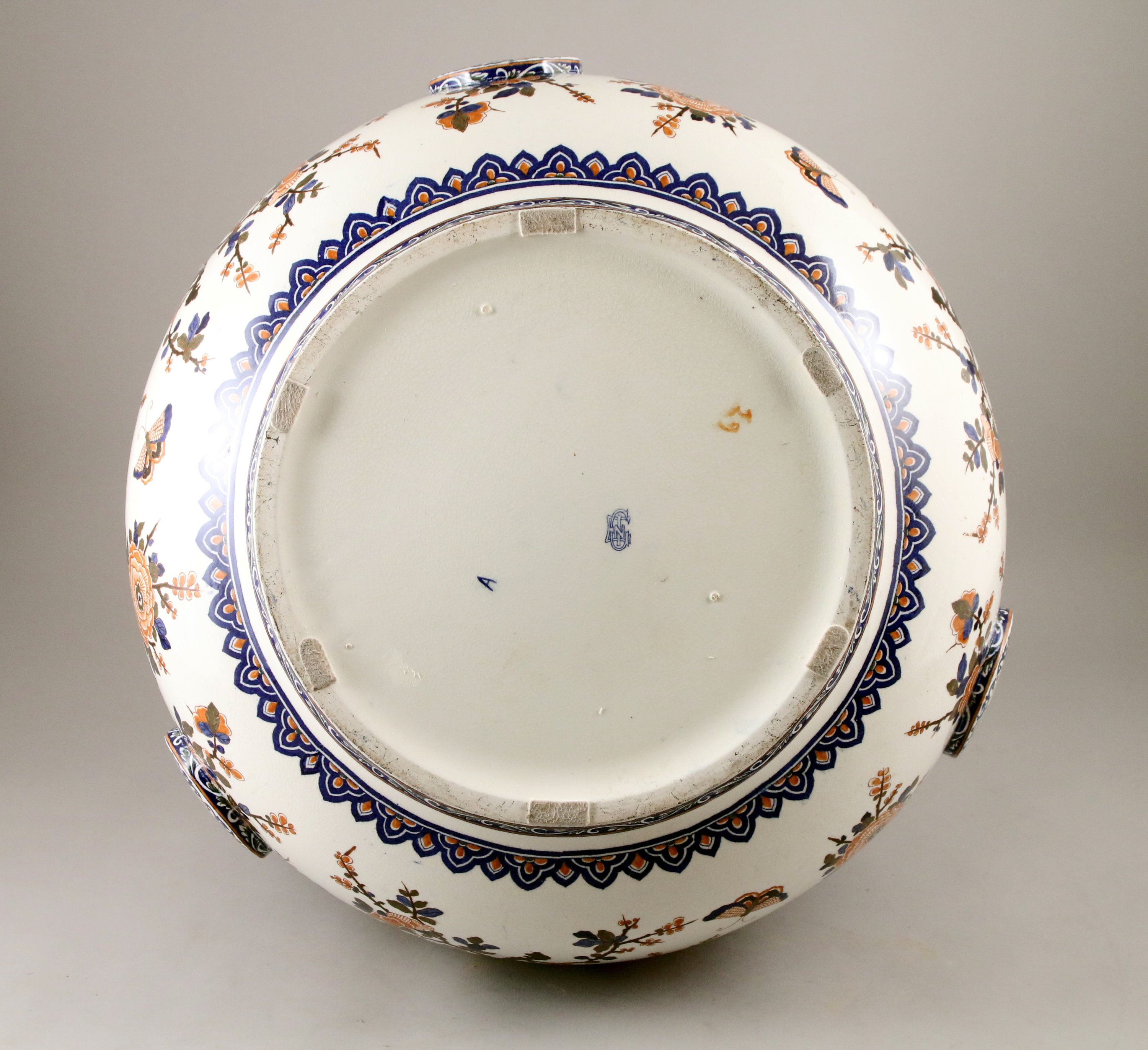 en céramique émaillée de forme circulaire à trois anses. Décor d'oiseaux, d'insectes et de fleurs dans le goût de Delft.