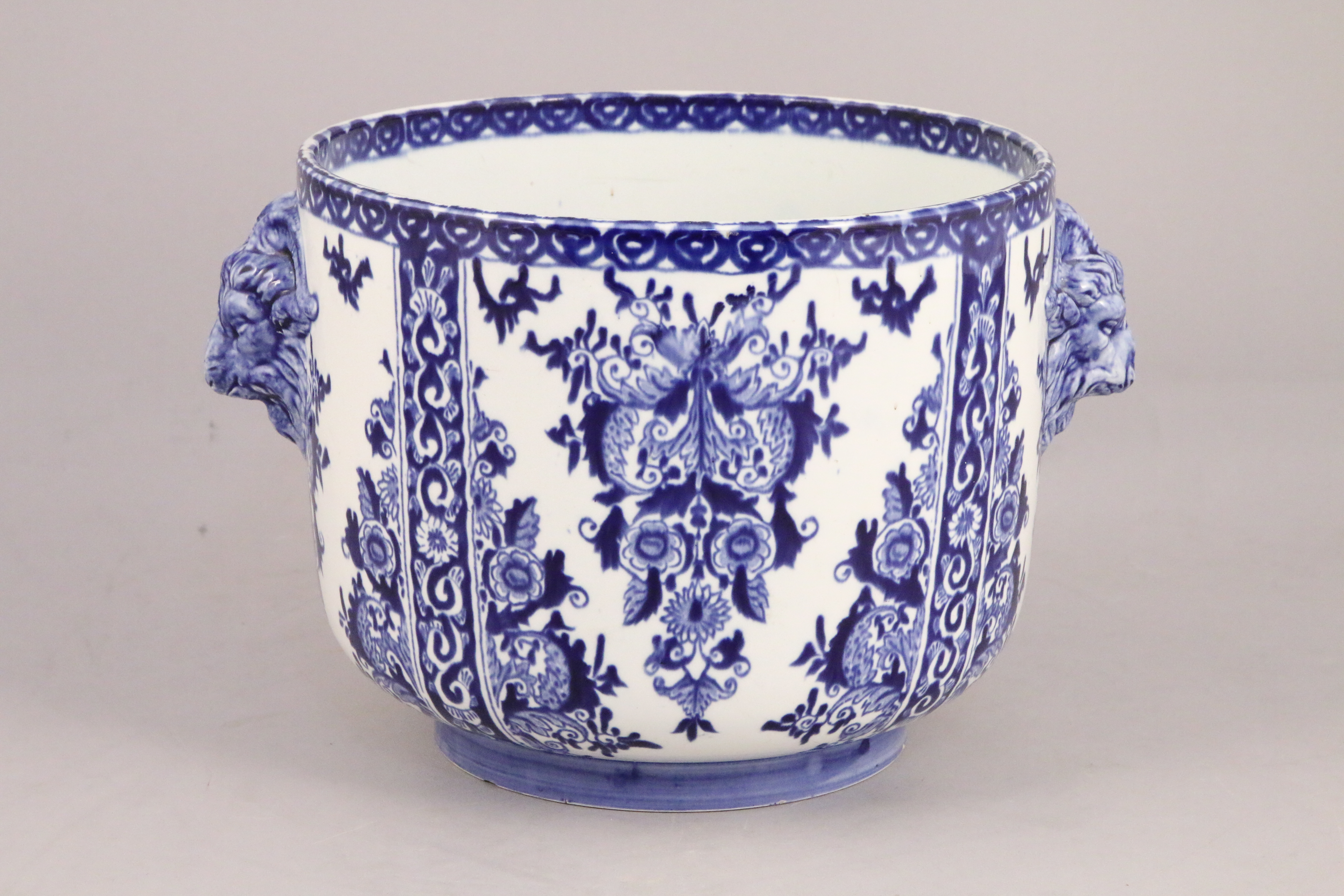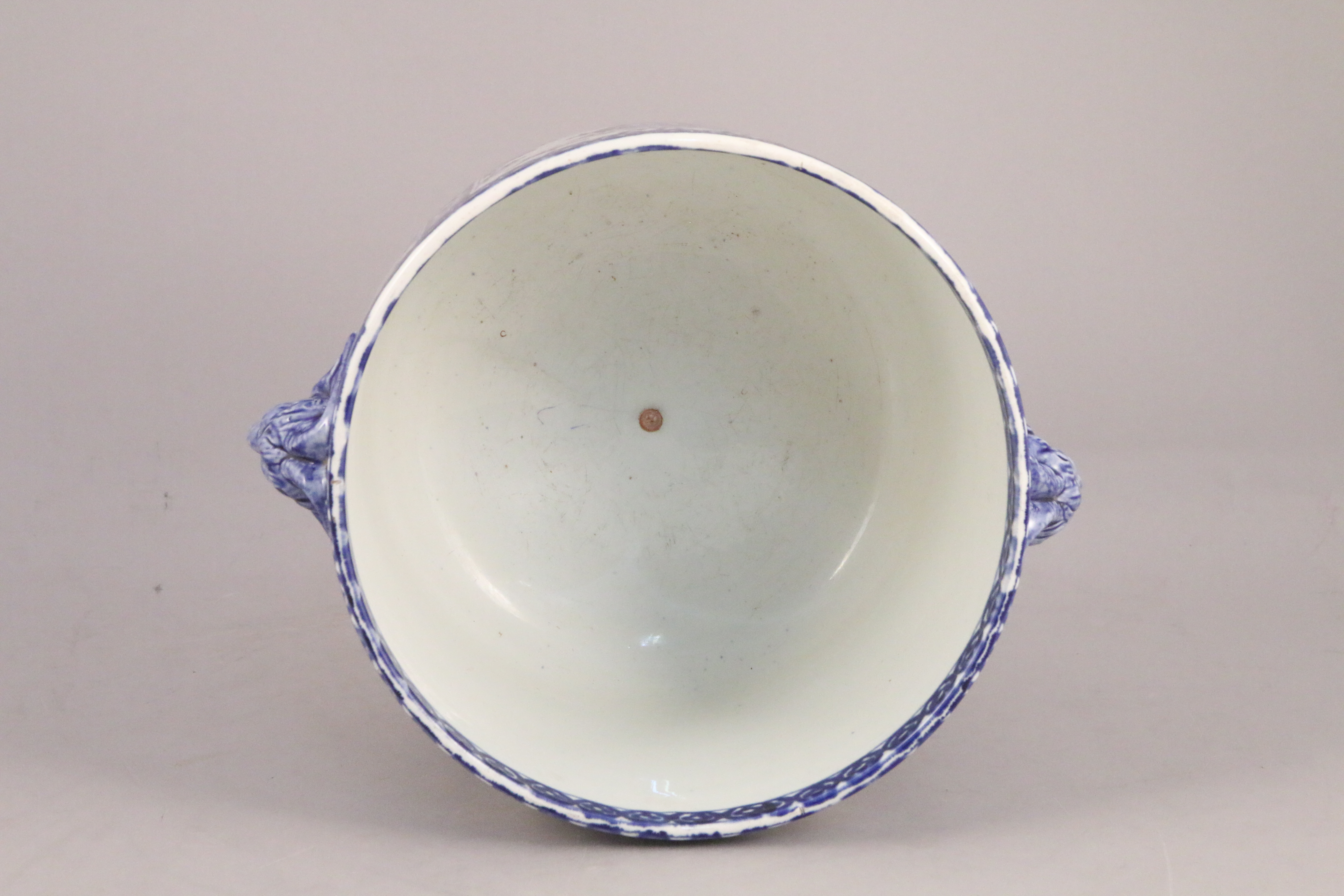 en céramique émaillée, au décor de bleu de Rouen, les prises à têtes de bélier.