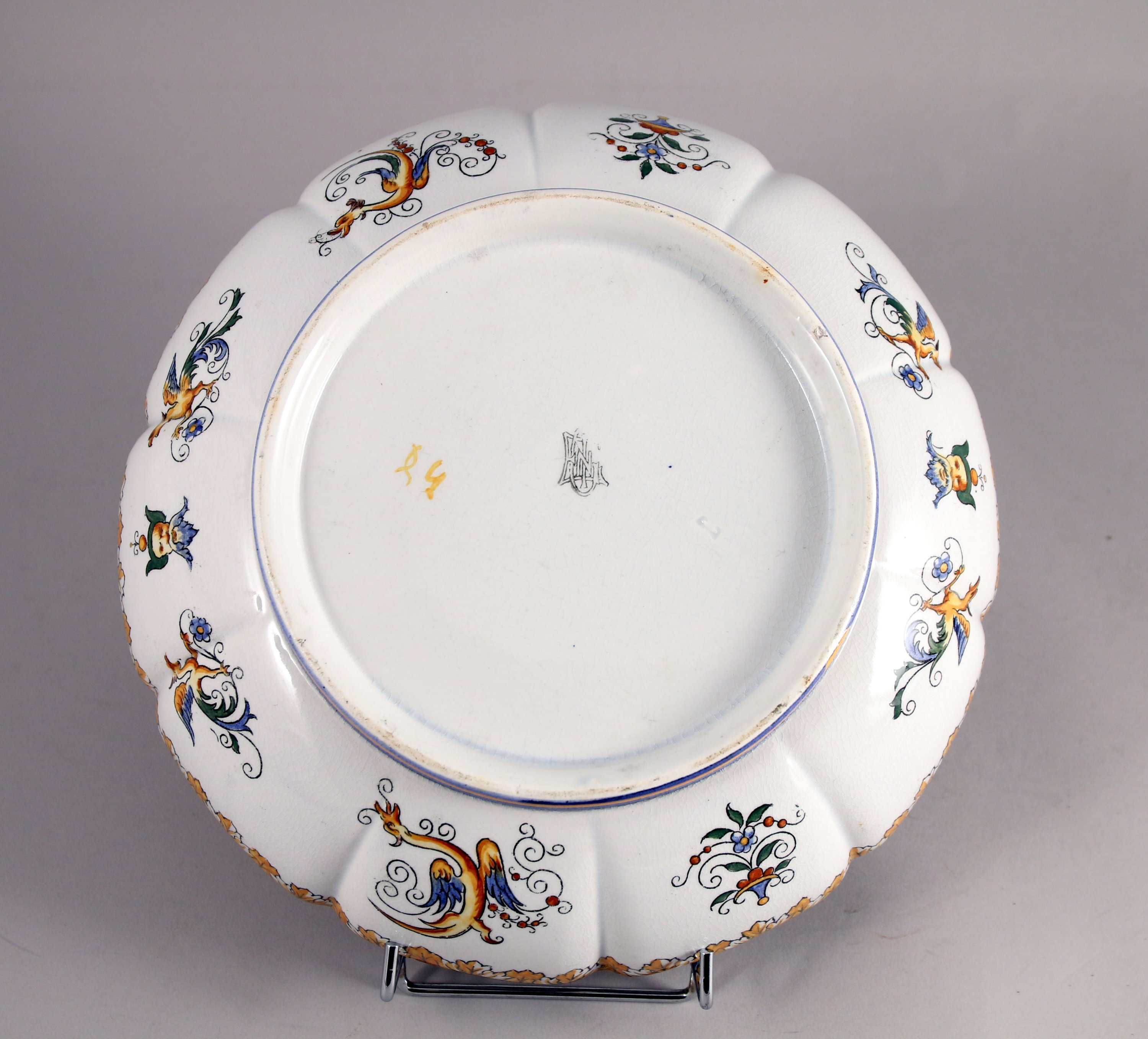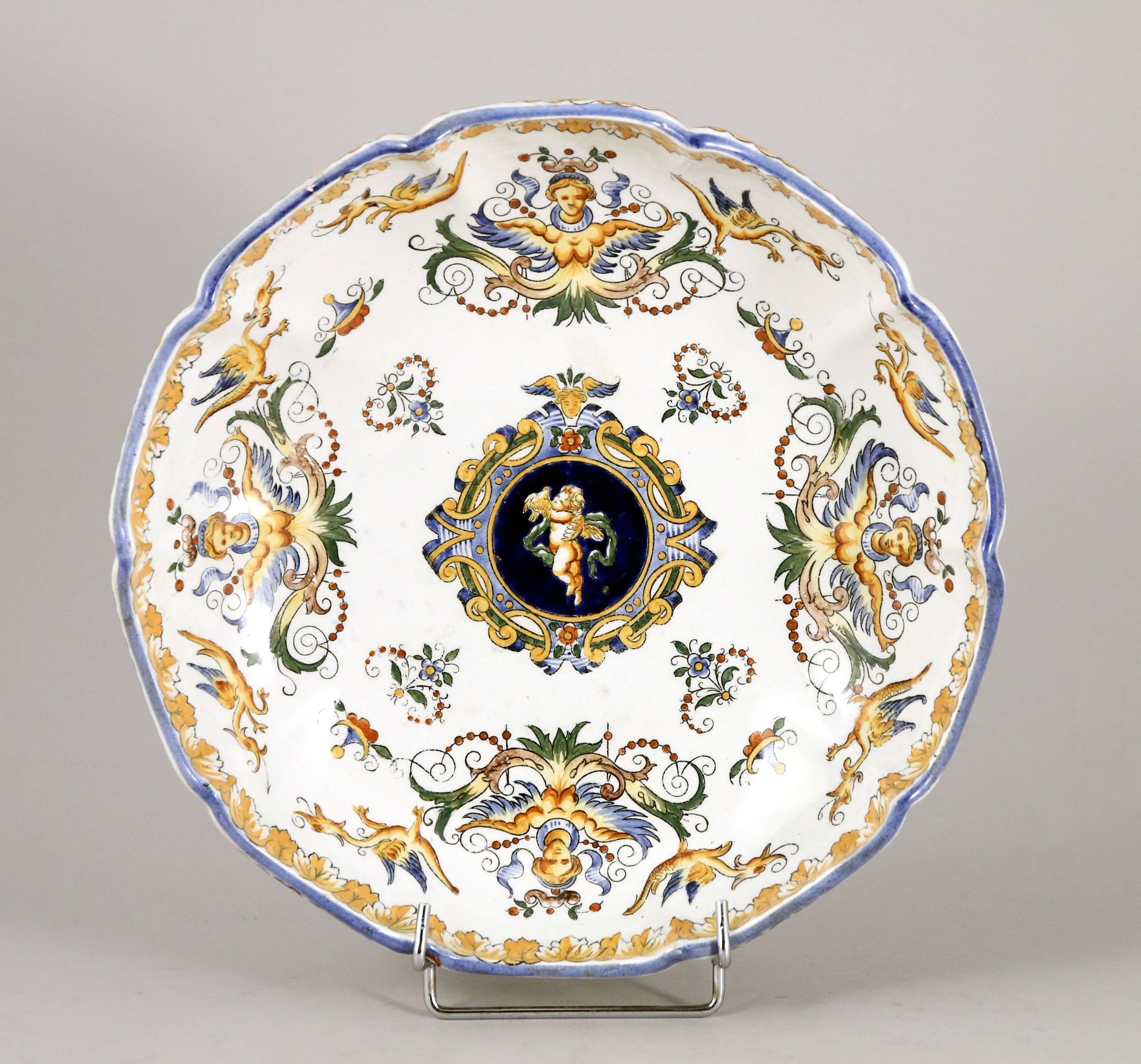 en faïence émaillée de forme polylobée à décor de la Renaissance Italienne sur fond blanc, au centre dans un cartouche sur fond bleu un amour tenant dans ses mains un oiseau.