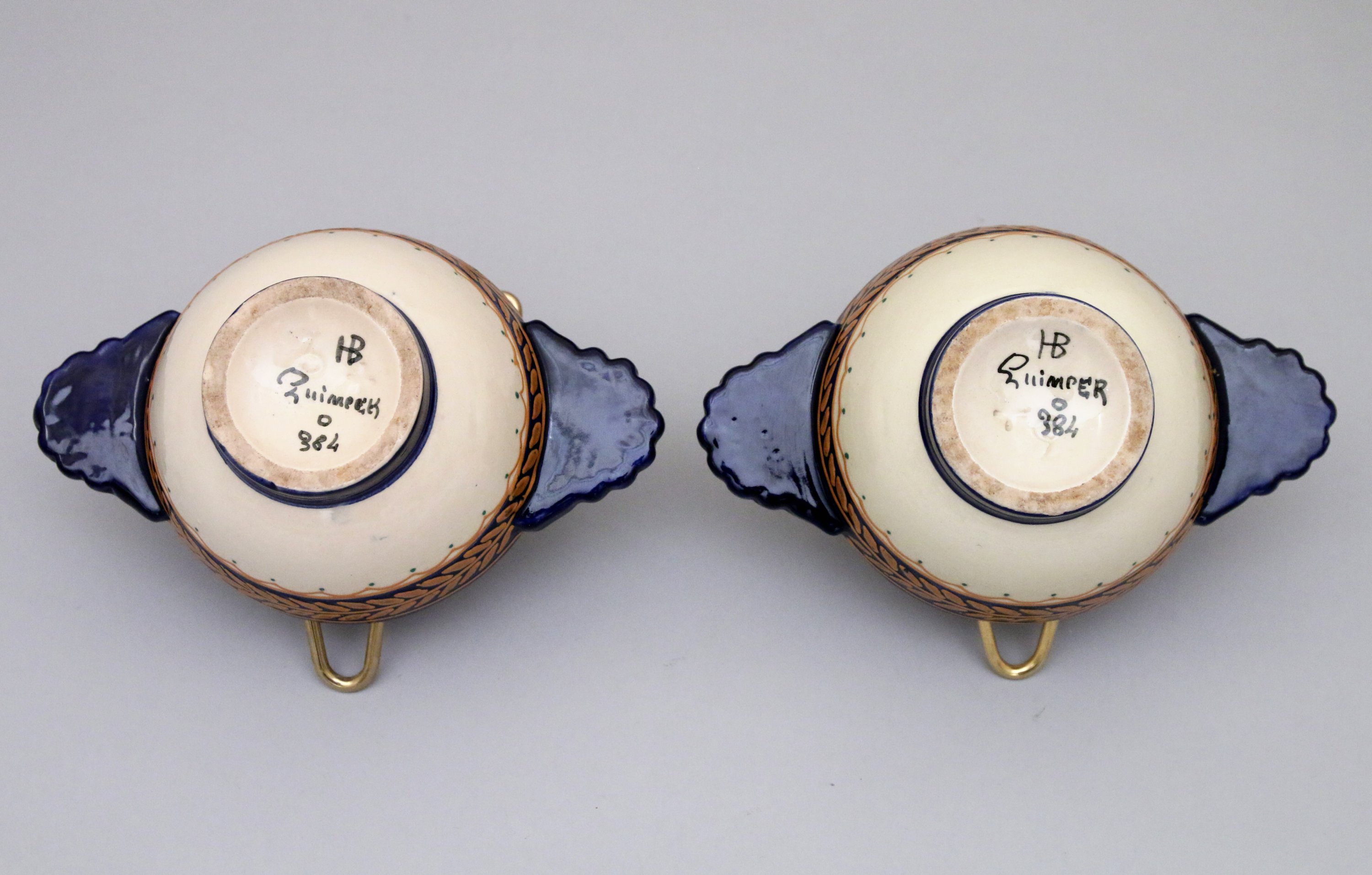 en faïence à oreilles en forme de coquilles bleues soulignées d'orange, la panse à décor d'une frise de feuille, le fond à décor d'un buste. L'un orné d'un breton coiffé d'un chapeau, l'autre à décor d'une bretonne fumant la pipe.