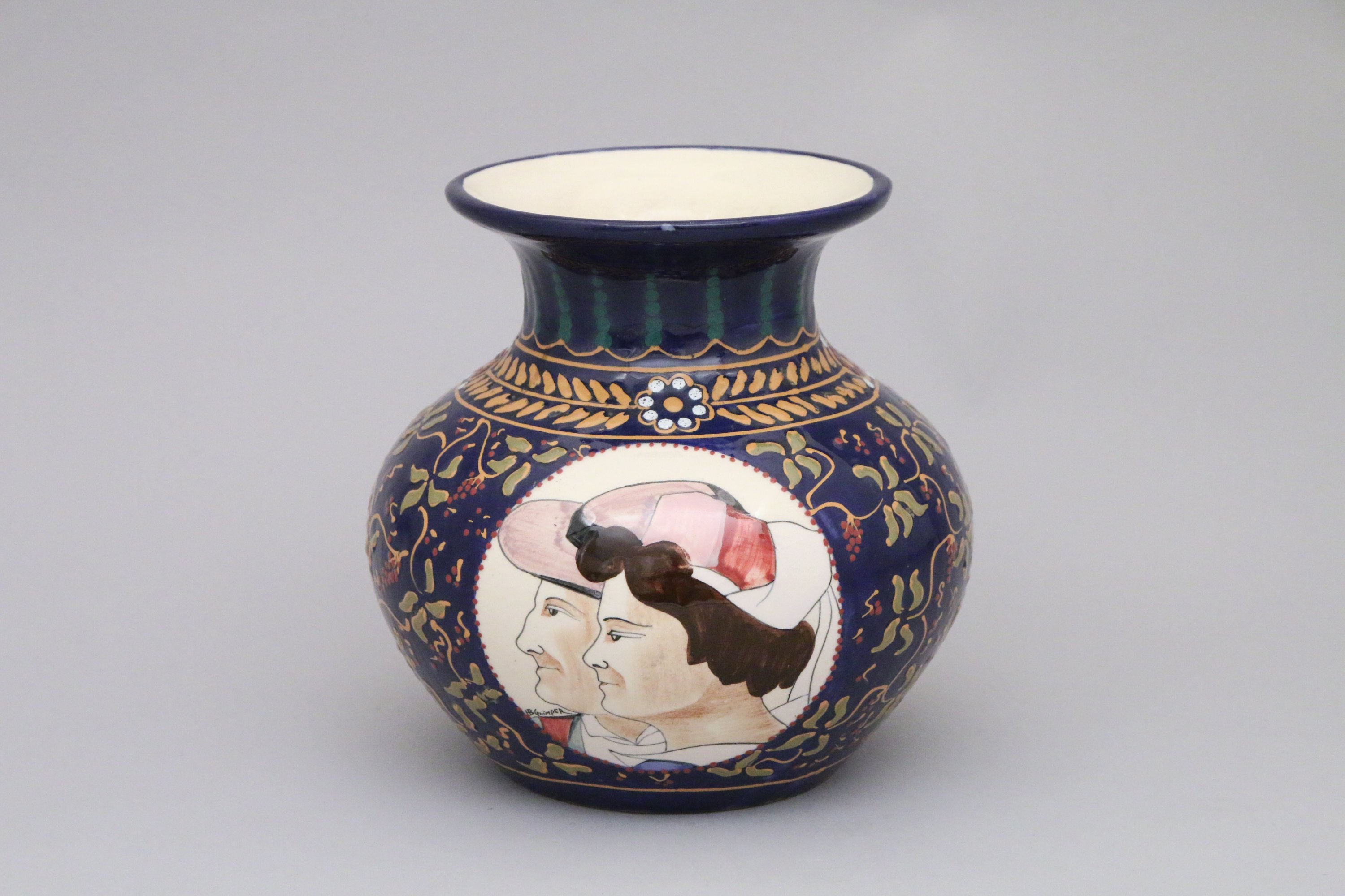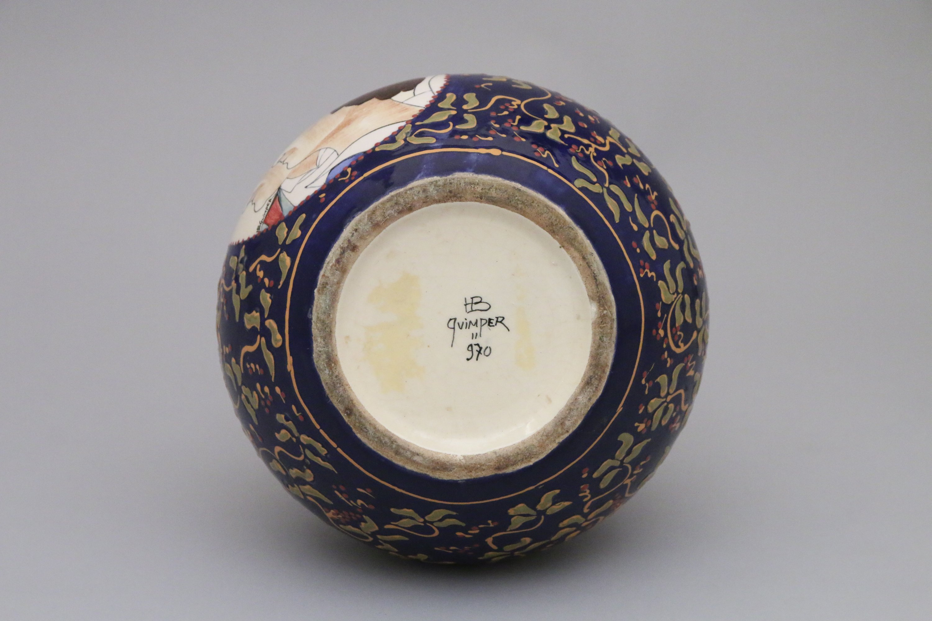 à décor de broderies et d'un médaillon représentant les profils d'un couple de bretons tournés vers la gauche, signé en bas à gauche "HB Quimper".