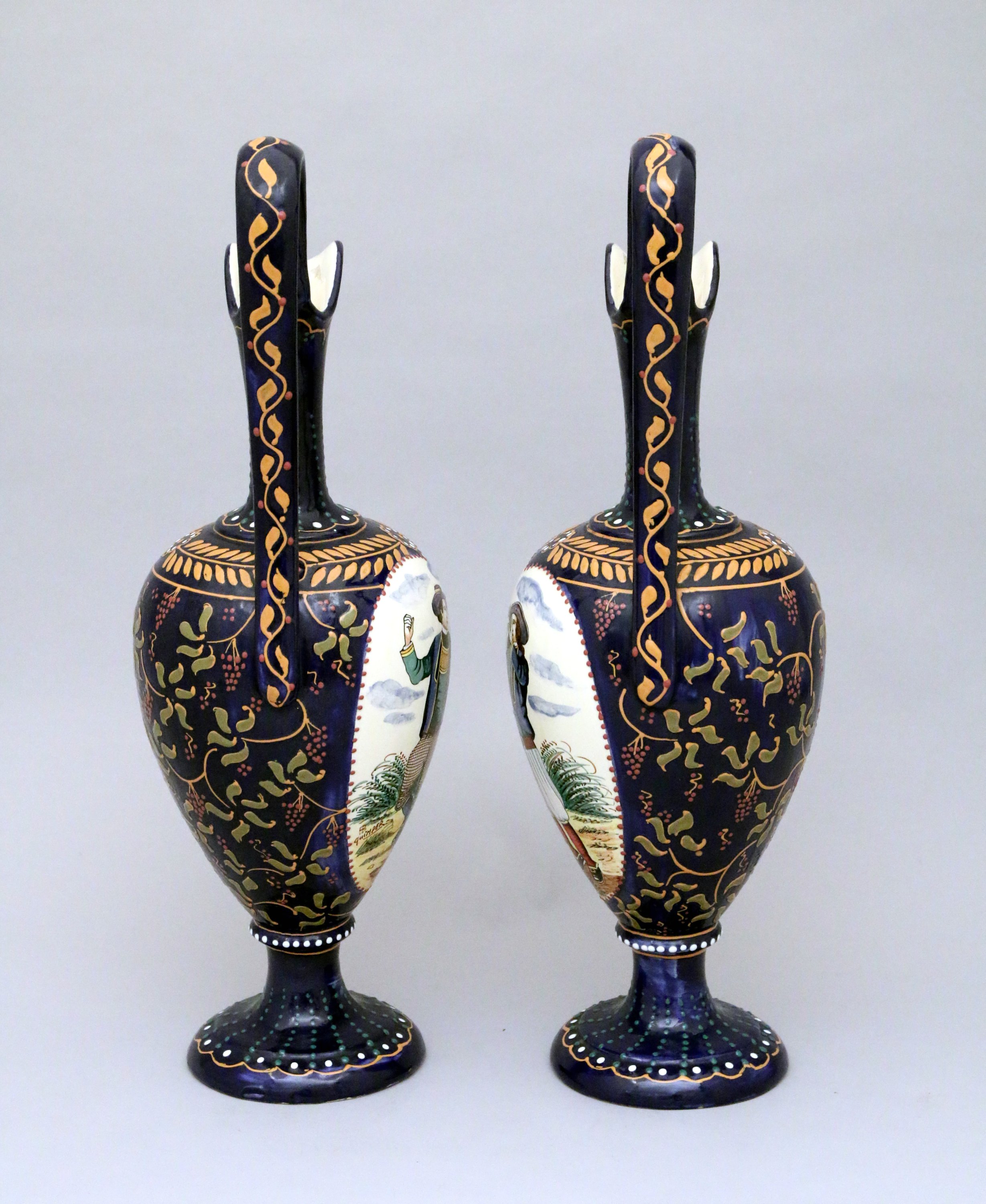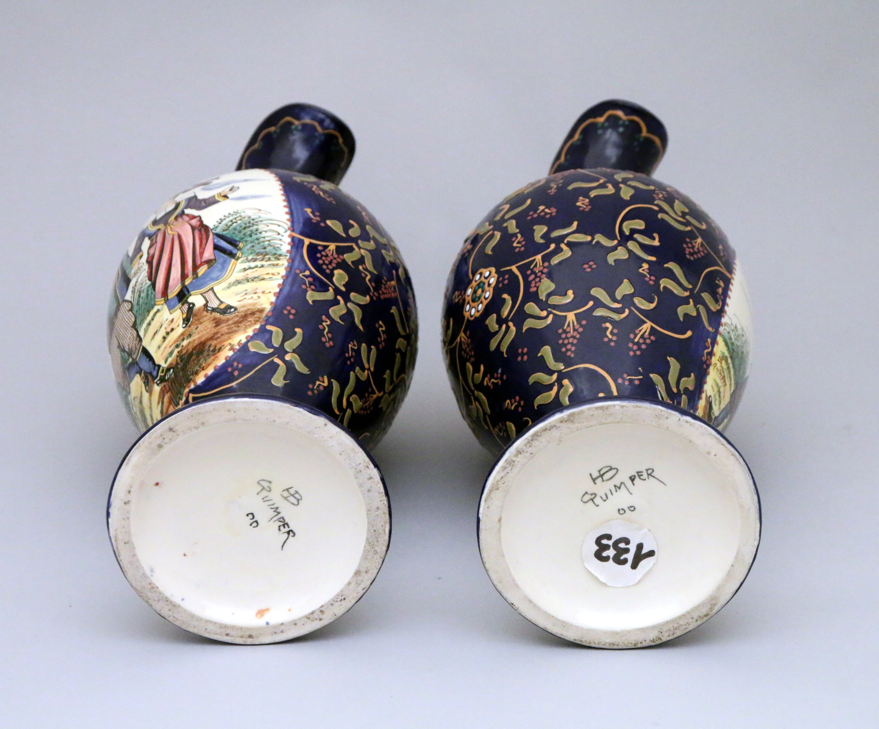 formant pendant en faïence à décor de broderies, l'une agrémentée au centre d'un médaillon représentant deux joueurs de musique et l'autre d'un couple de bretons dansant, signées en bas à gauche " HB Quimper ".