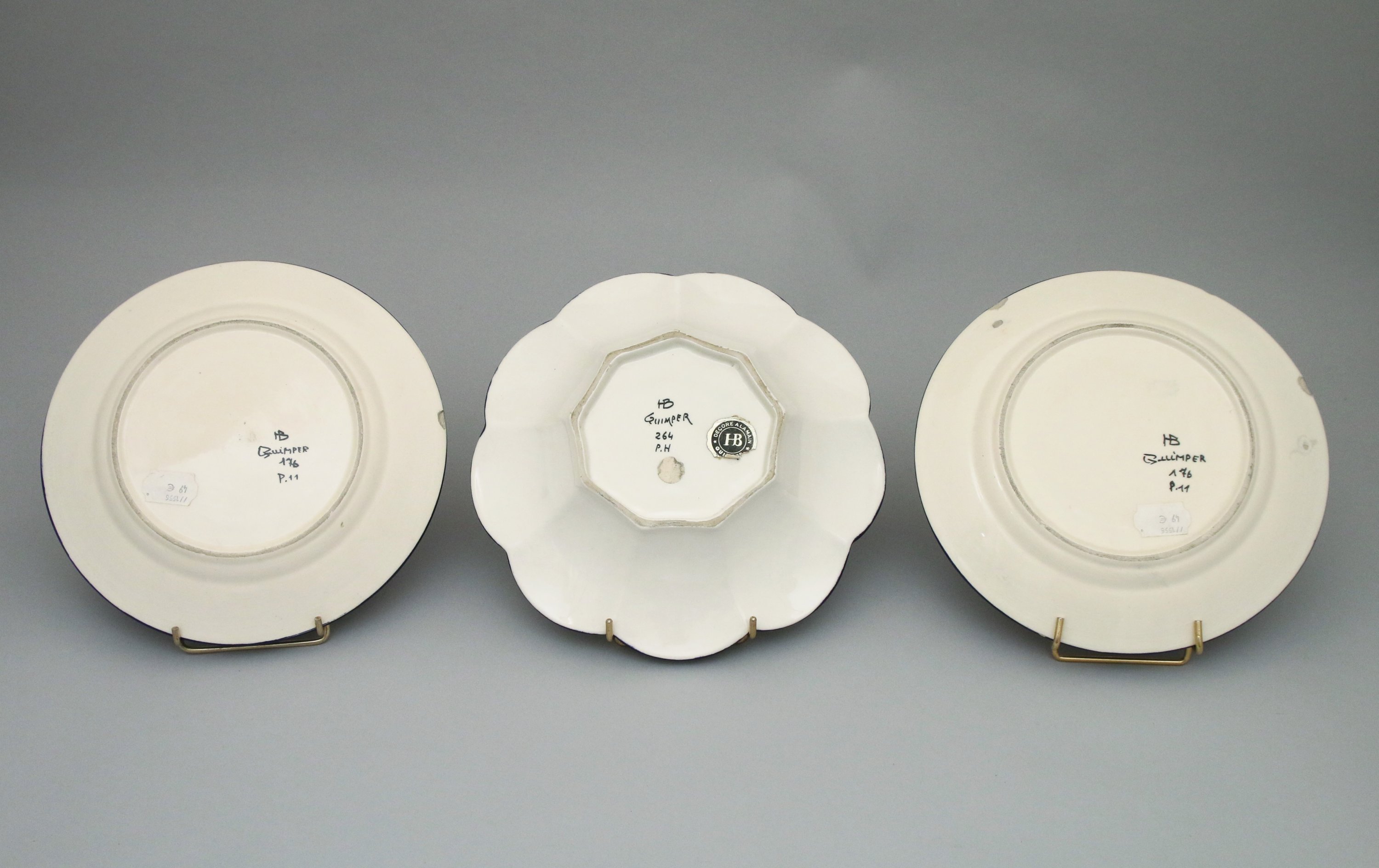 QUIMPER-LA HUBAUDIÈRE-BOUSQUET. LOT de trois pièces en faïence: