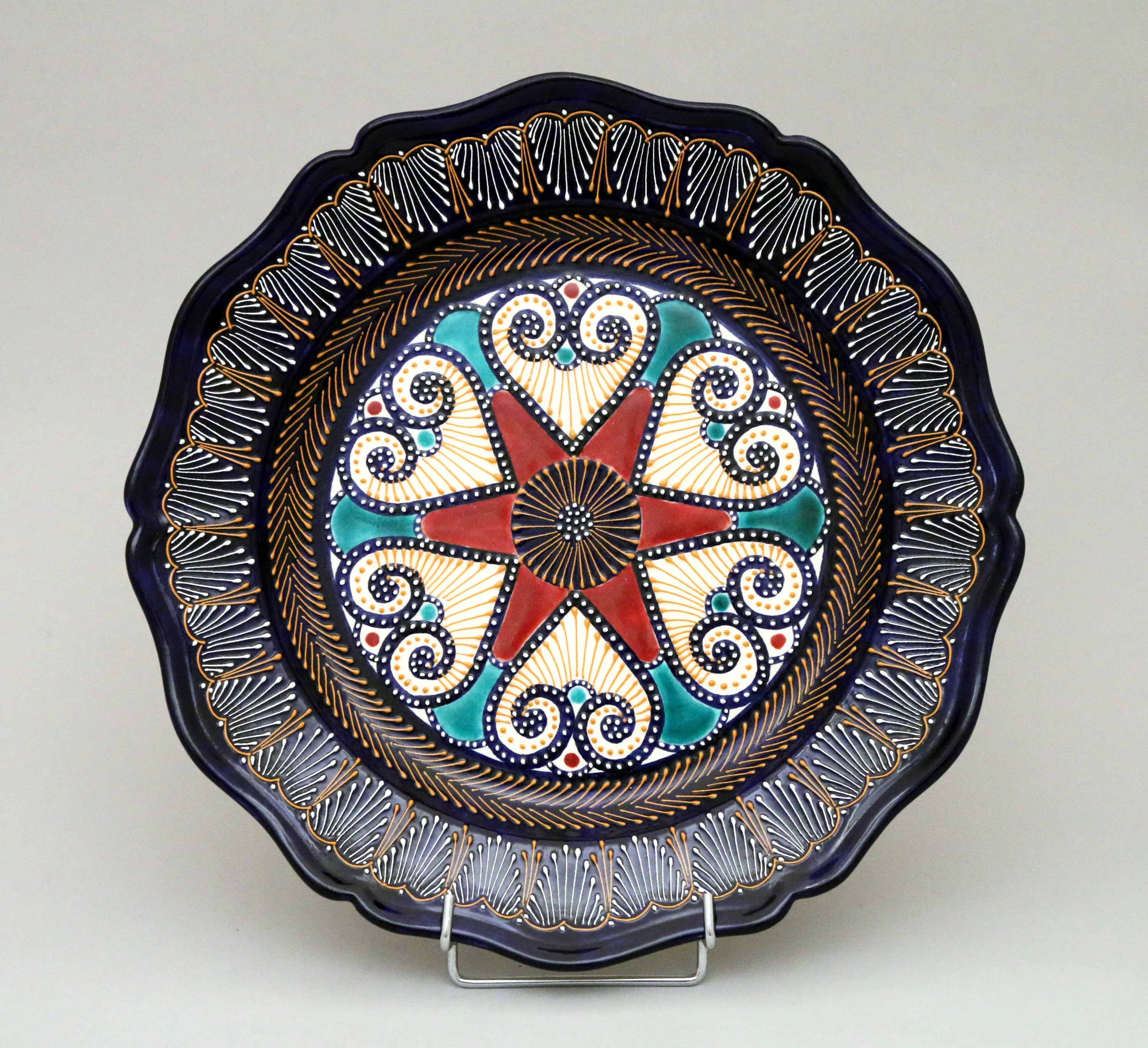 en faïence à bord contourn, décor perlé et polychrome de rosace.