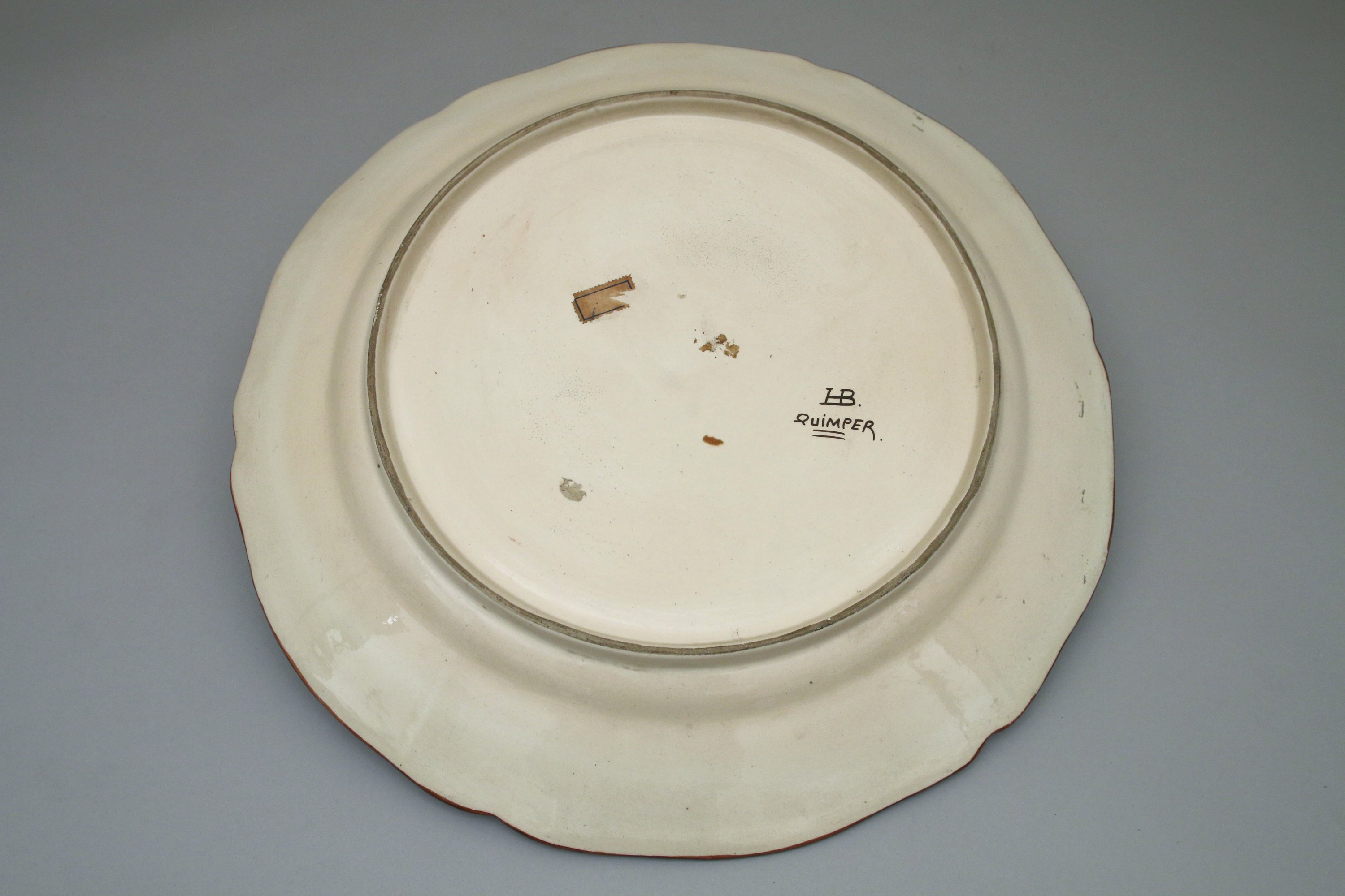 en faïence de forme circulaire, bords contournés, décor d'un couple de jeunes bretons dans un entourage de fleurs stylisées. L'aile à décor de broderies.