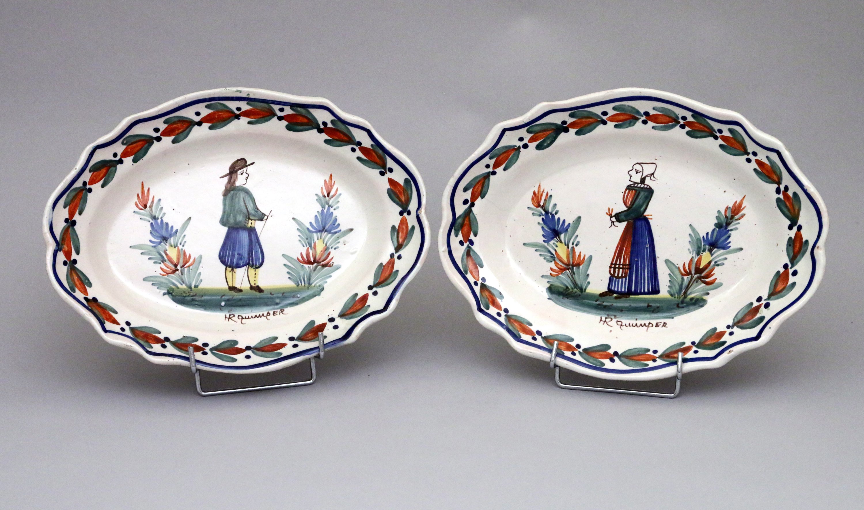 en faïence à décor au centre pour l'un d'un breton debout entre deux rameaux tenant dans sa main une canne, tourné vers la droite, et l'autre à décor d'une bretonne debout entre deux rameaux tenant dans ses mains un bouquet. L'aile à décor de feuilles.