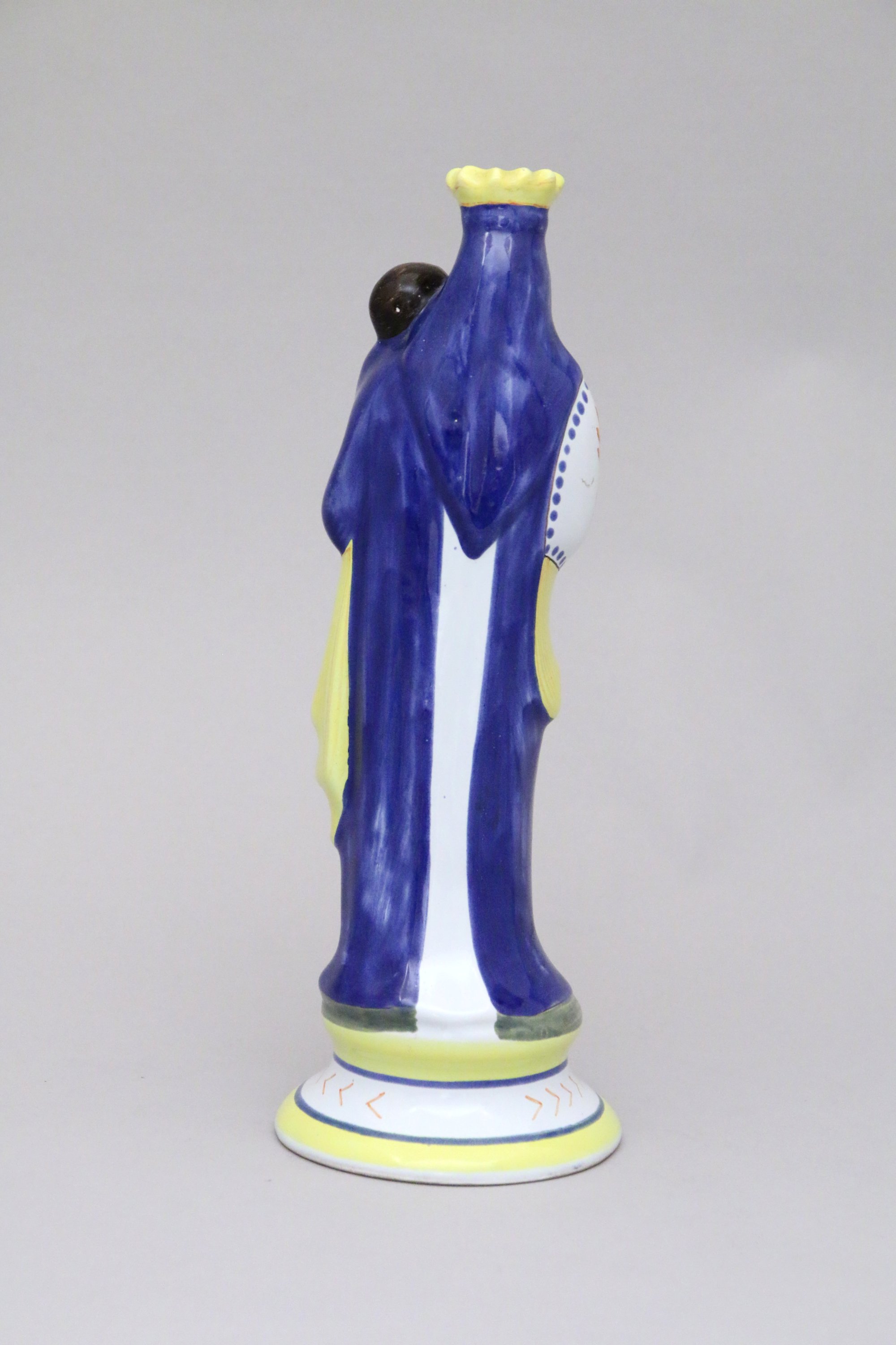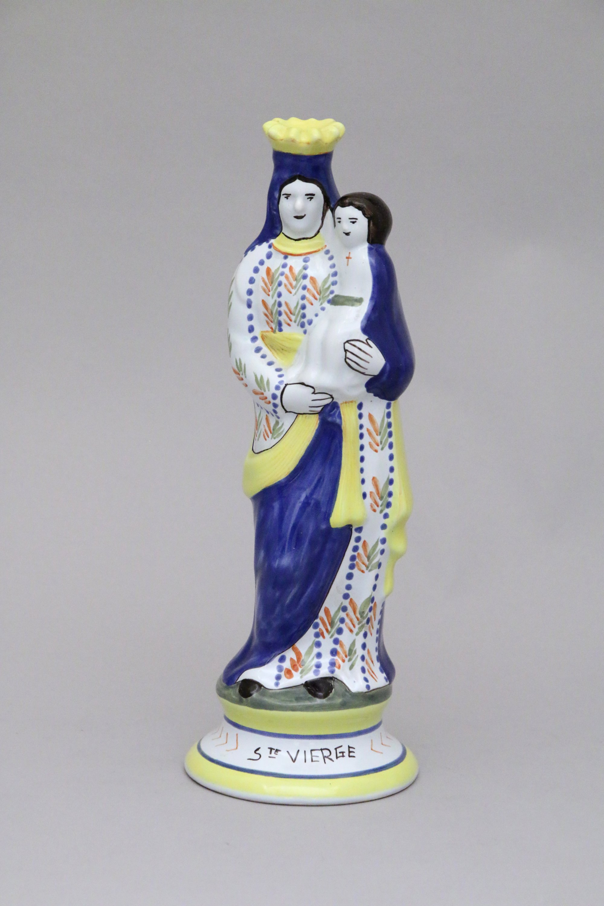 en faïence. Sainte Vierge couronnée vêtue d'un long manteau bleu tenant dans ses bras l'enfant Jésus, socle mouluré et légendé "Ste VIERGE ".