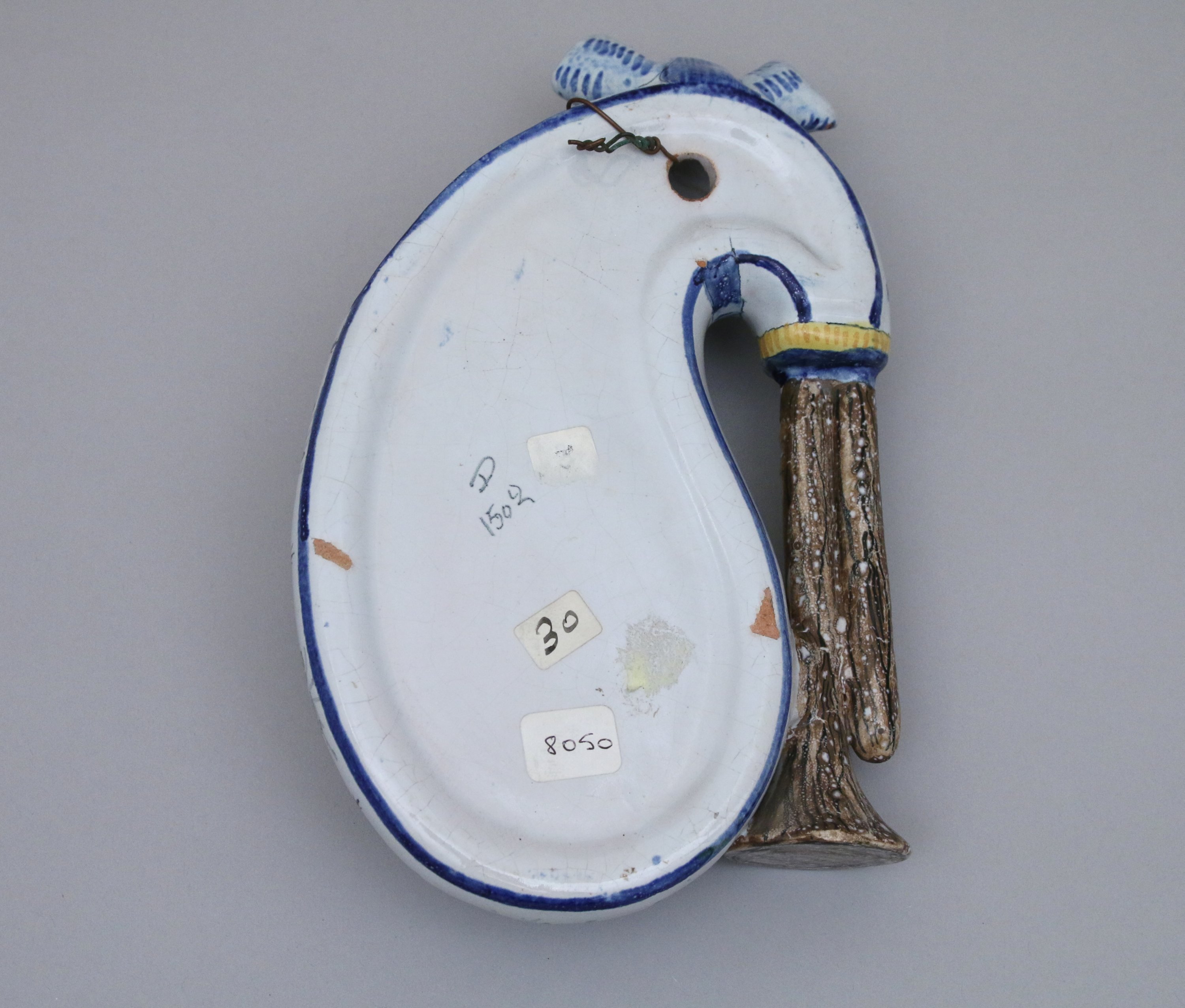 en faïence simulant un biniou à décor de nud de rubans et au centre une bretonne filant de la laine.
