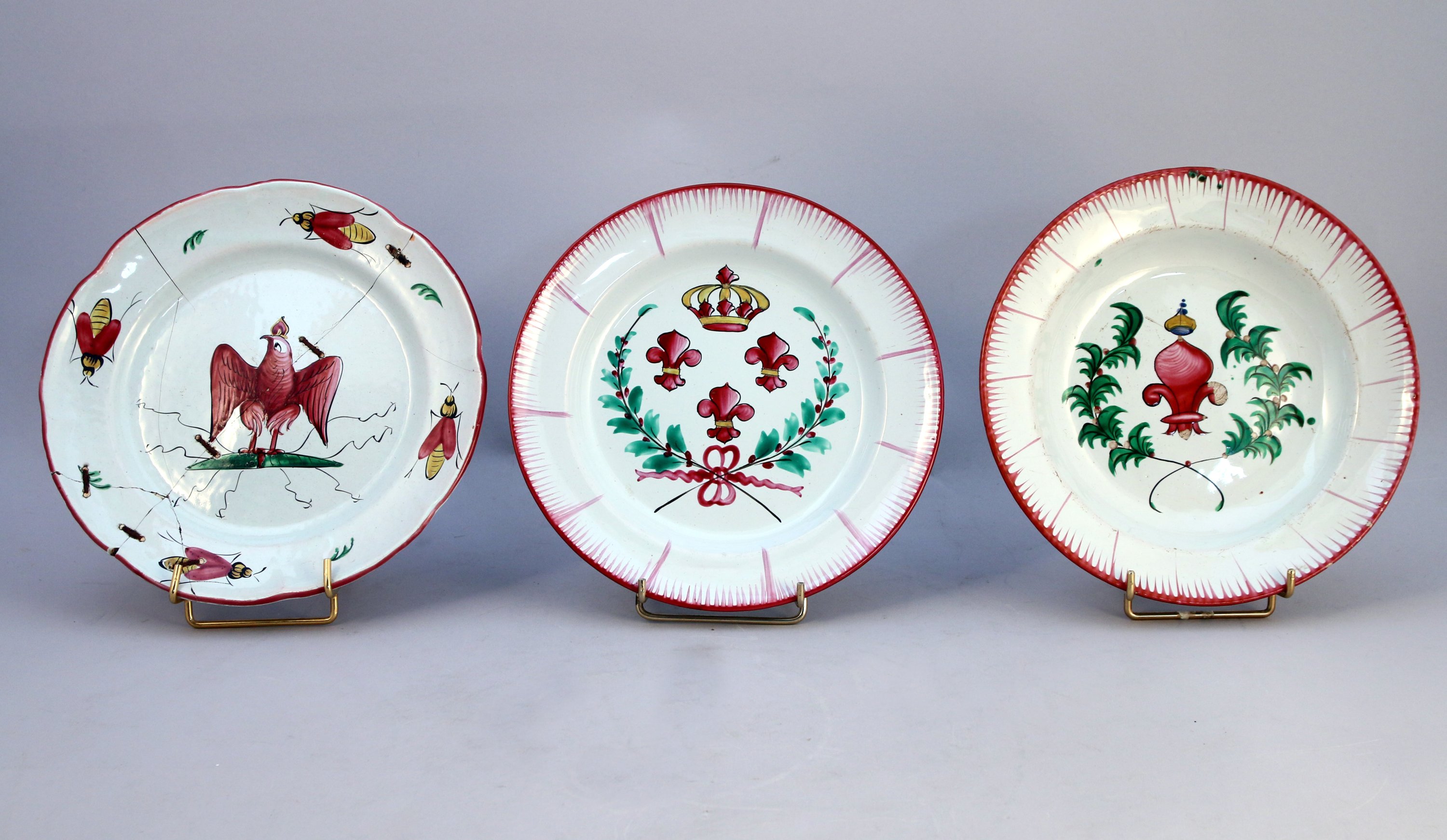 - ASSIETTE, à bord contourné à décor polychrome en camaïeu de rouge d'un aigle au centre et d'abeilles sur l'aile. (Accidents et restaurations).