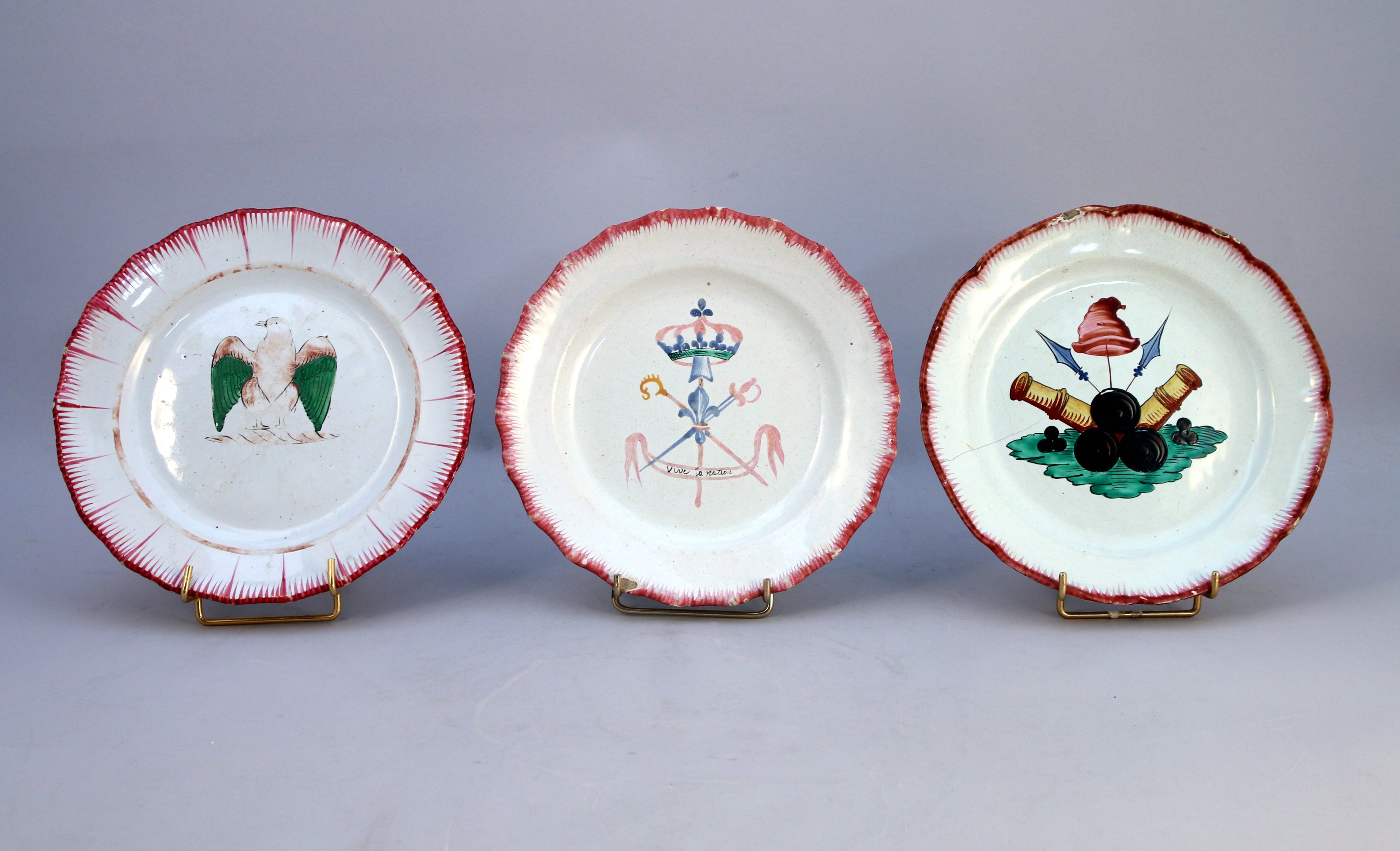 - ASSIETTE, à bord contourné à décor polychrome en camaïeu de rouge d'attributs patriotiques, représentant les symboles des trois Ordres réunis par une fleur de lys, surmonté de la couronne portant linscription à la base « Vive la Nation », l'aile peignée. Au revers l'inscription postérieure manuscrite "Ripault".