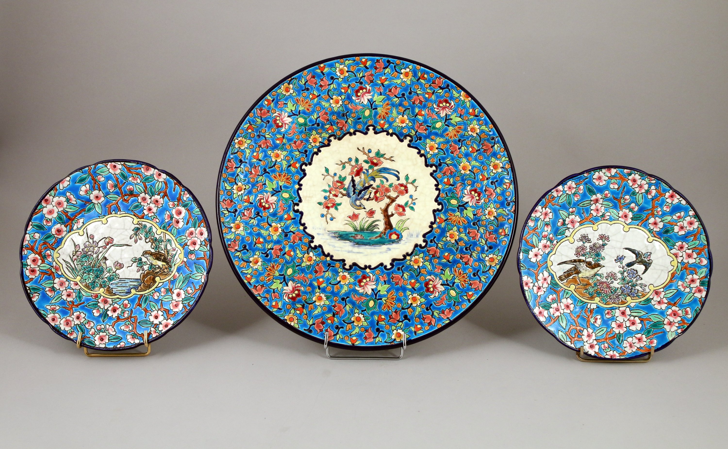 - Les ASSIETTES à décor d'un semis de fleurs sur fond bleu, au centre d'un reserve à motif d'oiseaux. Marque imprimée: blason à la feuille de houx couronnée et cachet imprimé avec la mention "Émaux de Longwy France".