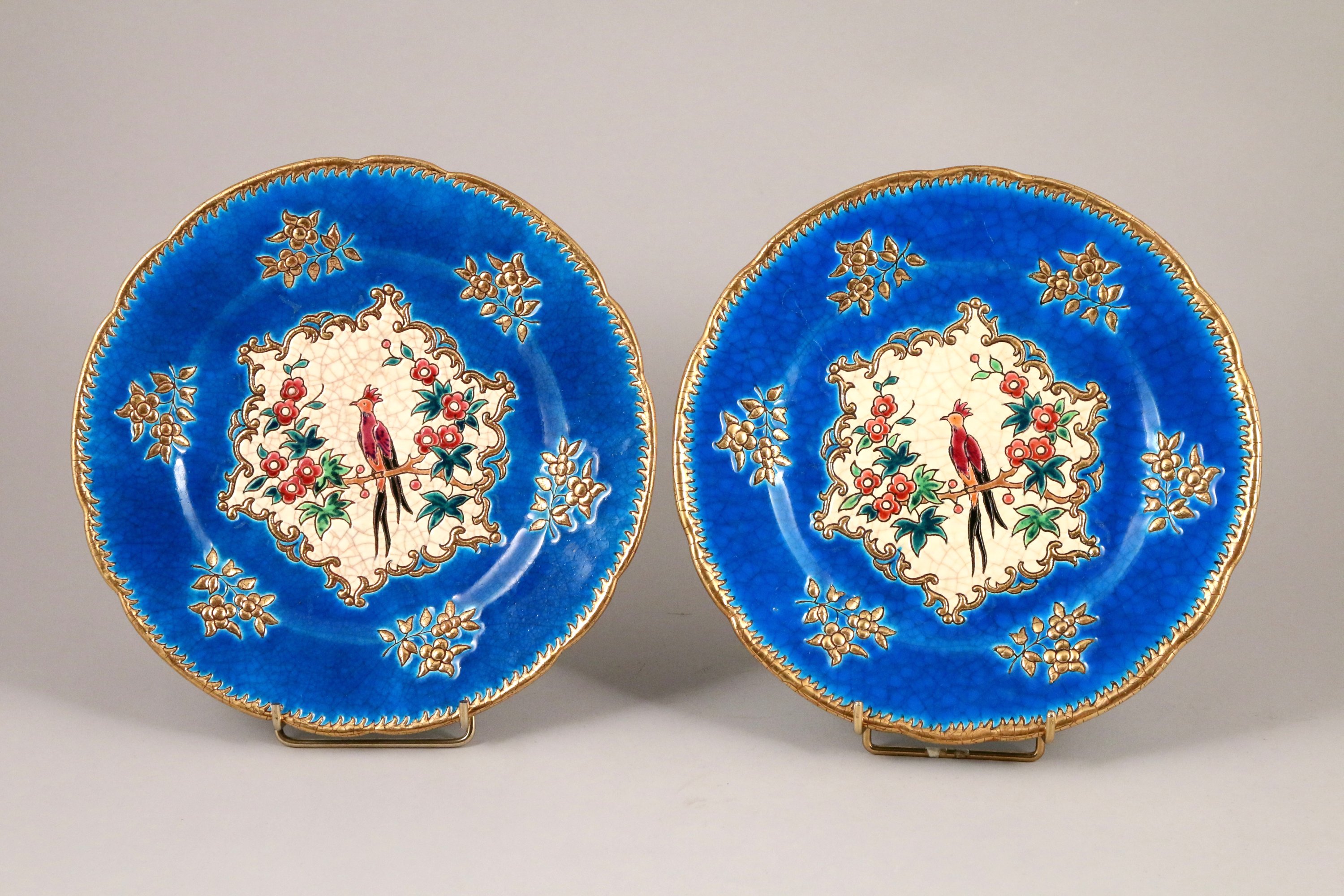 en faïence émaillée à décor polychrome et or sur fond bleu, au centre réserve à décor d'un oiseau perché sur une branche fleurie l'aile à décor de fleurs, la bordure soulignée d'un filet or.