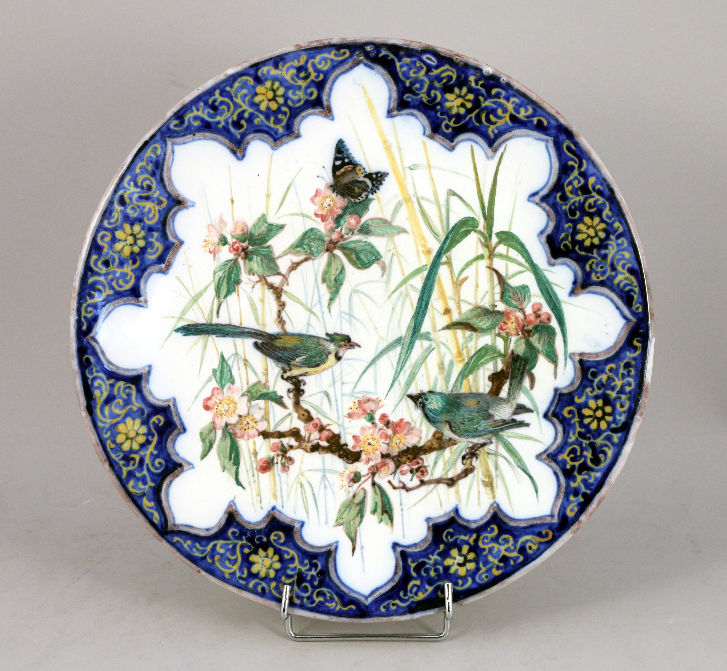 aux oiseaux dans des fleurs de cerisiers et bambous. En faïence émaillée polychrome, l'aile à décor polylobé de fleurs et rinceaux avec des feuillages au revers. Signée "m:Bouquet" et daté 1863.