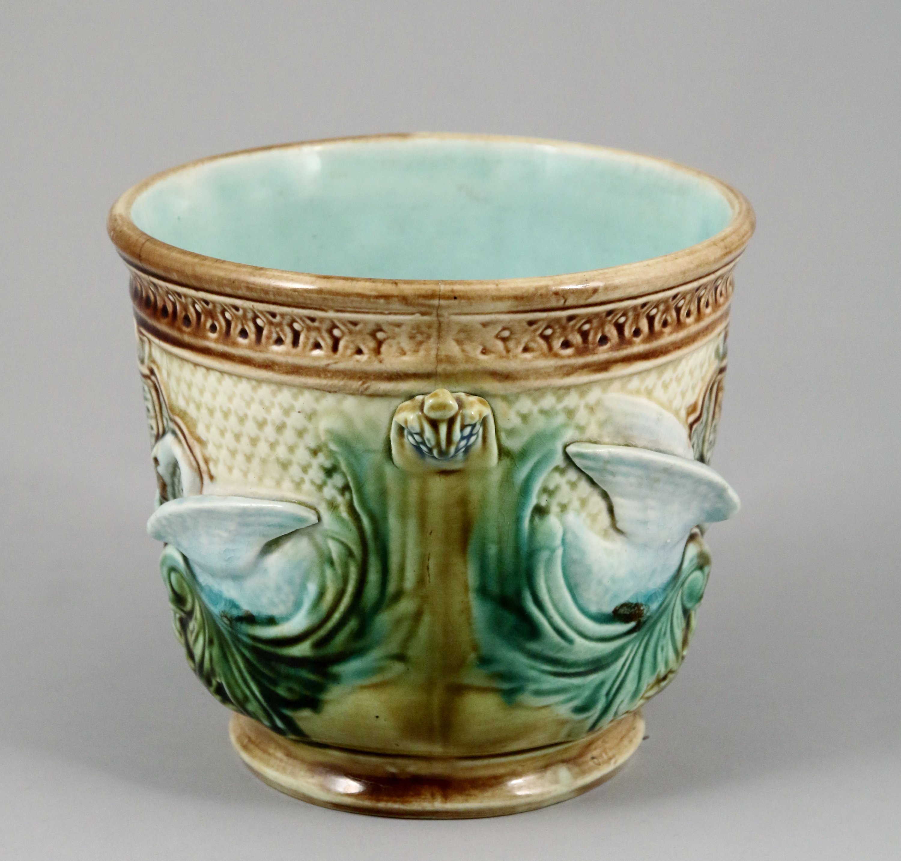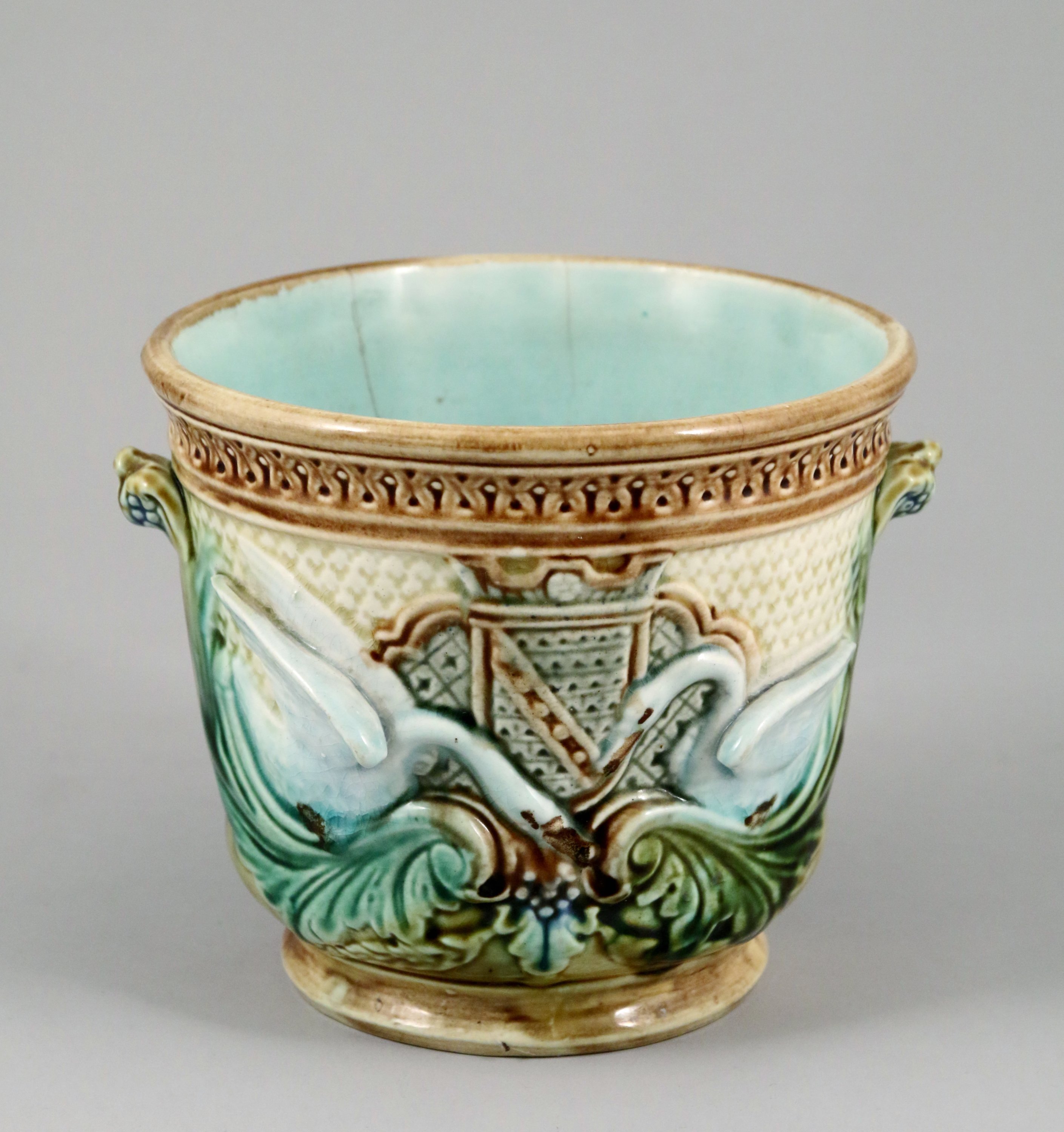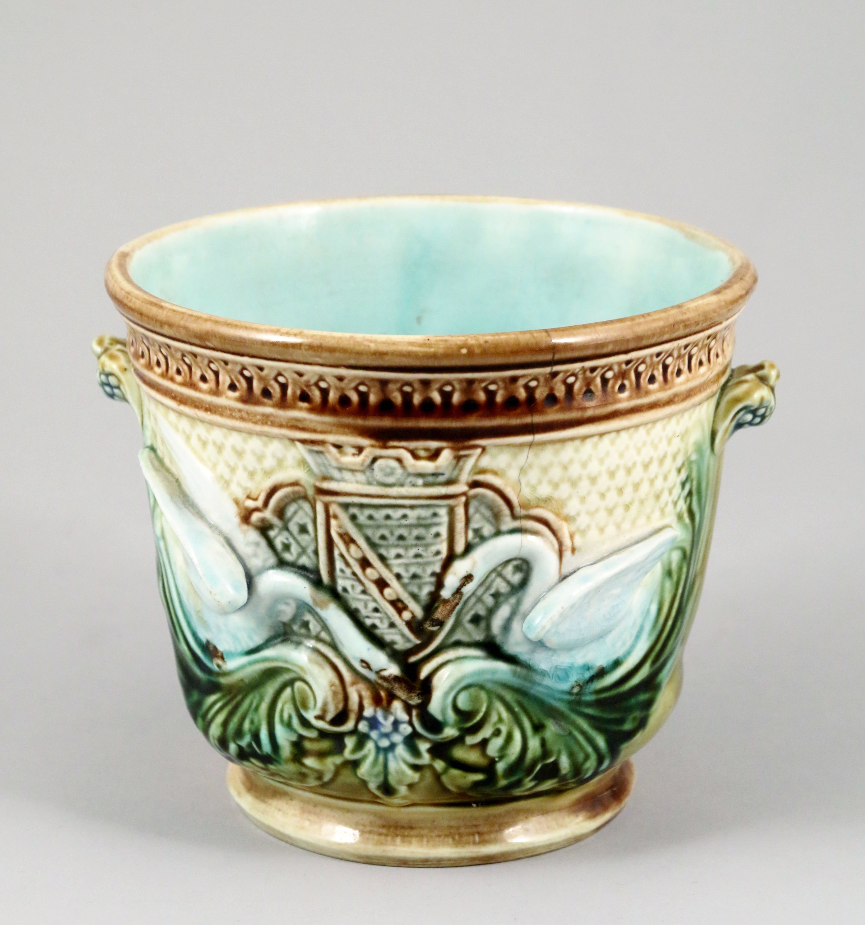 en céramique émaillée à décor en relief d'un blason entouré d'un couple de cygnes et de feuilles d'acanthes. Intérieur turquoise.