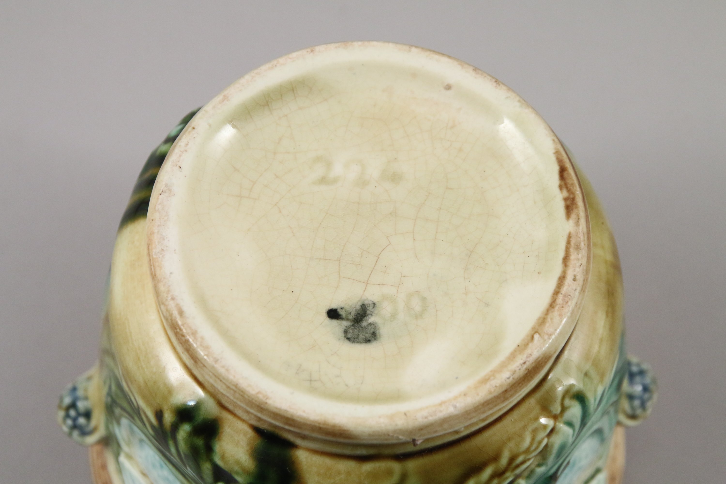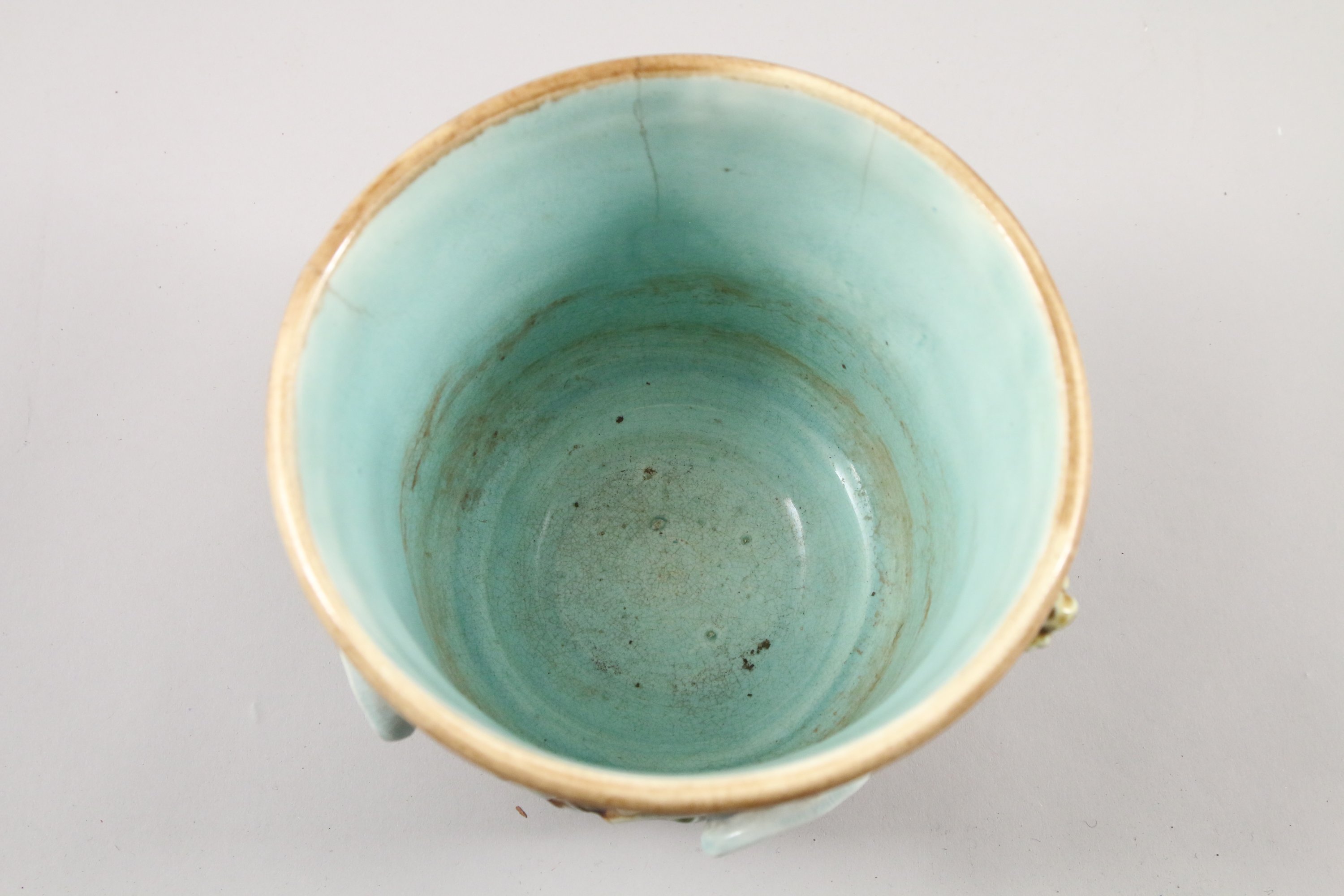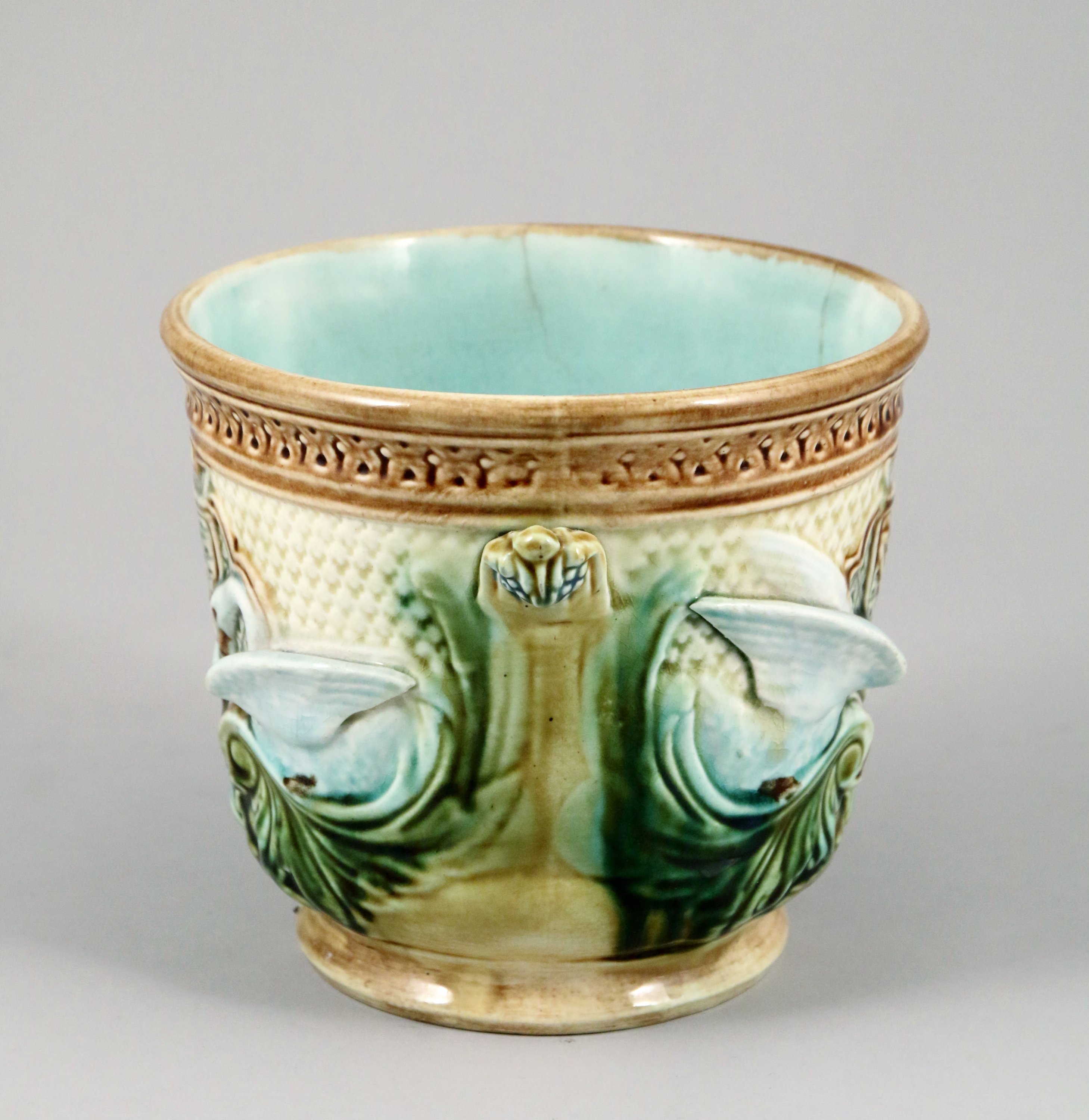 en céramique émaillée à décor en relief d'un blason entouré d'un couple de cygnes et de feuilles d'acanthes. Intérieur turquoise.