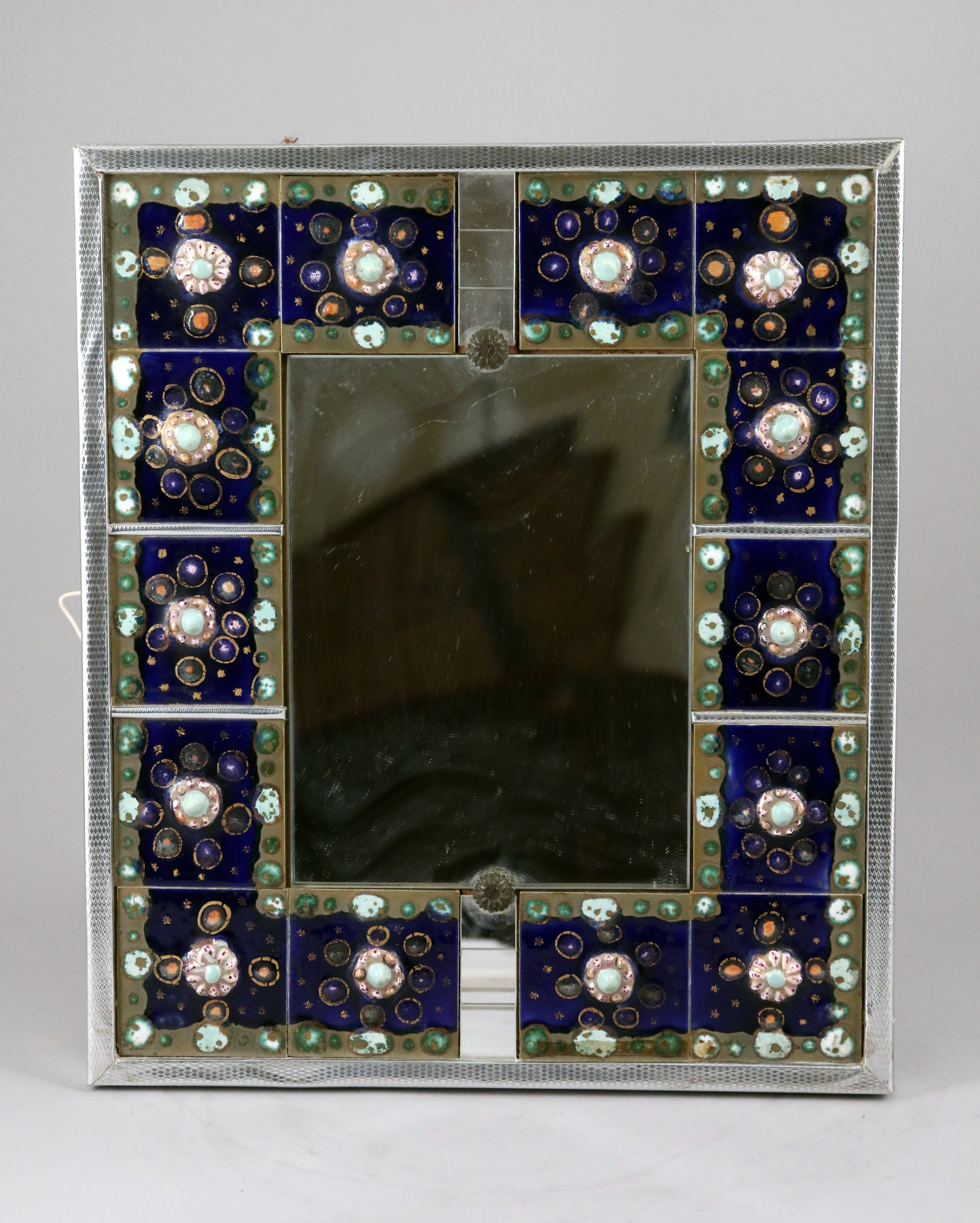 MIROIR et son encadrement composé de quatorze carreaux en céramique à décor polychrome en relief de rosaces et cupules.