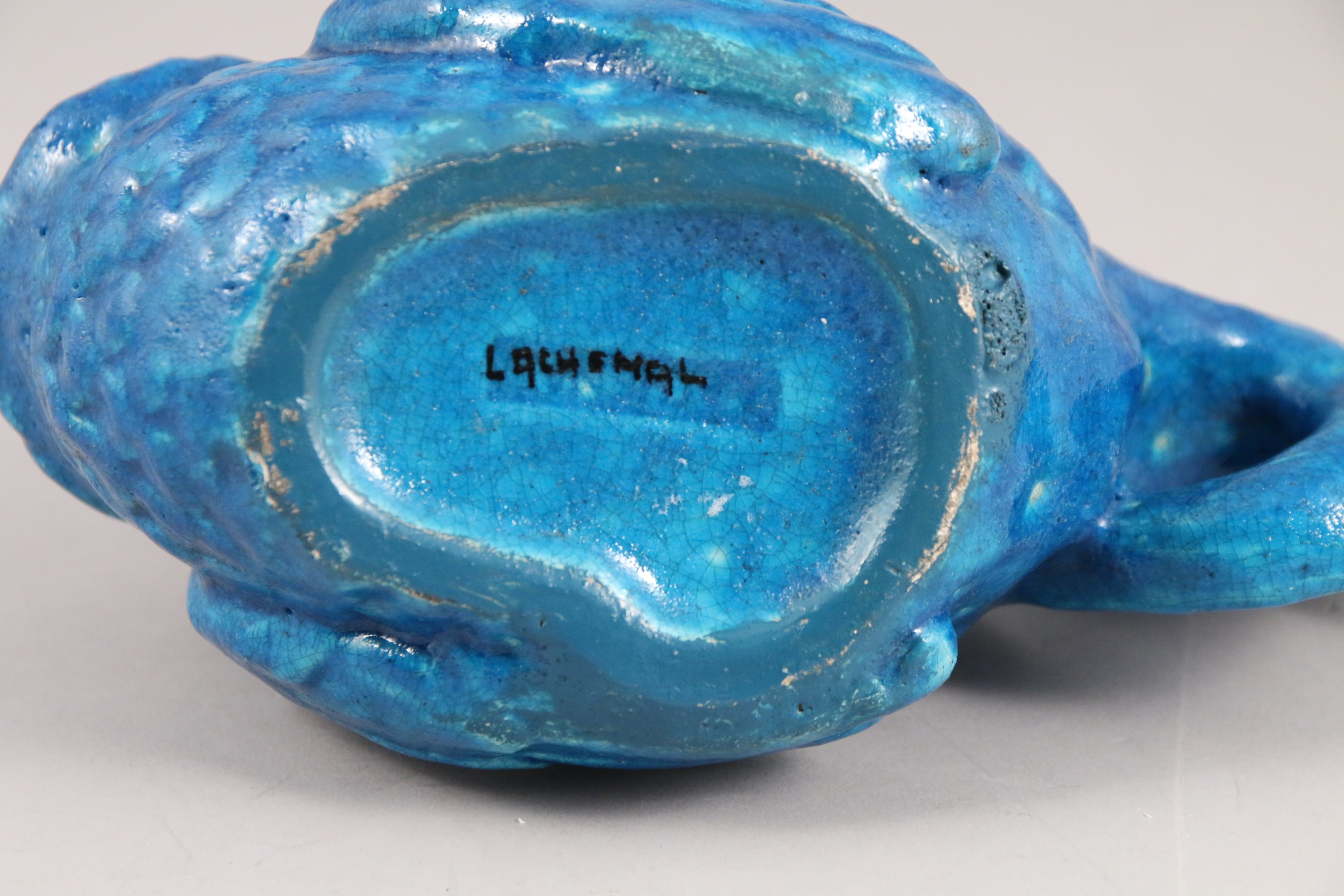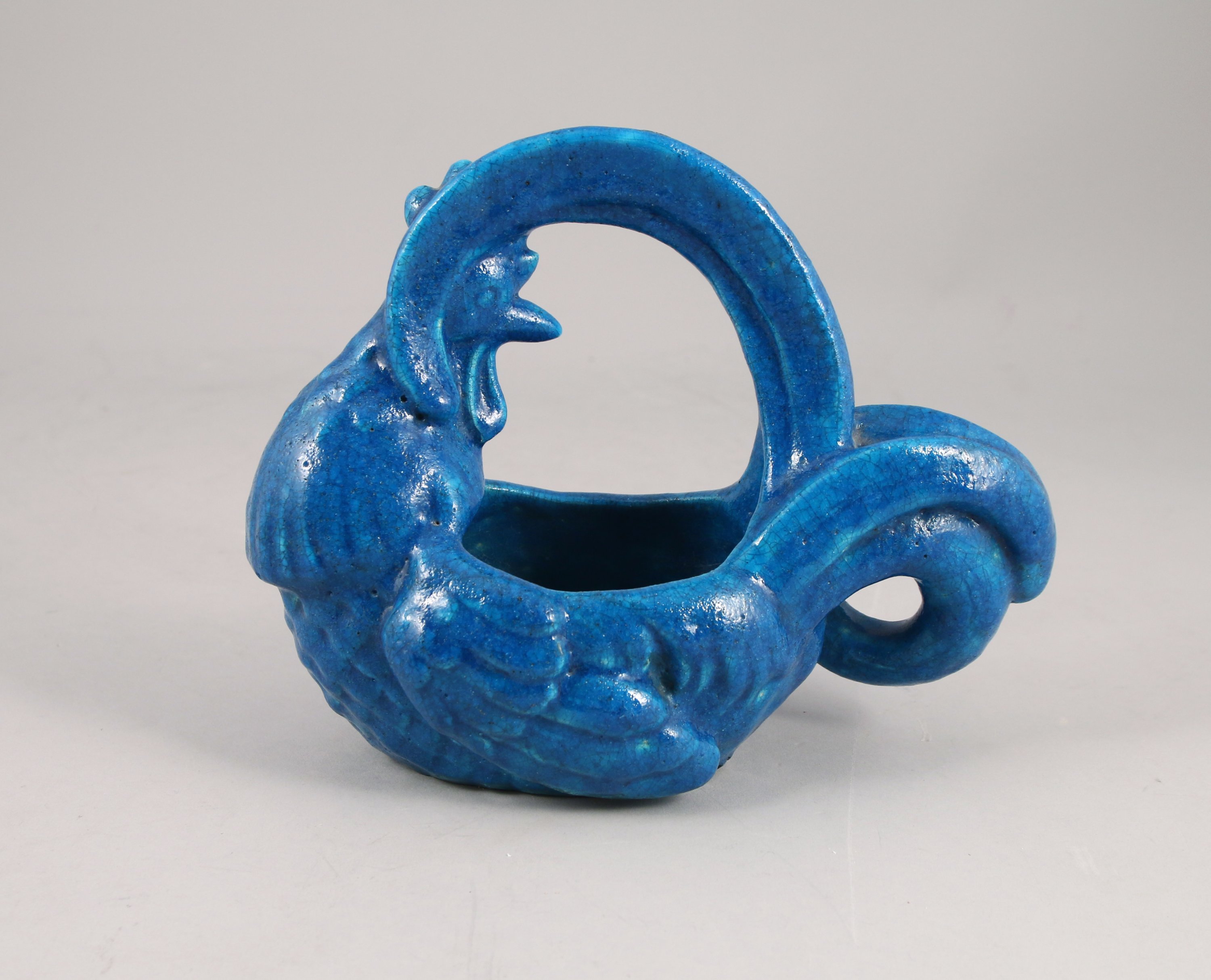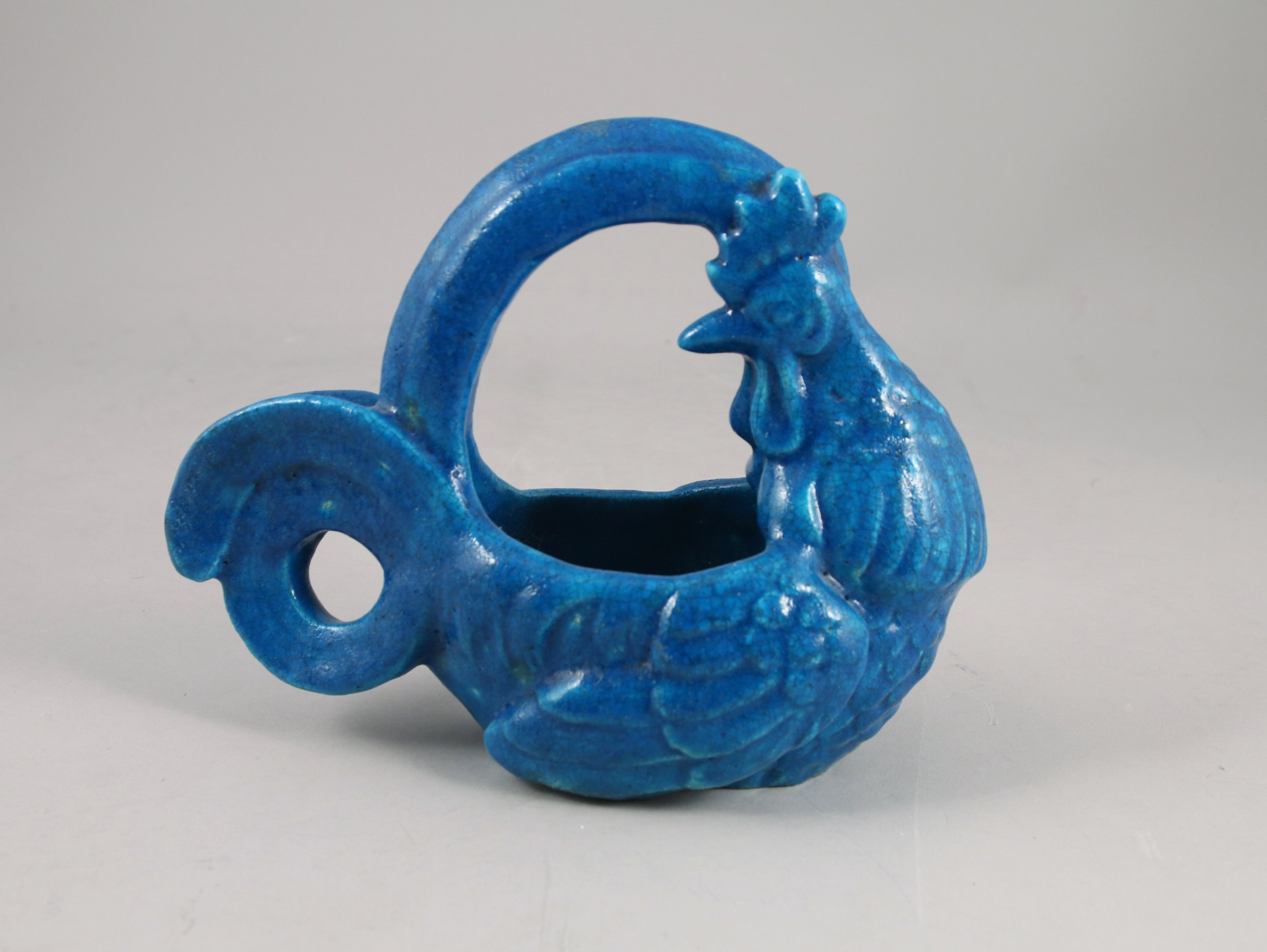 Coq pannier en faïence émaillé turquoise. Signature à l'encre au revers.