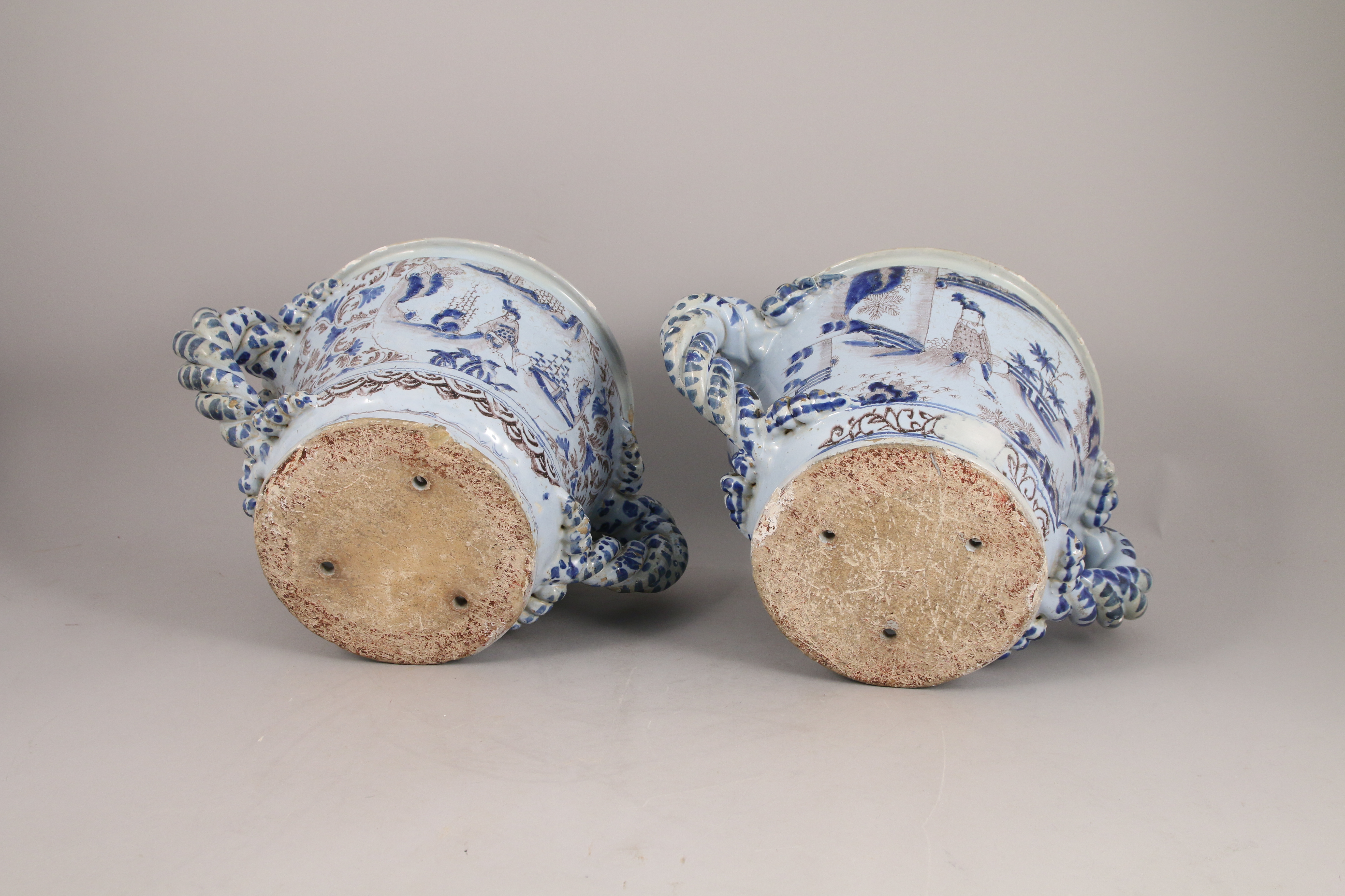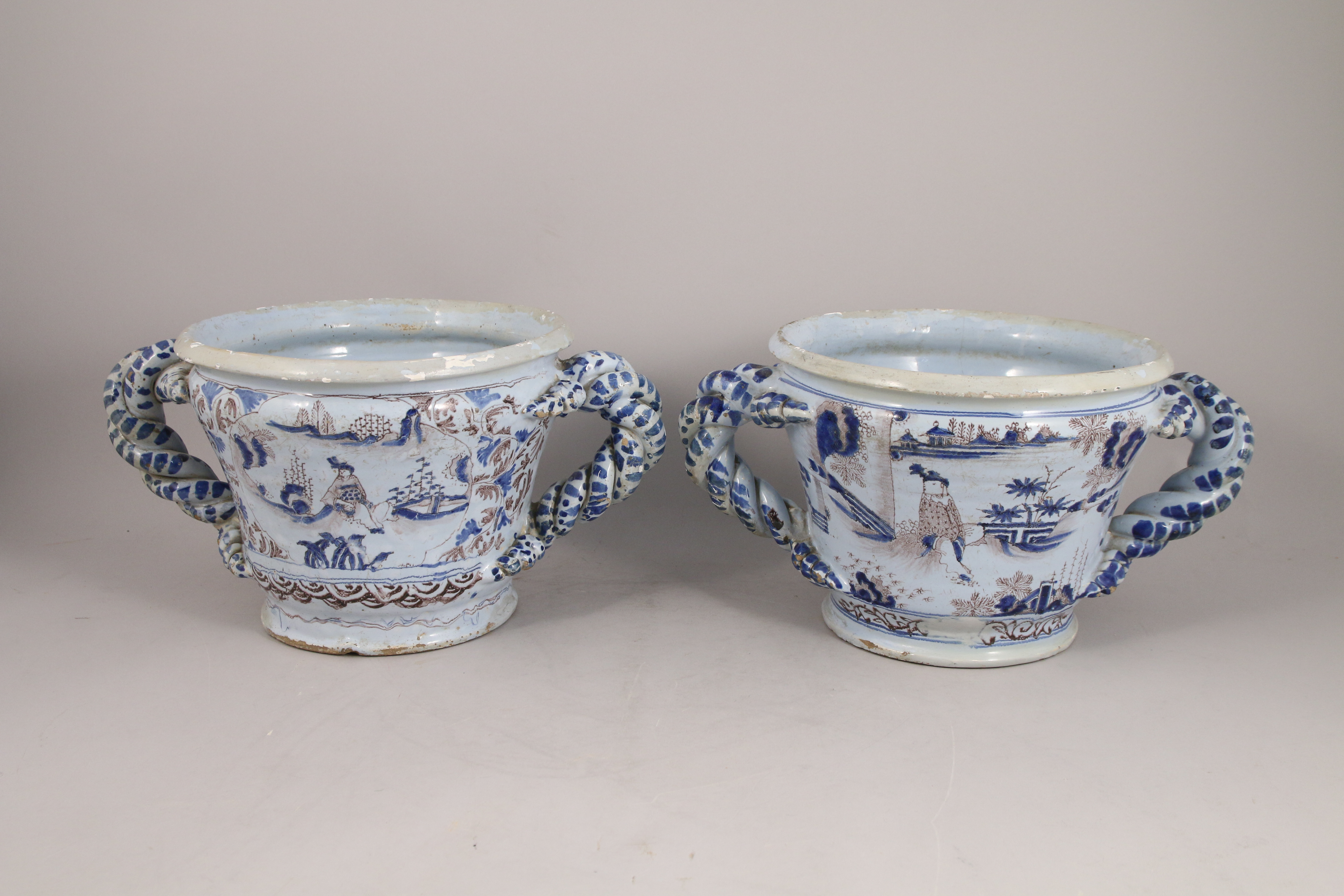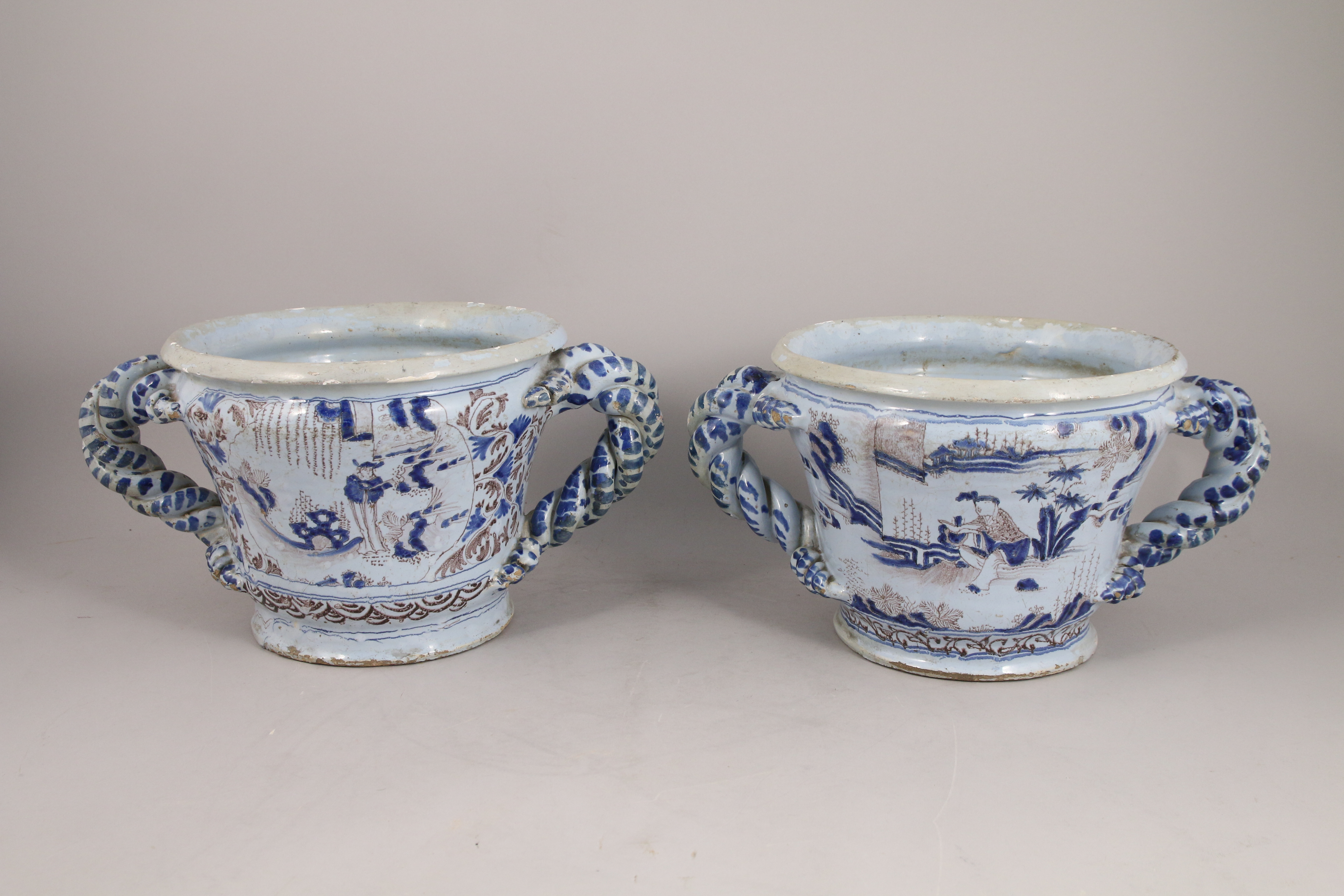 Paire de vases à oranger à anses torsadées. En faïence émaillée bleue et manganèse sur fond blanc. Décor sinisant de scènes d'offrandes dans des paysages fantaisistes. Les anses torsadées décorées de pois bleus.