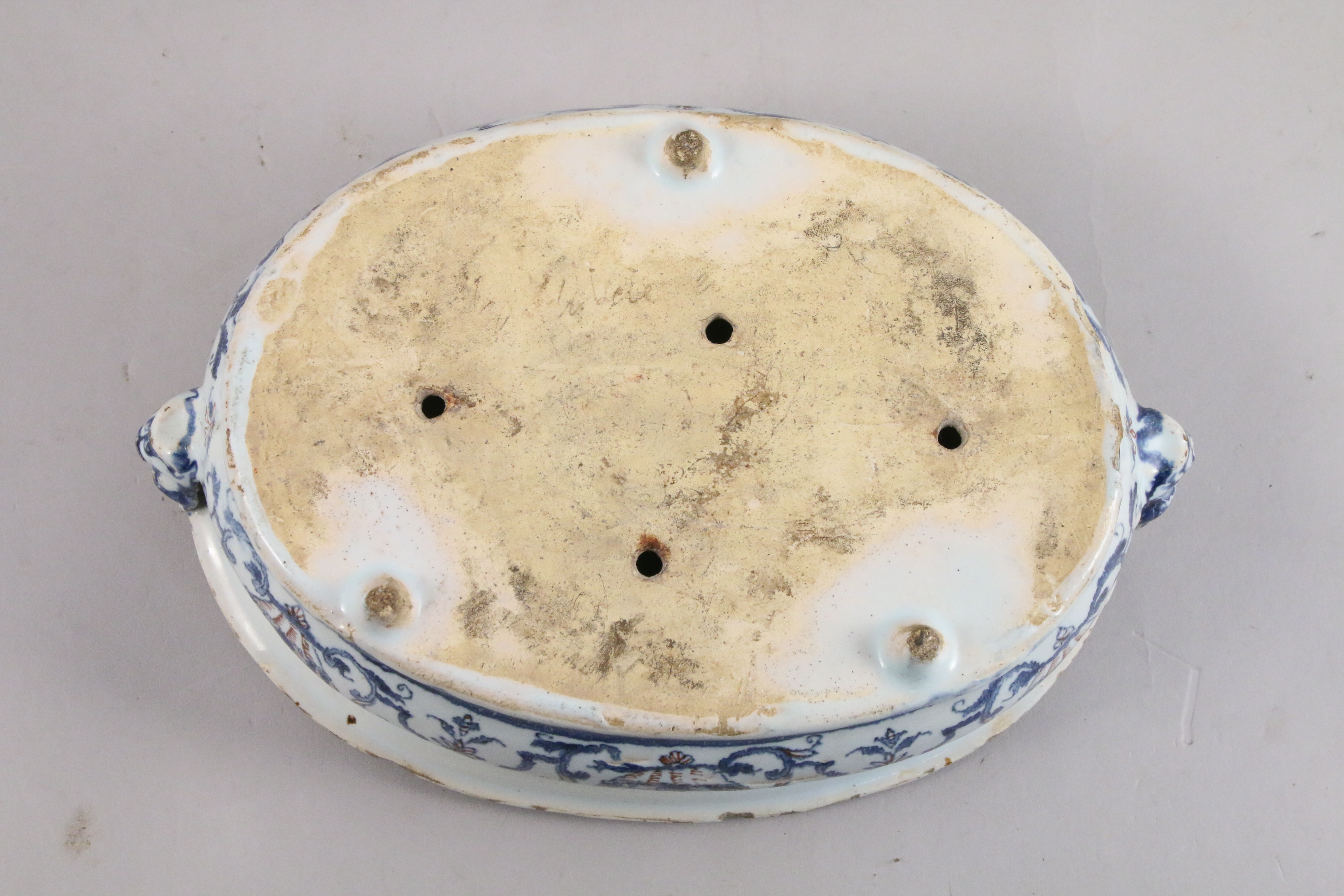 en faïence à décor d'oxydes rouge et bleu sur fond blanc. De forme ovale et à anses têtes de lions. Le plateau quadrillé dans des cartouches.