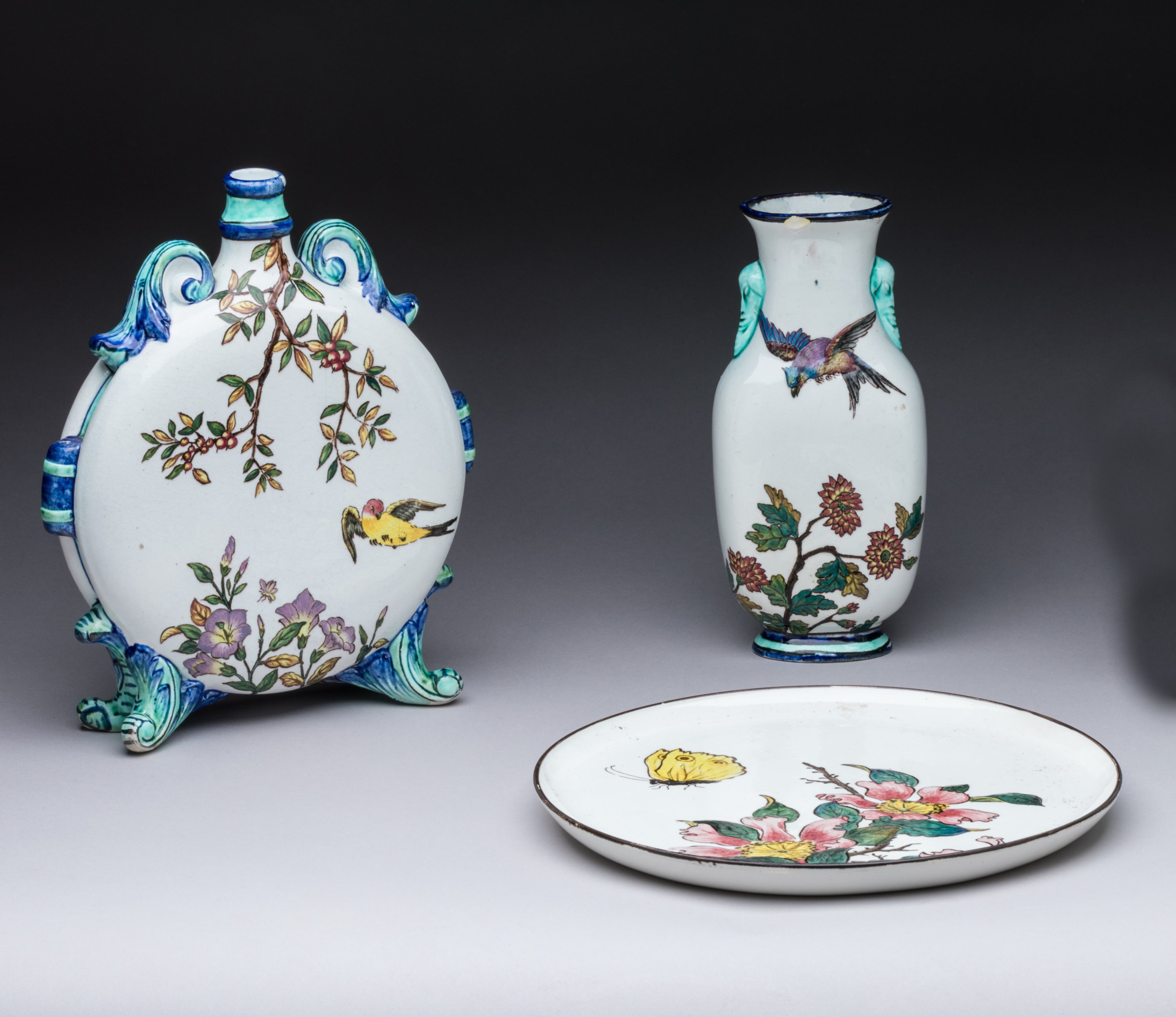 Une GOURDE aux oiseaux siffleurs, une ASSIETTE au papillon et un VASE monogrammé de Jehanne GONDOUIN (1851-1942)