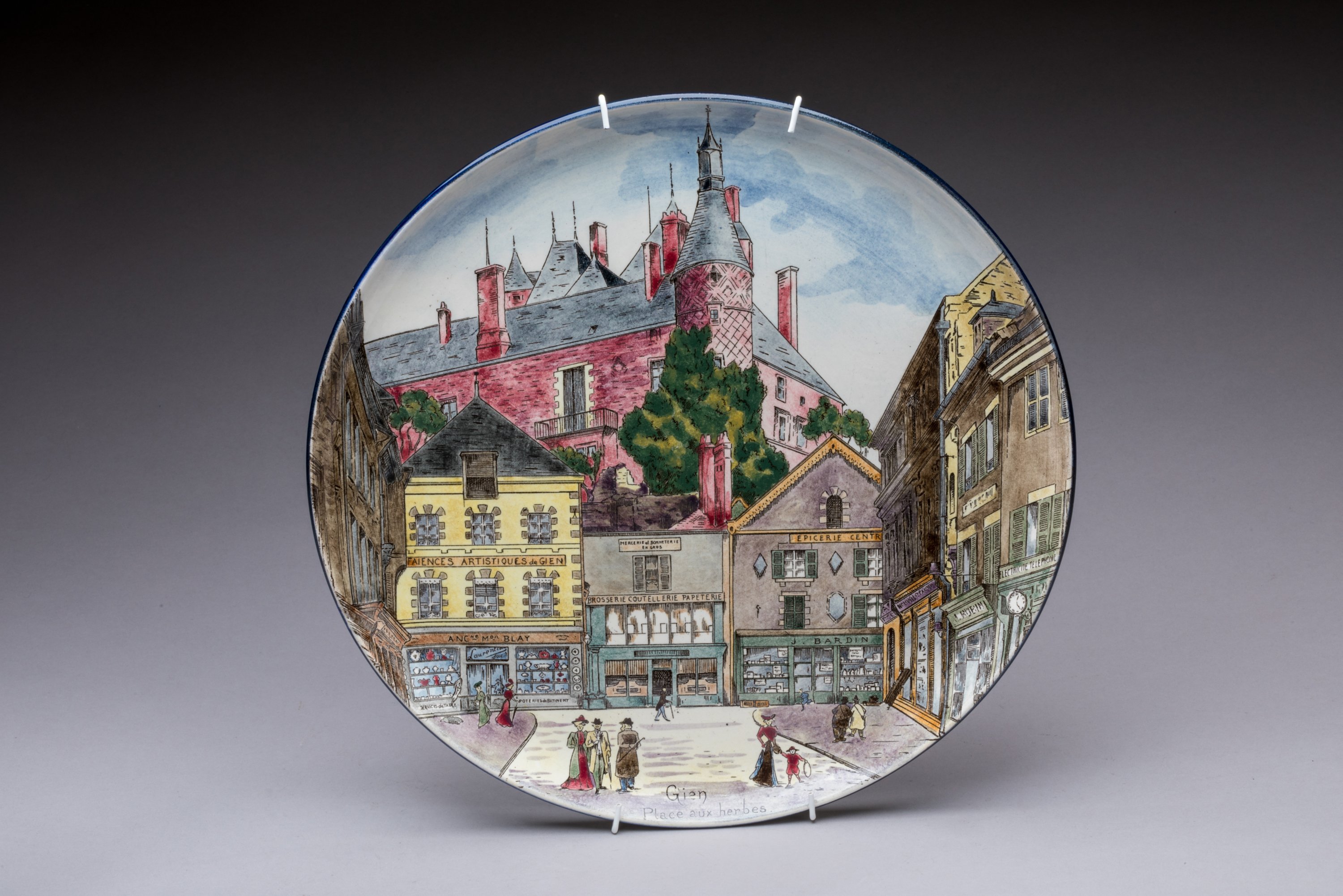 en céramique émaillée au décor imprimé du Pont de Gien, du Château et de l'église et de la Place aux herbes.