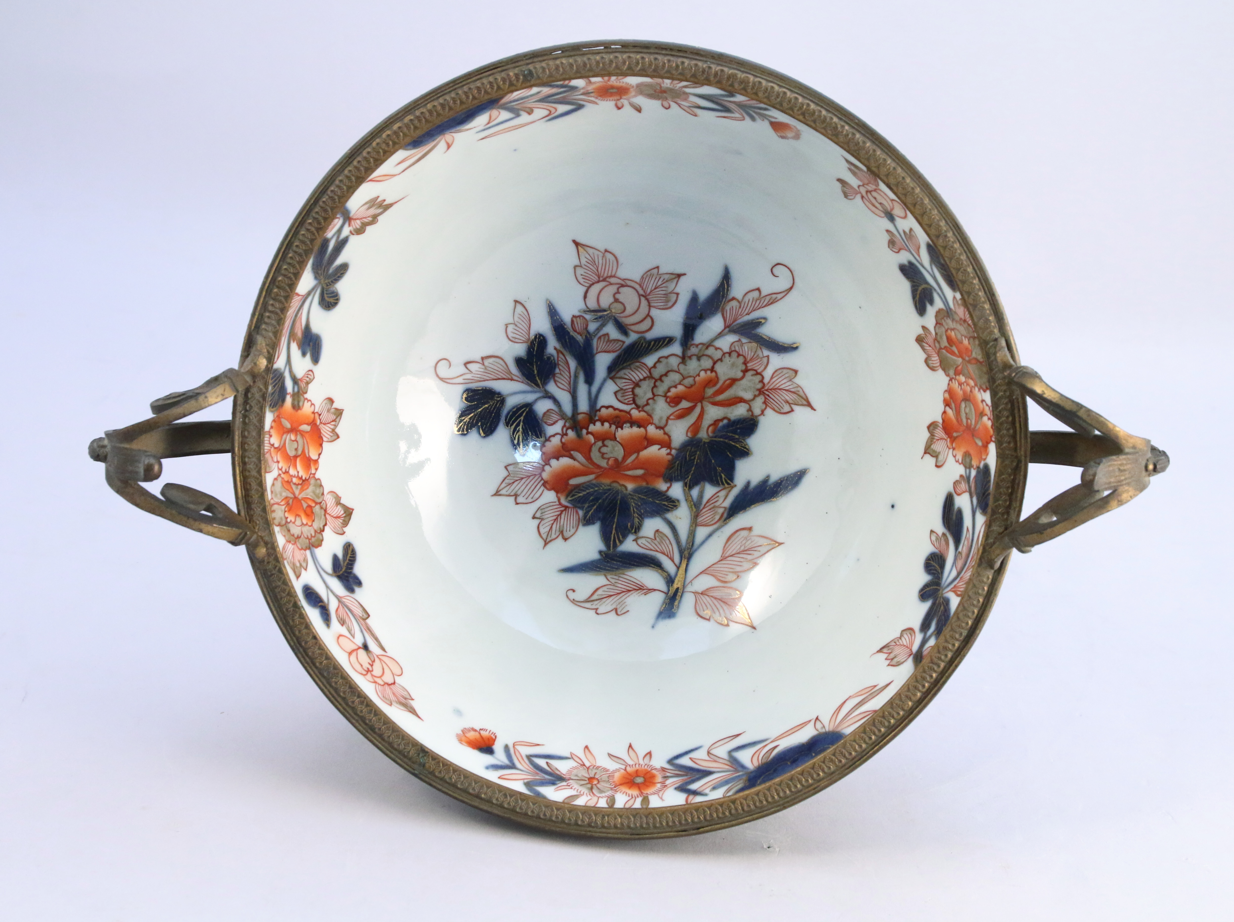en porcelaine à décor Imari. Riche monture de bronze ciselé et doré à décor. Anses latérales à enroulements, piédouche à cannelures et tore de laurier.