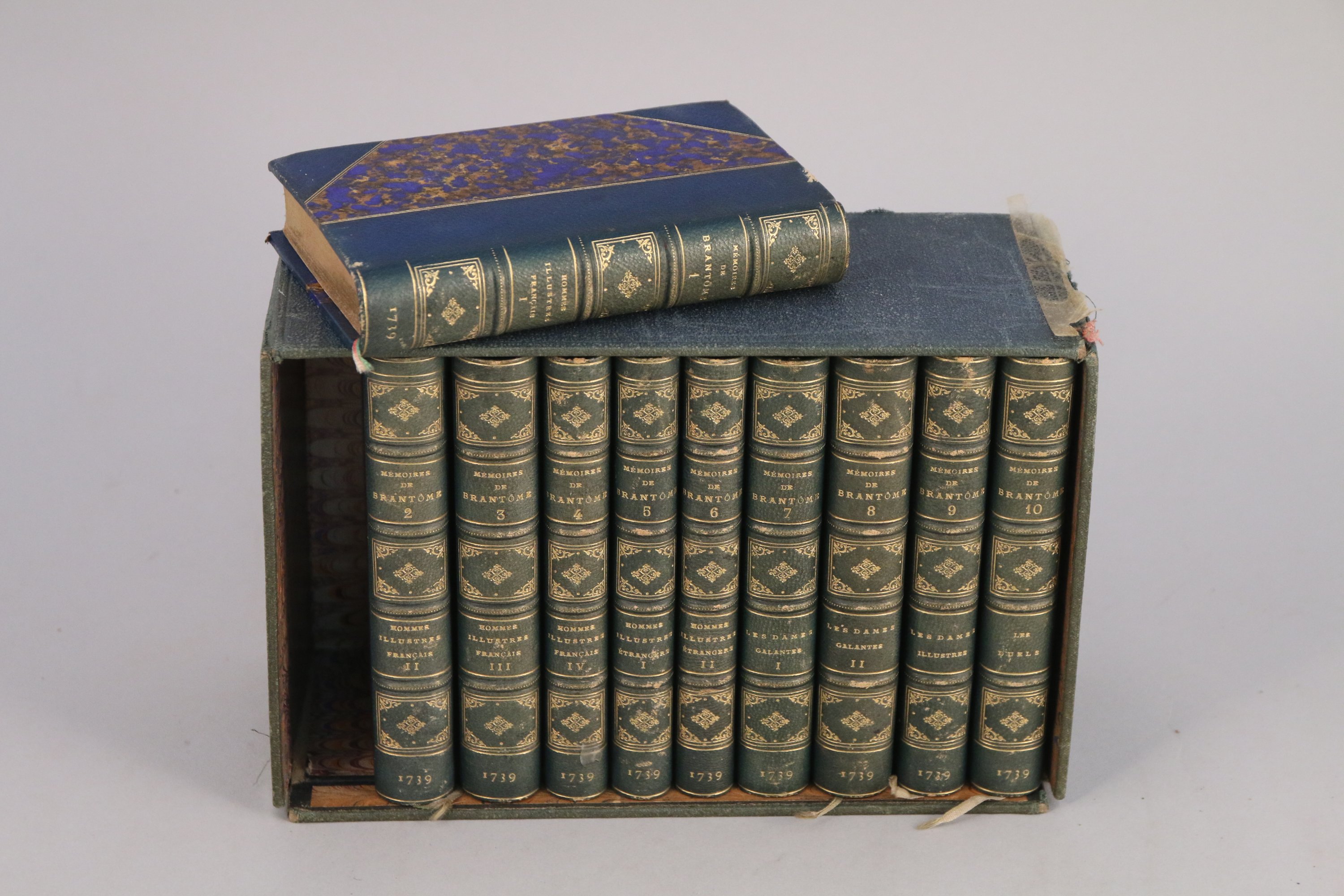 10 volumes in-16 demi maroquin bleu à coins, toutes tranches dorées. Reliure établie vers 1880. (Dos insolé).
