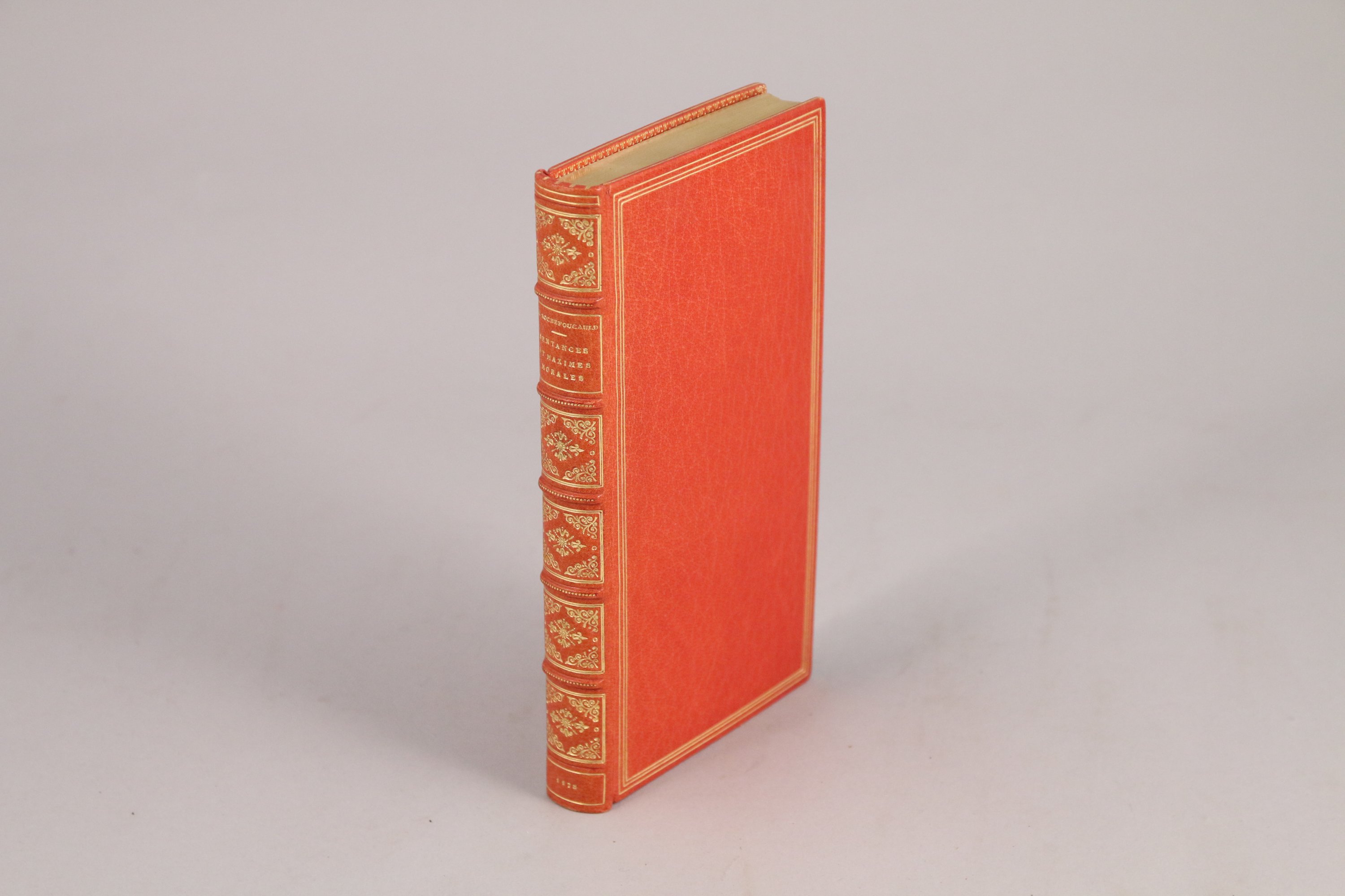 In-12, (4 feuillets, le premier étant blanc), 195 pages, (6 ff). Plein maroquin rose orangé, triple filet d'éncadrement, dos à nerfs richement orné dans les caissons, filet sur les coupes, large bordure intérieure composée de roulettes et de filets droits et aux