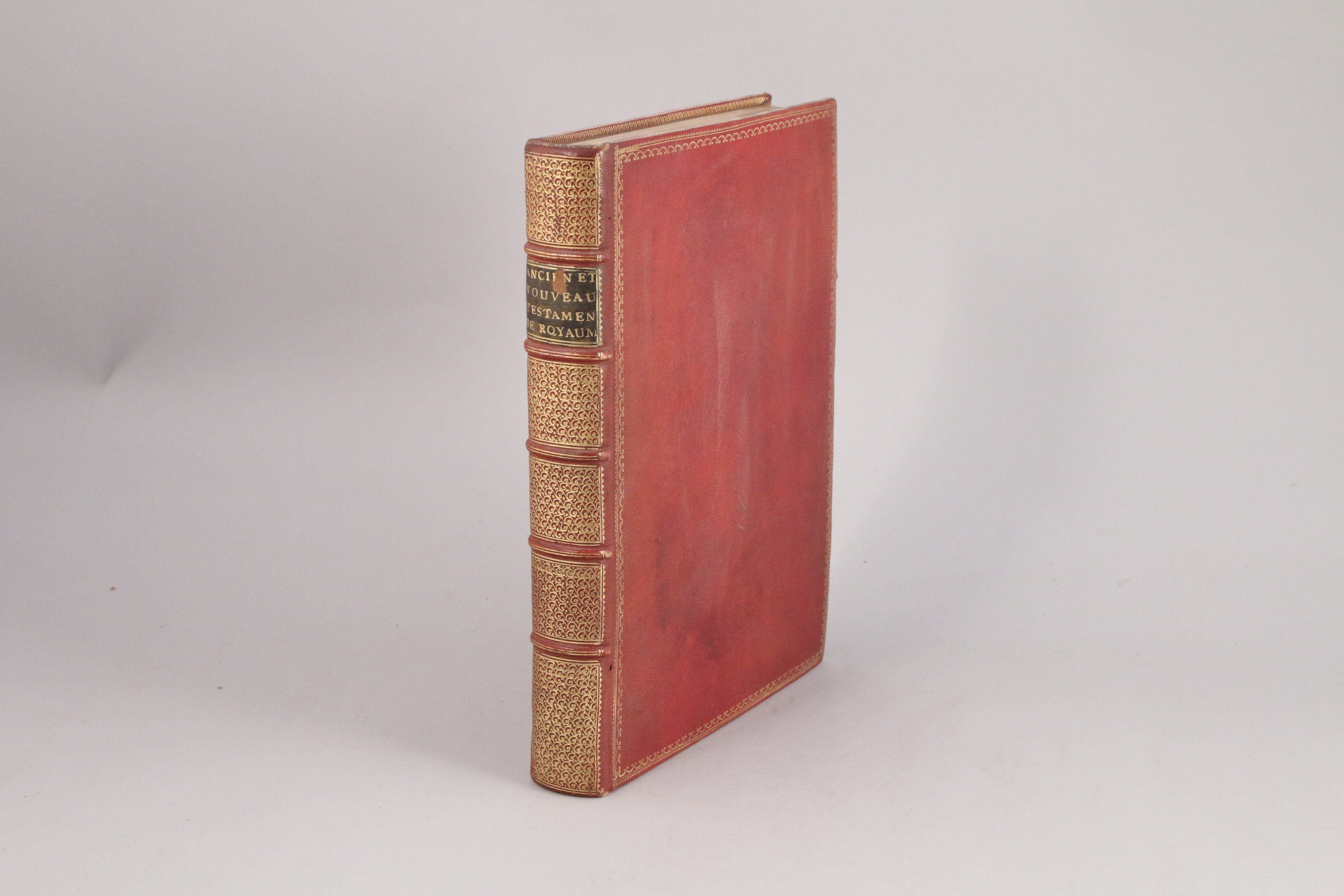 In-4° (285 X 210 mm), (6 ff), 546 pages, (1 f blanc). Plein maroquin rouge, deux encadrements de filets et un encadrement à la roulette ; dos très orné ; roulette sur les coupes et filet hâchuré intérieur. Toutes tranches dorées. Reliure du temps en belle condition. (Petit accroc à la pièce de titre ; deux piqures de ver sur le mors supérieur).