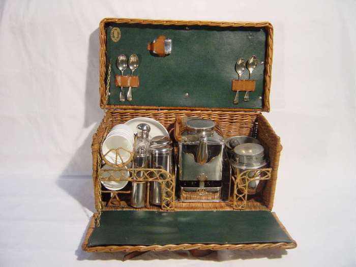 "TEA-CASE" en osier contenant: 4 tasses et leurs soucoupes en porcelaine blanche, flacon en verre, 4 petites cuillères, étui à briquet, 3 étuis cylindriques, réchaud, théière et récipient à infusion. Cachet avec inscription "Manufactured in London, England". Haut. 21, Long. 40,5, Larg. 21 cm.