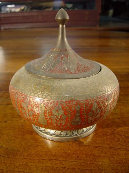 POT COUVERT, à panse sphérique, en métal rehaussé d'émail rouge et jaune. Décor répétitif de fleurs et d'arbustes. Marque d'atelier à la base.