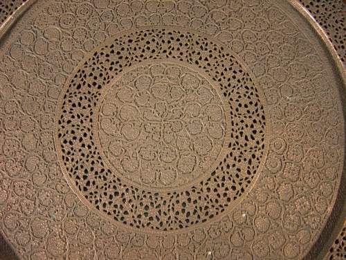 PLATEAU circulaire, en cuivre ciselé et ajouré, orné d'enroulements floraux.