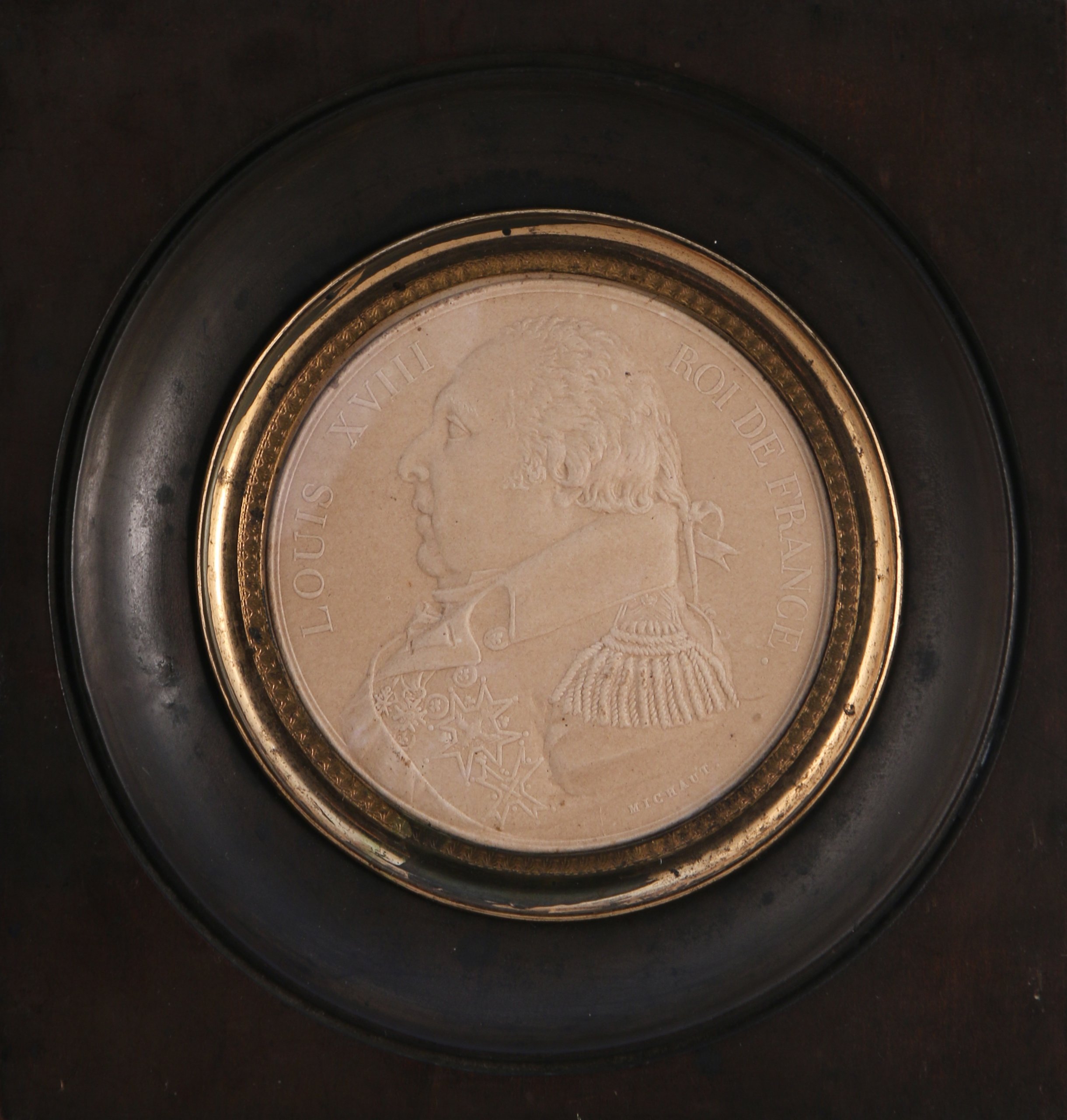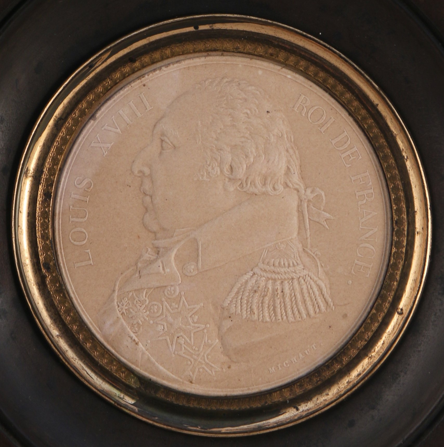 MINIATURE de forme ronde en papier gaufré figurant Louis XVIII en buste de profil d'après Auguste-François Michaut. Cerclage de laiton doré à frise feuillagée. Cadre en bois noirci de forme rectangulaire.