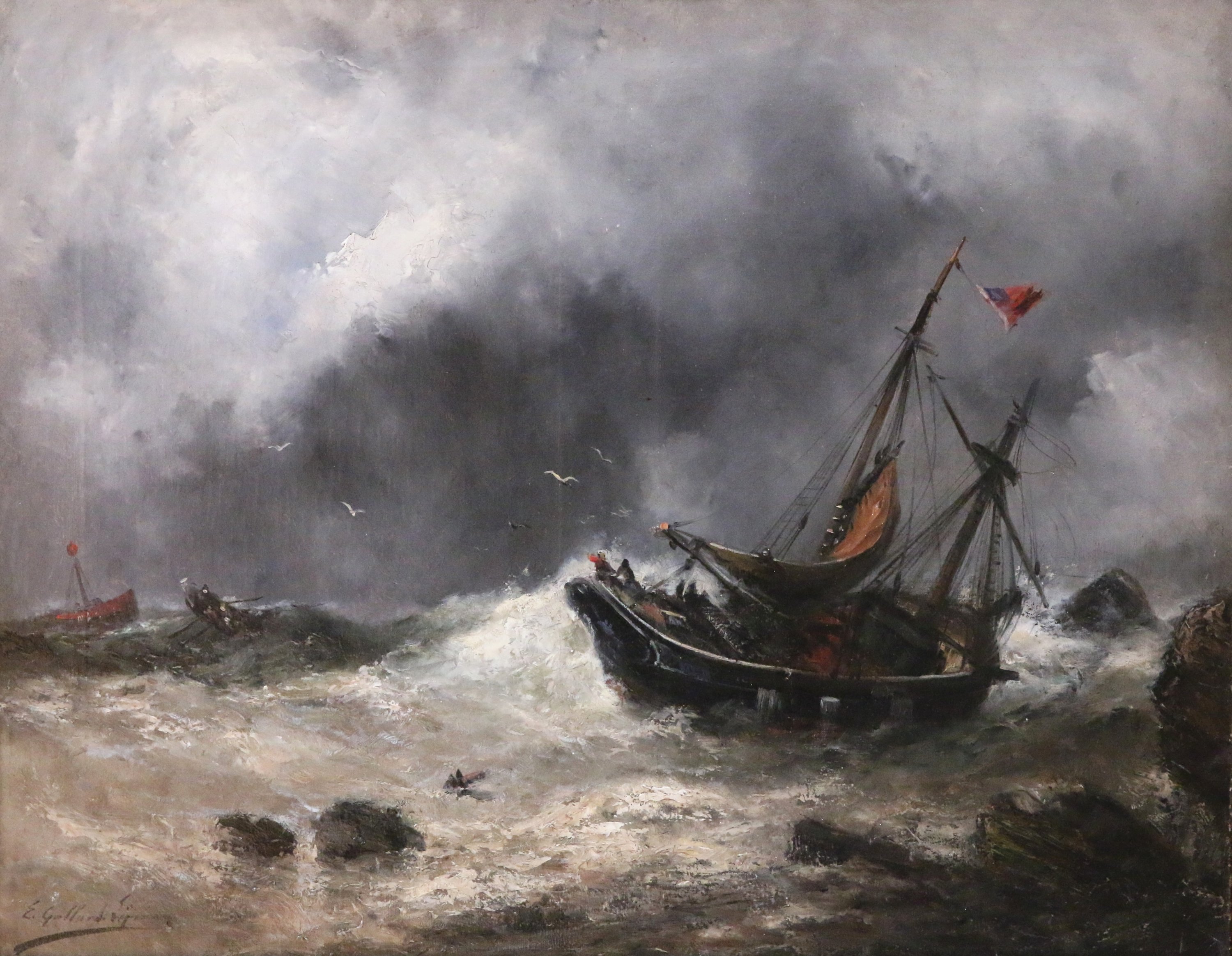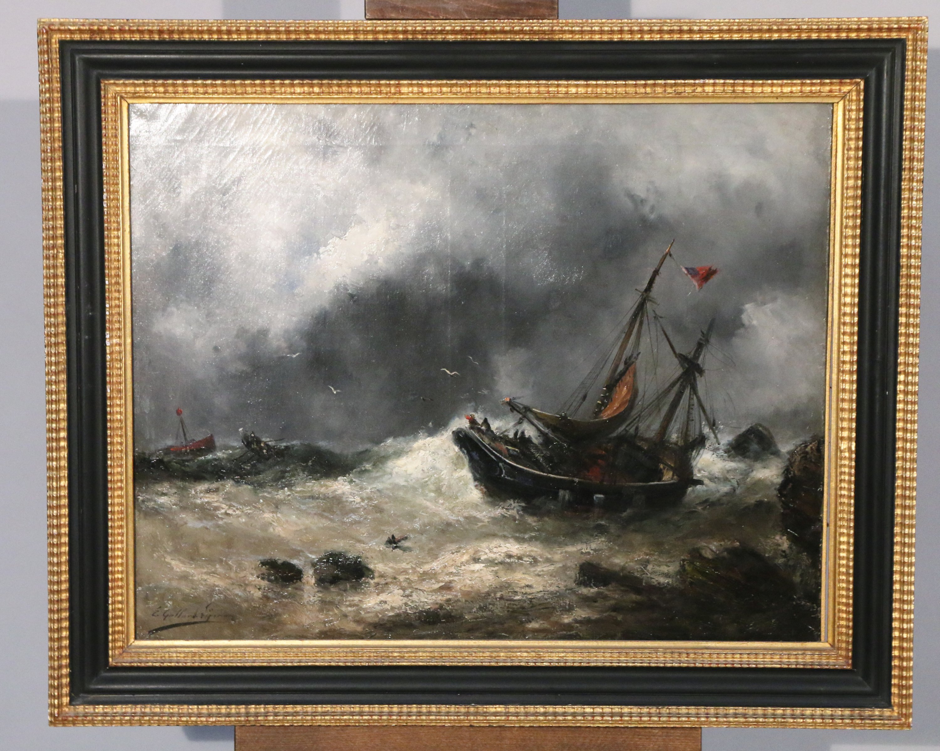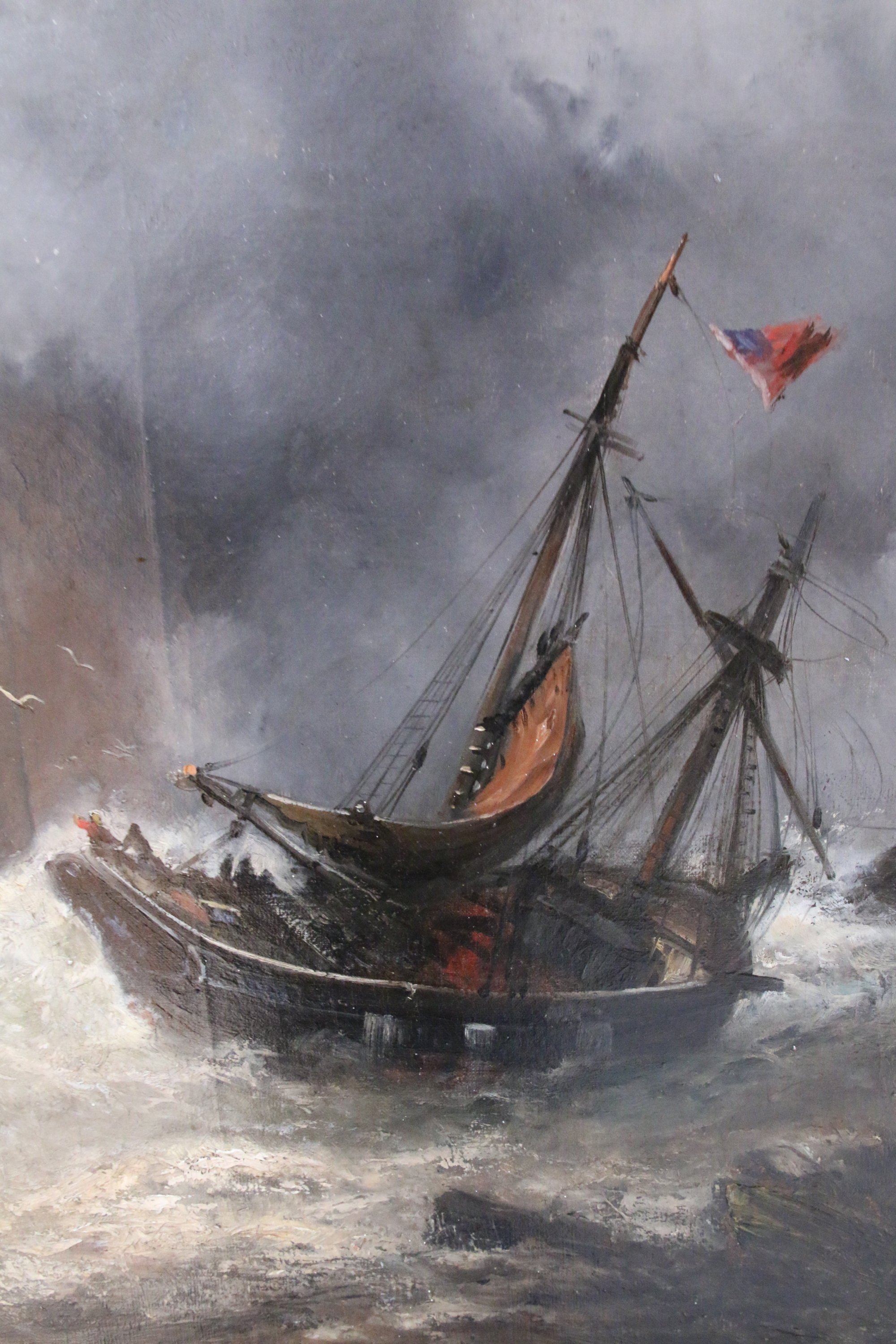 Élève de Claude Jacquand, Gallard-Lépinay expose au salon parisien dès 1864 comme peintre officiel de la marine. Sa peinture est marquée par une grande maitrise des effets de lumière, en témoigne ses vues de Venise, ses marines et plus particulièrement ses naufrages. L'uvre présentée, des navires pris dans la tempête près des récifs, allie les ténèbres du naufrage à venir avec l'espoir d'une accalmie figurée par une touche de bleu dans le ciel.