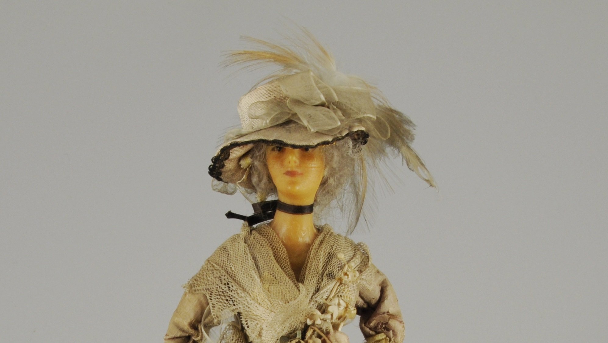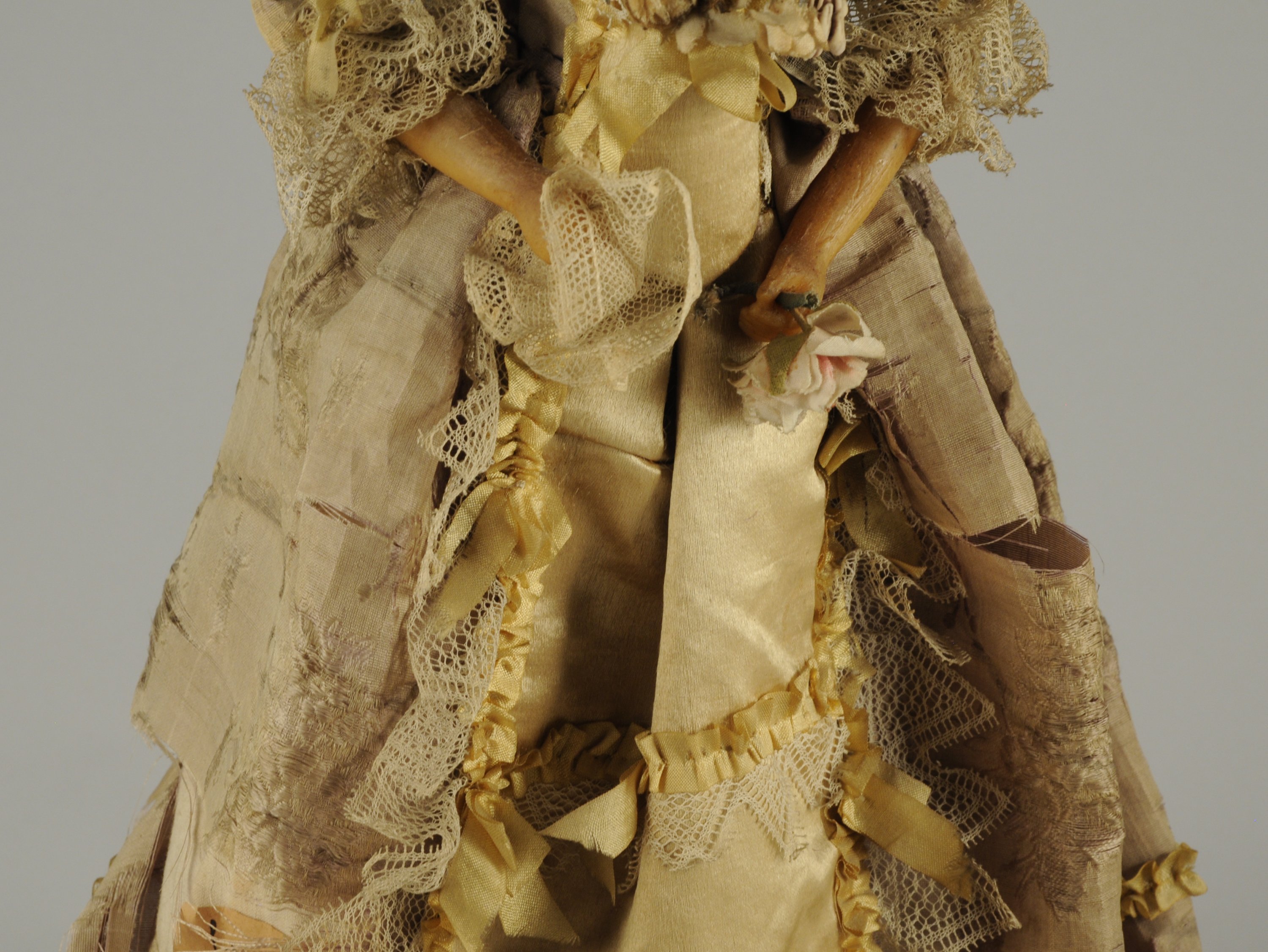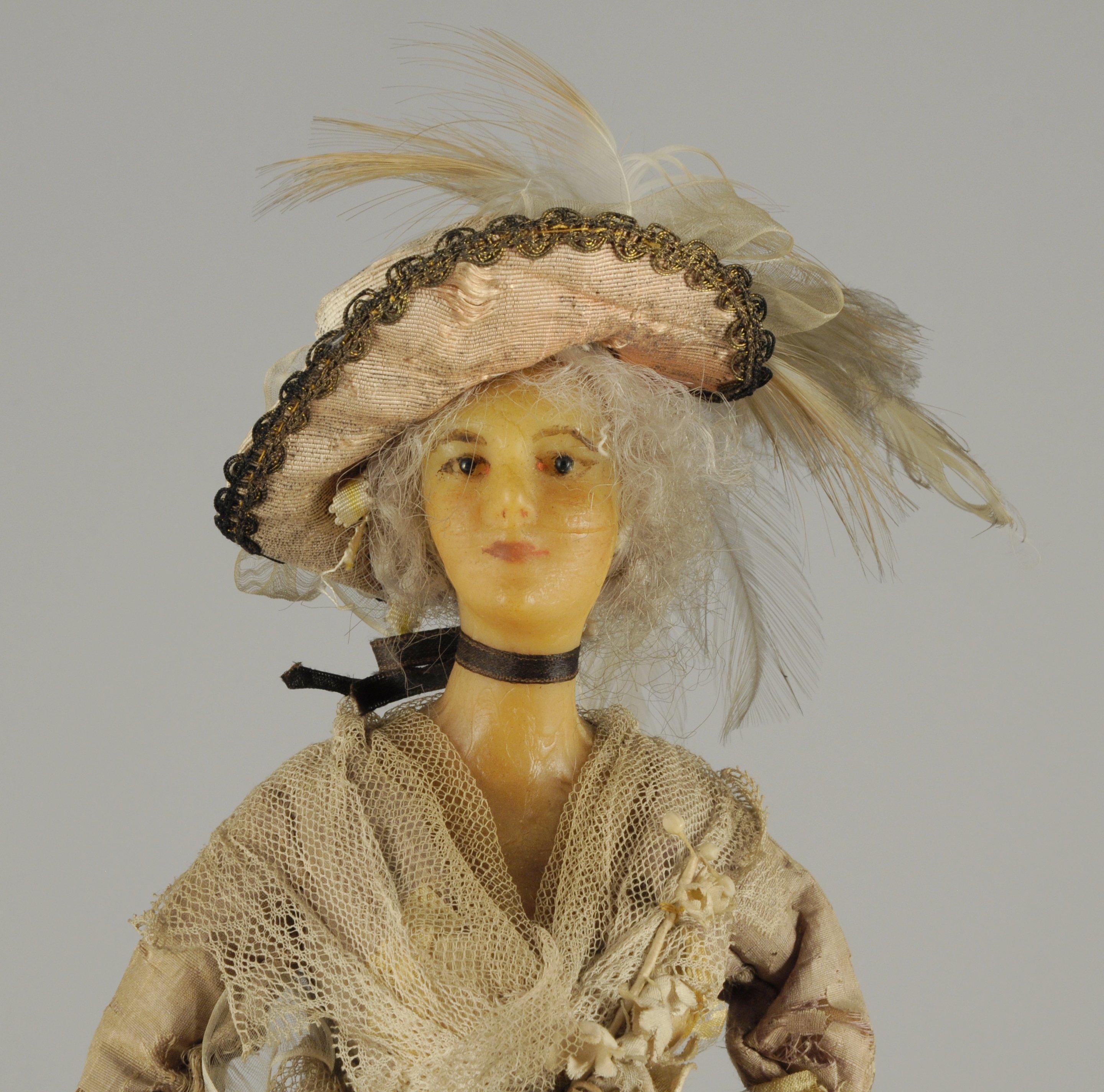 POUPÉE de mode avec buste et bras en cire. Cheveux gris naturel. Corps articulé en tissu bourré. Elle est vêtue d'une robe en dentelle et en soie jaune et beige agrémentée de fleurs et d'un chapeau à plumes dans le goût du XVIIIe siècle.