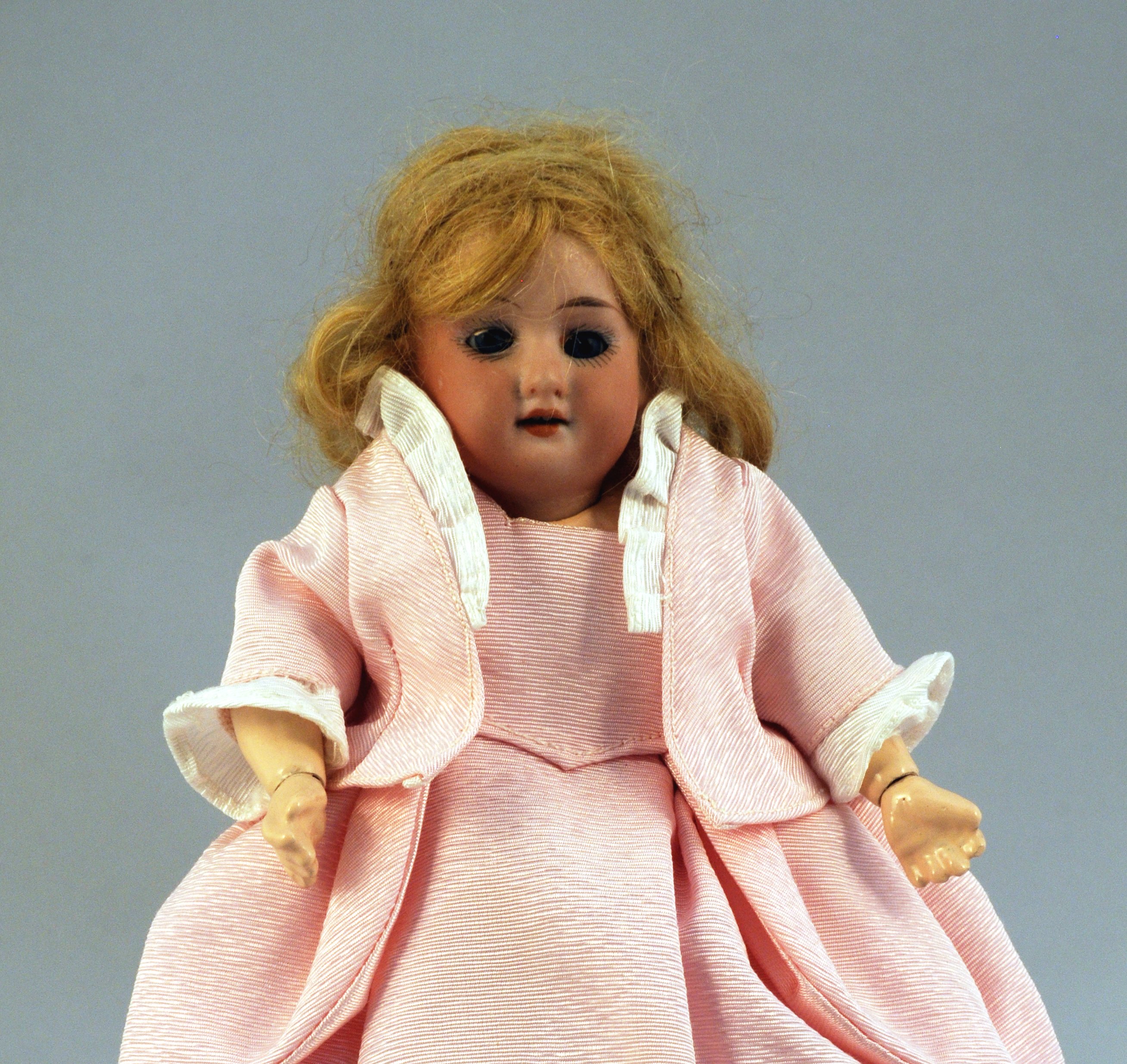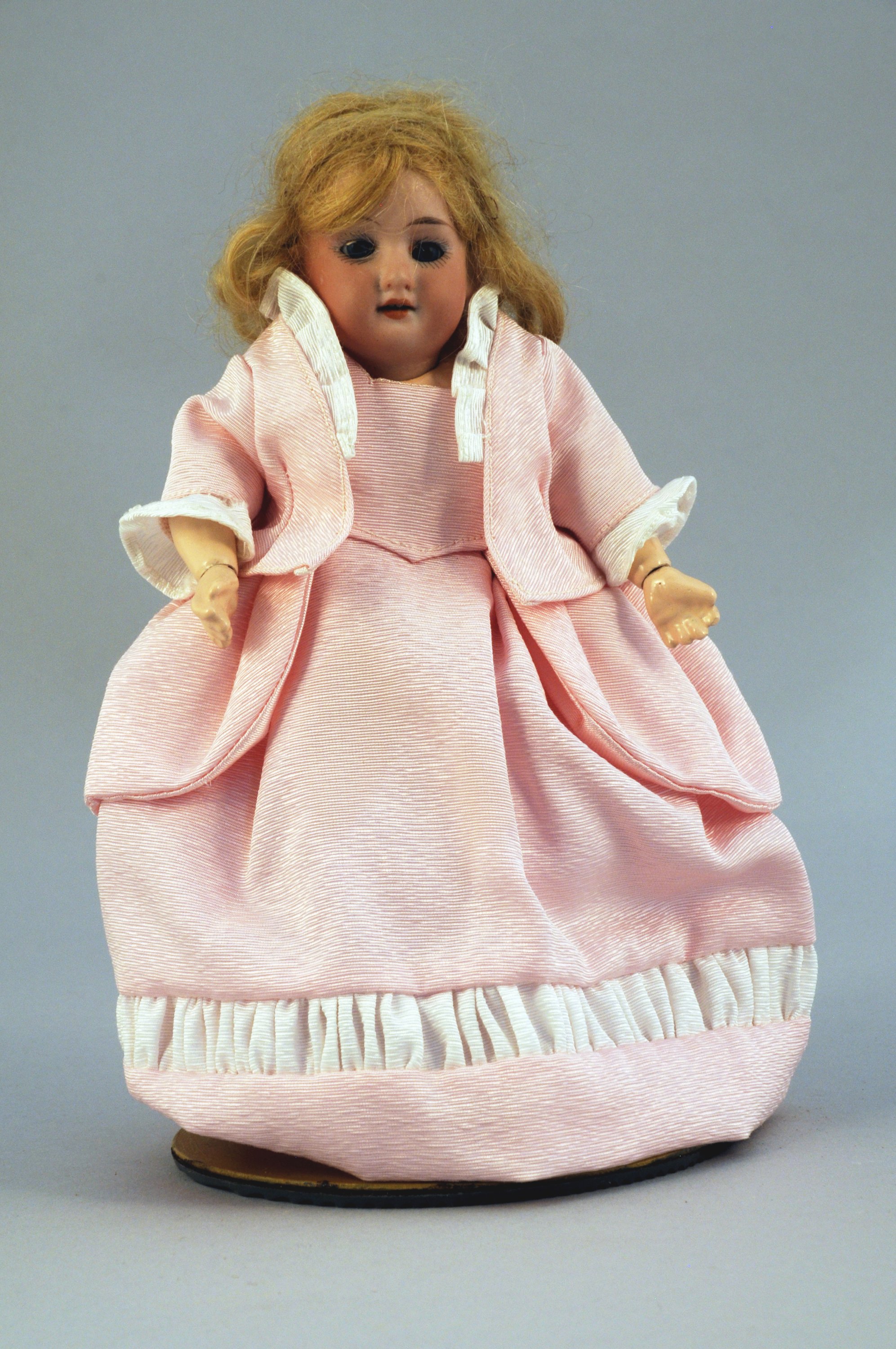 MIGNONETTE poupée articulée. Tête en porcelaine marquée "germaine (?) 1246 / 310", yeux bleux ouvrant, bouche ouverte. Cheveyx blonds. Corps articulé en carton. Avec son trousseau de cinq robes modernes et un support.
