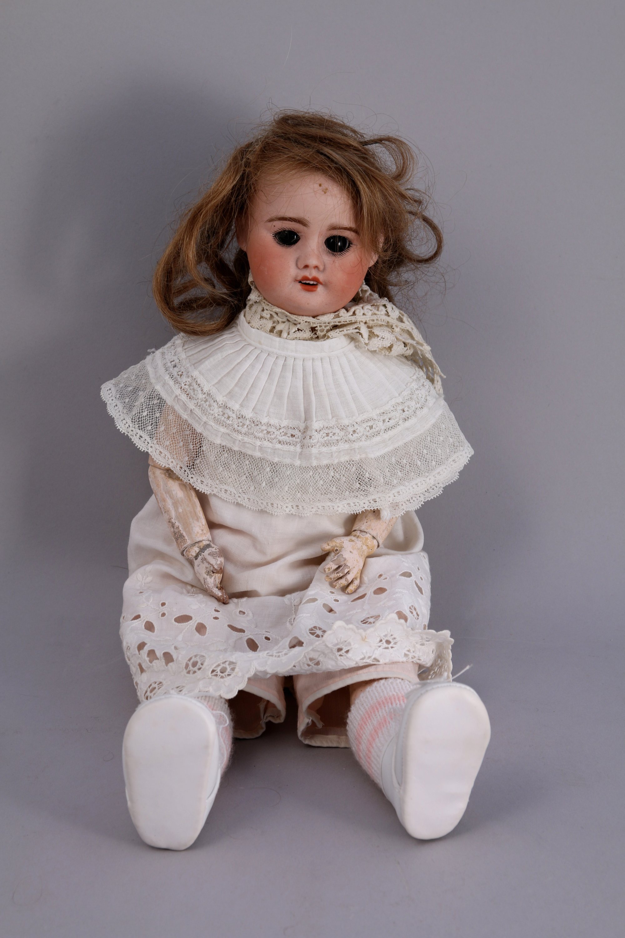 POUPÉE SFBJ, tête en porcelaine marquée en creux "SFBJ / 60 / Paris / -2/0-". Bouche ouverte avec dents en partie supérieure, yeux bleus dormeurs en sulfure. Corps en bois et carton bouilli laqué articulé. Habits, perruque (refixée).