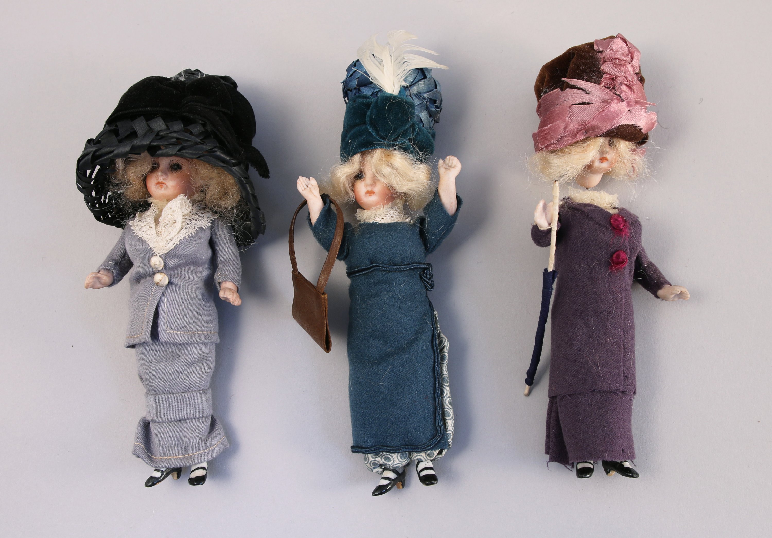 Trois MIGNONNETTES figurant trois femmes des années folles tout en biscuit. Les têtes signées 139, yeux bleus, la bouche fermée, coiffure blonde.