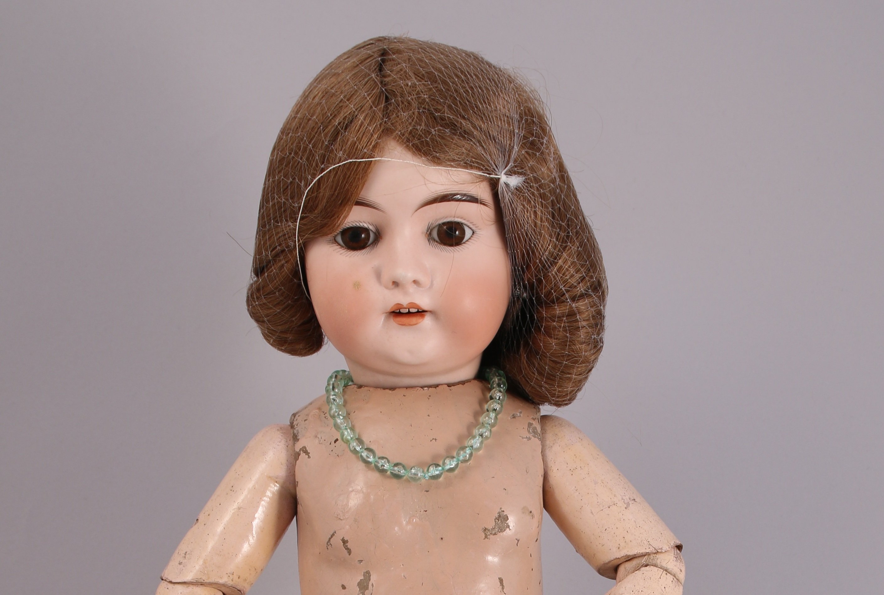 POUPÉE, tête en porcelaine marquée en creux "1250/4.". Bouche ouverte avec dents en partie supérieure, yeux bruns en sulfure, oreilles percées. Corps articulé en bois et carton bouilli laqué. Perruque rapportée.