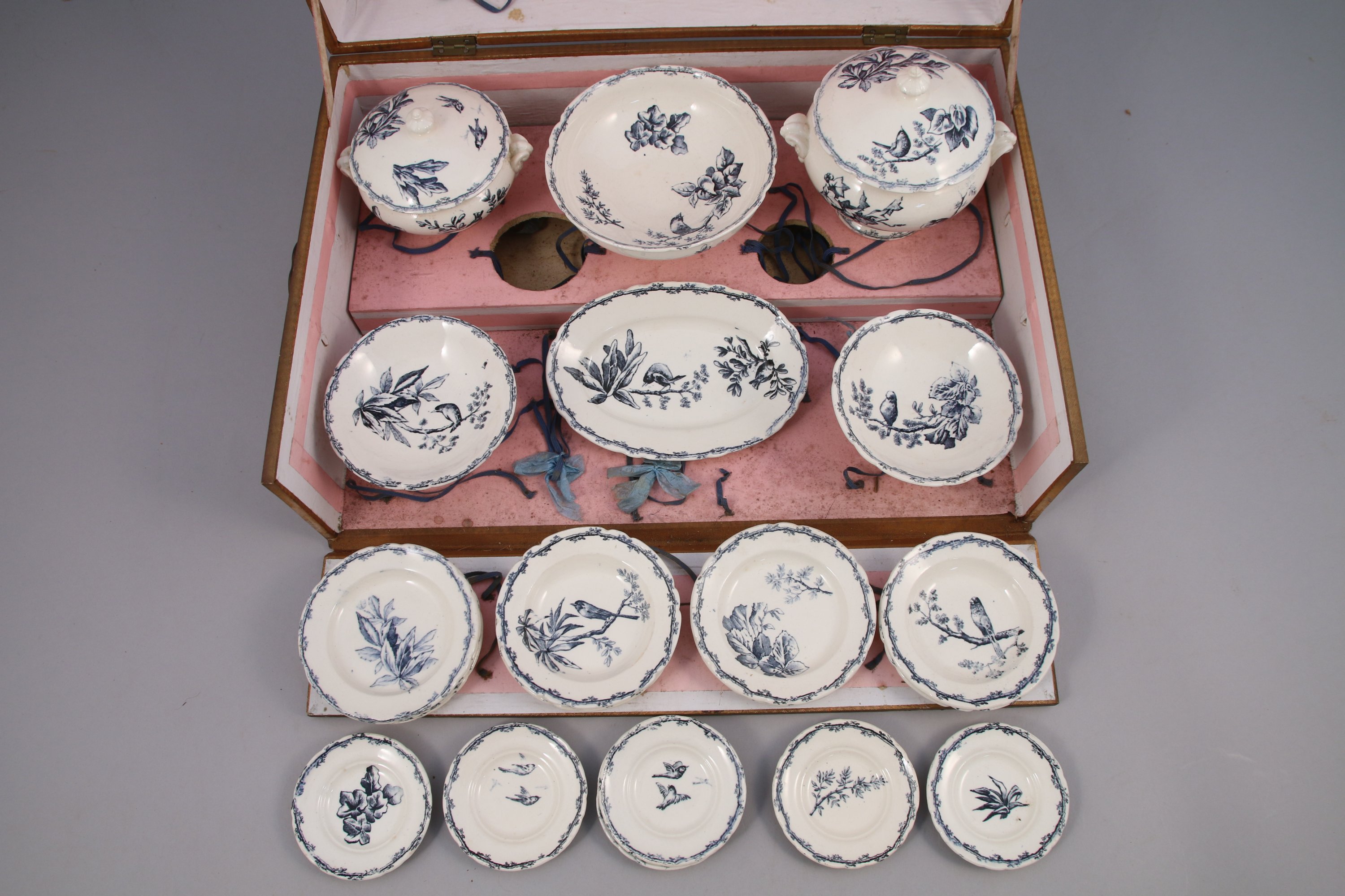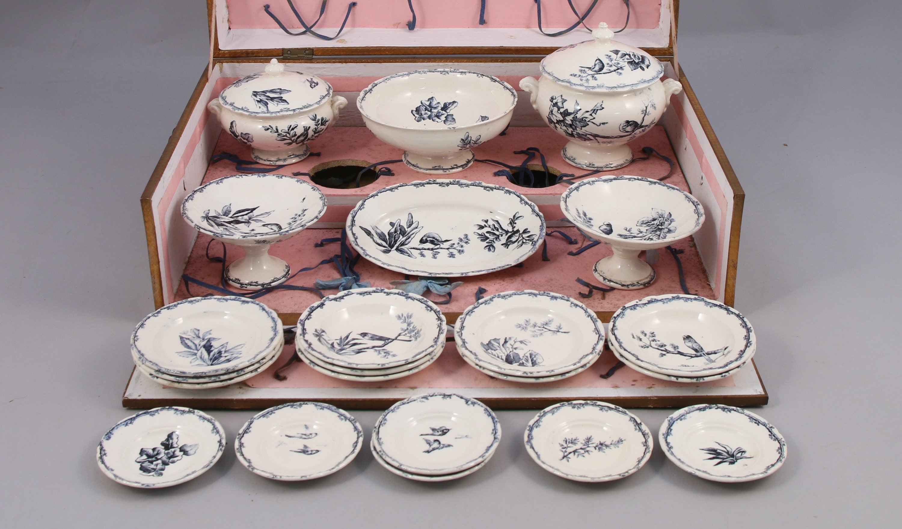 Belle DINETTE en faïence de Choisy-Le-Roi à décor d'oiseaux et feuillages comprenant vingt- deux pièces: dix assiettes plates, six assiettes à dessert, une grande soupière, une petite soupière, deux compotiers, un saladier et un plat oblong.