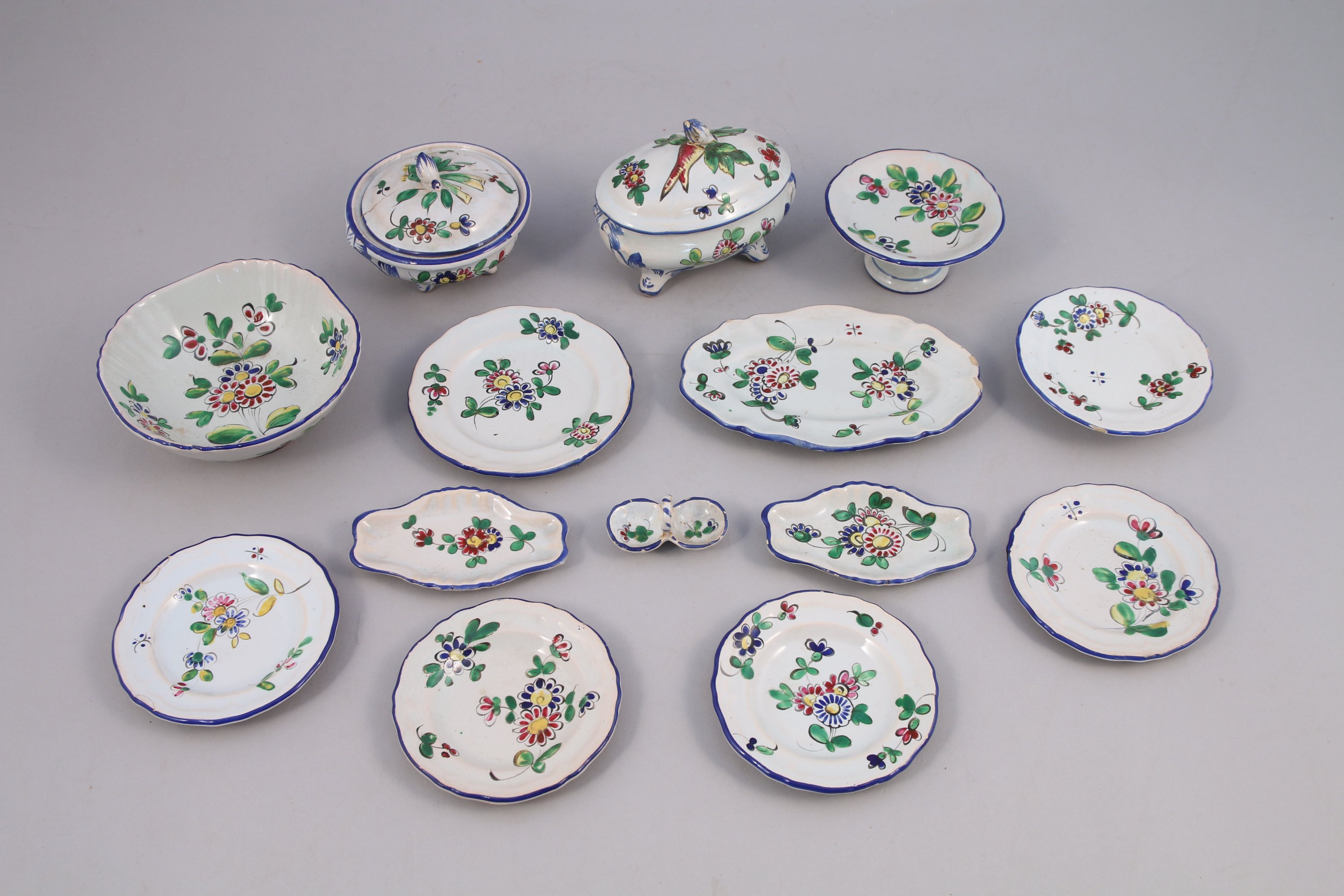 DINETTE en faïence à décor de fleurs comprenant quatorze pièces: une soupière (couvercle accidenté), une terrine, un saladier, un compotier, un grand plat oblong, deux plats, un saleron, quatre assiettes, un plat circulaire, un plat à gâteau.