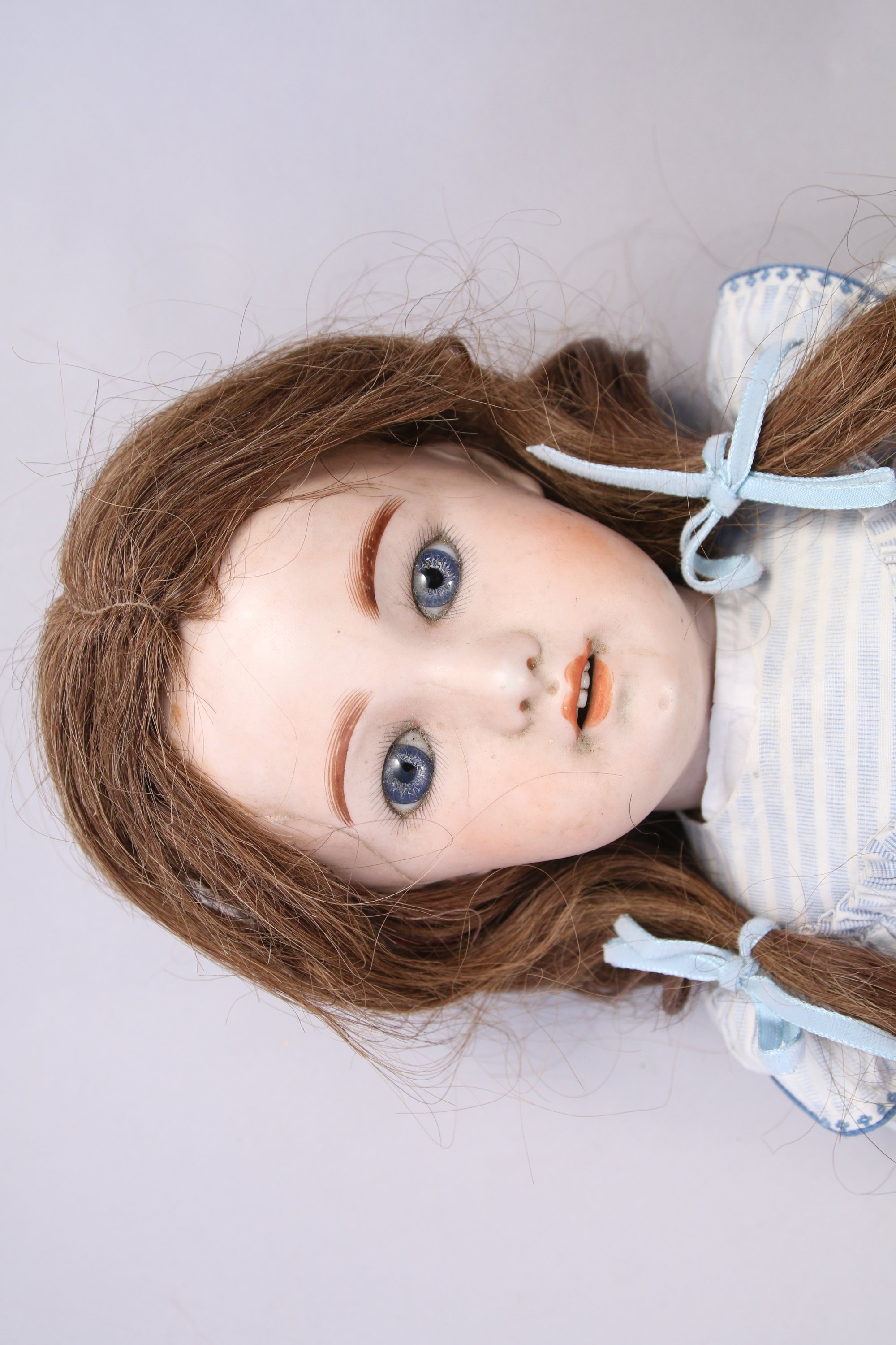 SFBJ JUMEAU, Paris. POUPÉE modèle 230, la tête jumeau en biscuit, les yeux bleus fixes, la bouche ouverte découvrant des dents en partie supérieure, les oreilles percées.Perruque aux cheveux châtains. Habillée d'une robe à colerette bleue à rayures blanches et chaussures vernies noires. Corps en composition.