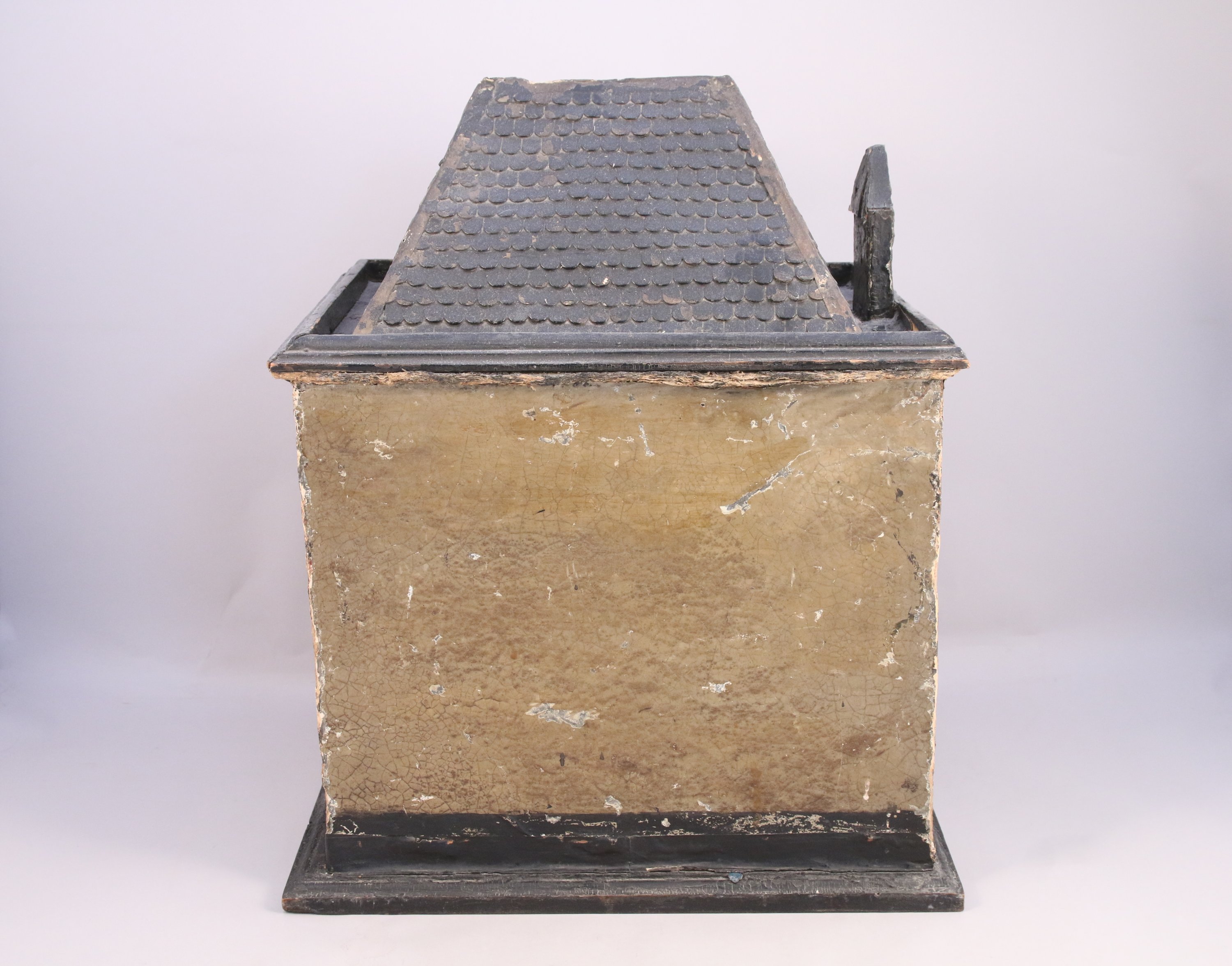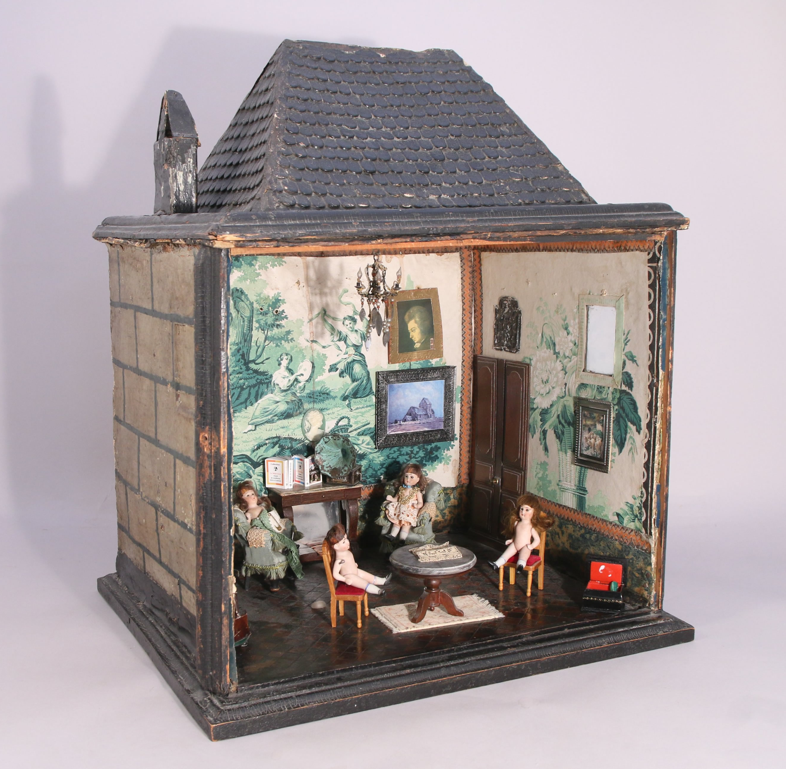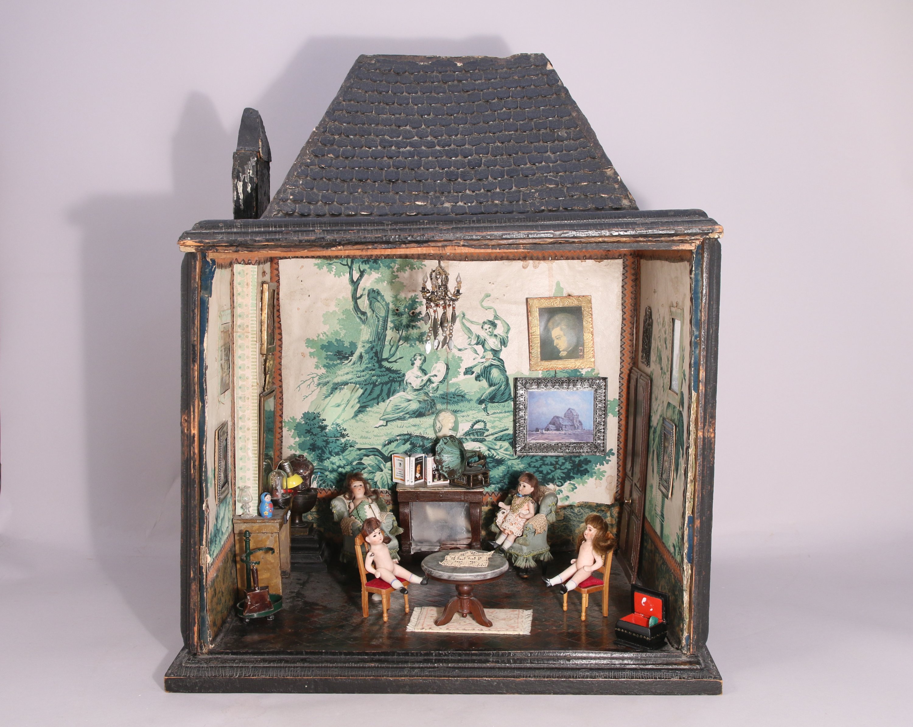 MAISON DE POUPÉE en carton et bois peint en noir et QUATRE MIGNONETTES