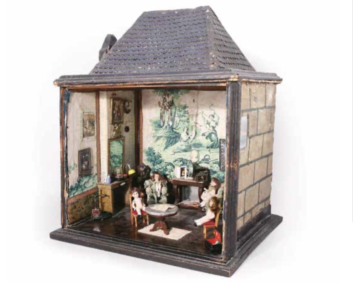 Bel ameublement miniature, comprenant une paire de chaises Directoire en bois, une paire de chauffeuses Napoélon III aux pieds en bois l'assise garnie de tissus, un guéridon et une console foncée d'une glace de style Restauration en bois recouvert d'un dessous imitant un marbre gris Sainte-Anne, un gramophone en métal, un nécessaire de cheminé en métal peint en vert avec sa pelle, deux plaques de cheminée en aluminium renforcé de plâtre, un piedestal en bois supportant une urne en laiton et un pot en marbre, un miroir au fronton historié, un cor de chasse, trois livres miniatures, une lampe moderniste, un lustre à pampilles, divers bibelots dont un vase, une poupée russe et un coffret.