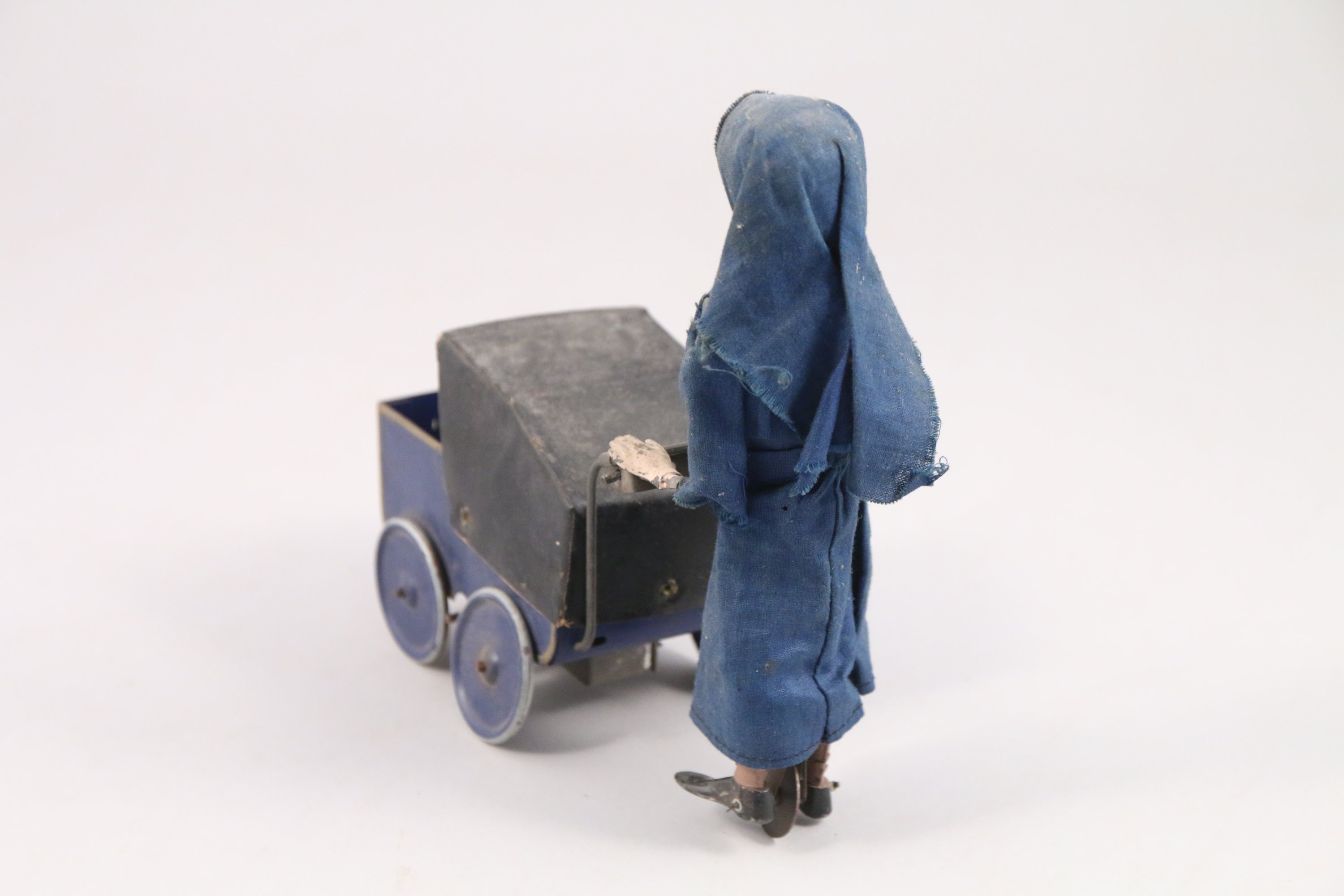 Landau en tôle peinte en bleu, capote en carton, personnage articulé en tôle peinte.