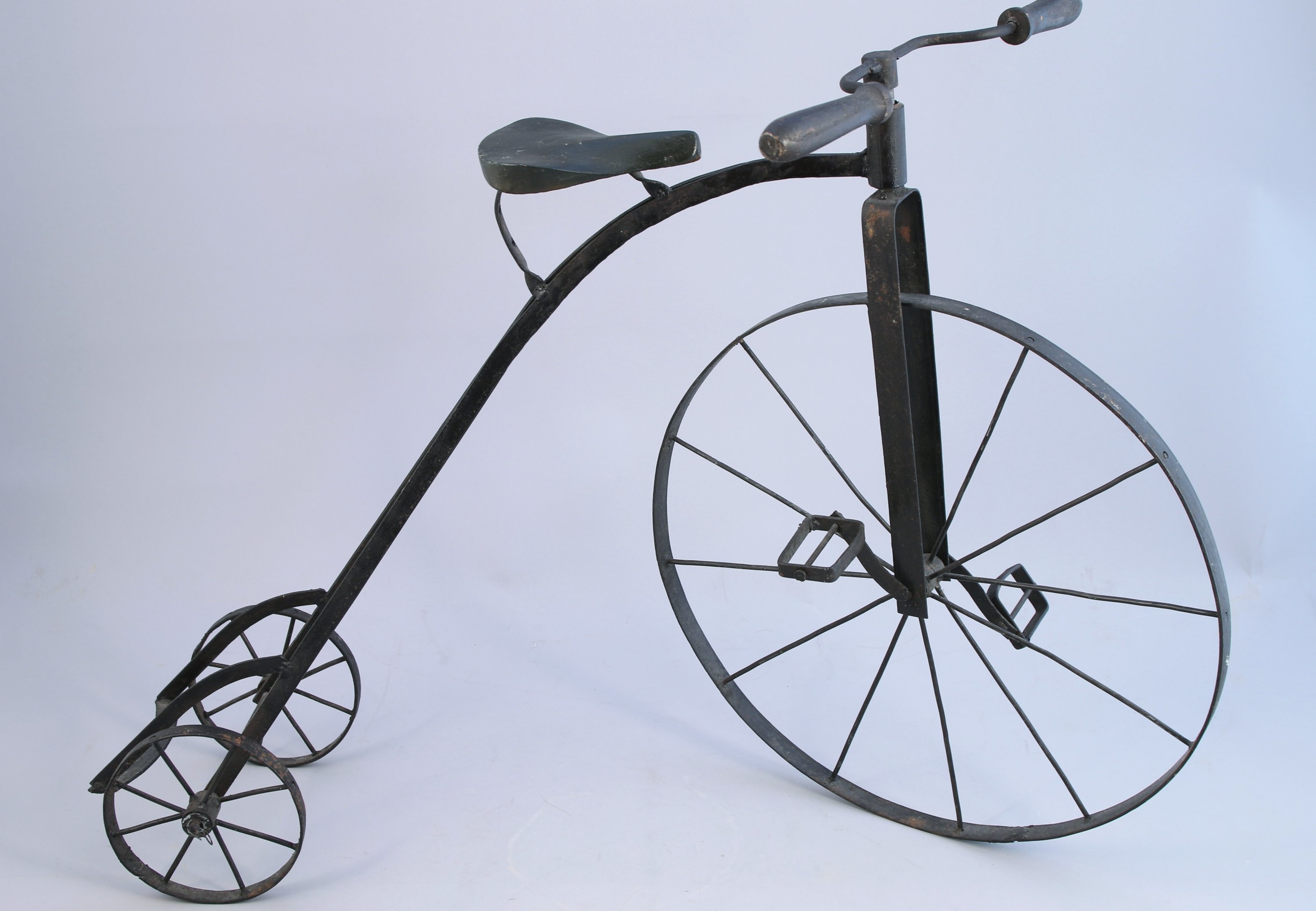 GRAND BI D'ENFANT en fer plat et rond soudé et laqué noir. Poignées et selle en bois. Deux petites roues à l'arrière.