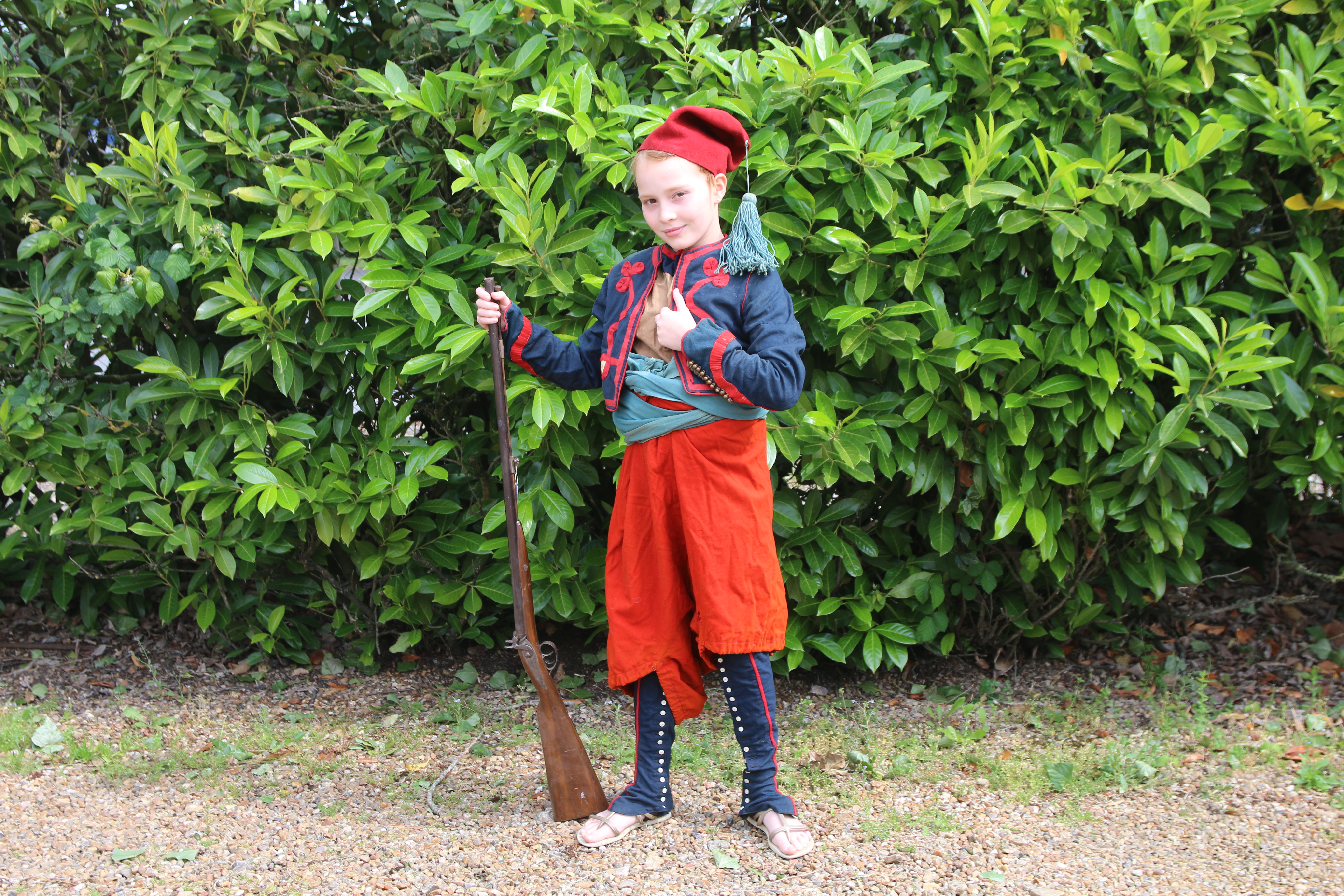 UNIFORME de ZOUAVE vraissemblablement pour enfant de troupe composé de neuf pièces dont une veste-boléro dite " bédaïa " bleue et rouge, un gilet algérien au col bleu et rouge, un pantalon sarouel en drap écarlate, une paire de guêtres bleues à liserés rouges et boutons nacrés, une paire de gants bruns, une chéchia en feutre rouge et son gland et une ceinture de laine.